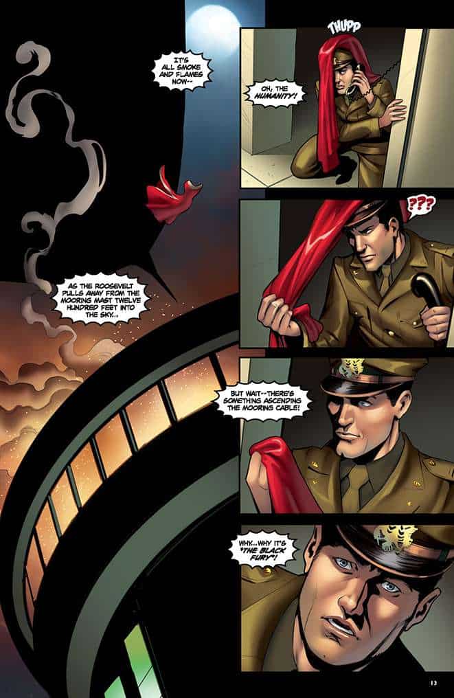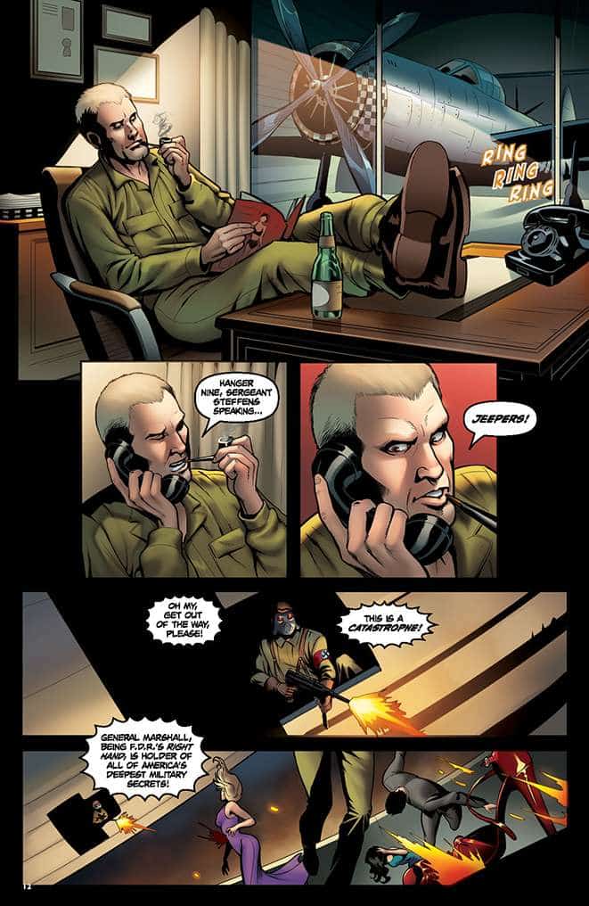 Miss Fury #5 is an action comic that’s 90% fight, 5% sage wisdom with a side of spirit animal and, 5% set up. In this issue, Corinna Bechko has the 1940’s superhero trying to right some wrongs and turn the tide to save the world.