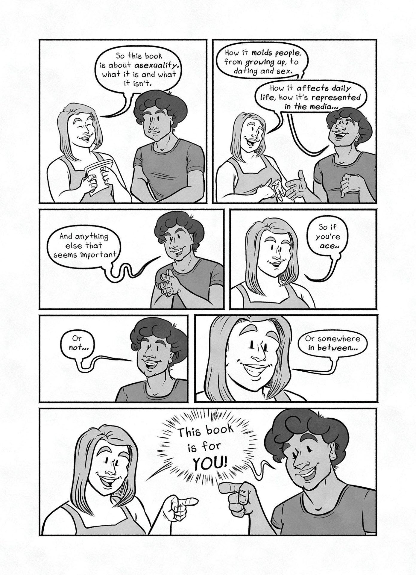 Asexuality is often called the “invisible orientation.” You don’t learn about it in school, and you don’t hear “ace” on television. So it’s kinda hard to be ace in a society so steeped in sex that no one knows you exist. Too many young people grow up believing that their lack of sexual desire means they are broken, so writer Molly Muldoon and cartoonist Will Hernandez–both in the ace community–are here to shed light on society’s misconceptions of asexuality and what being ace is really like. This book is for anyone who wants to learn about asexuality, and for ace people themselves to validate their experiences.