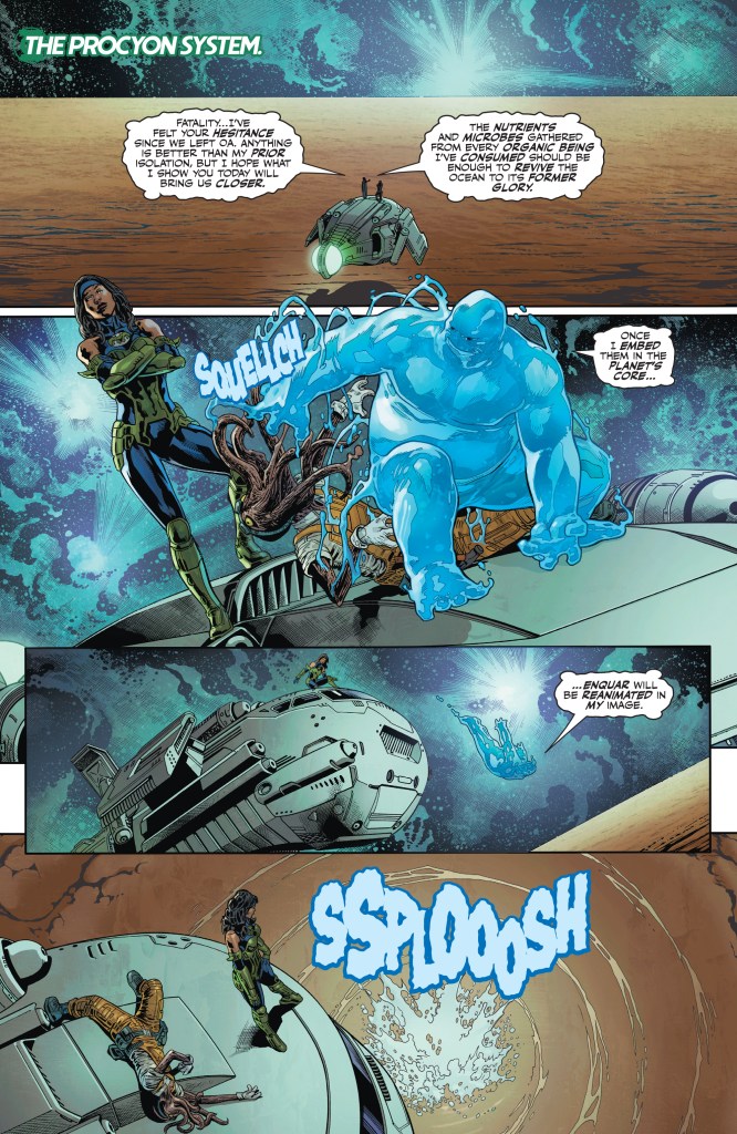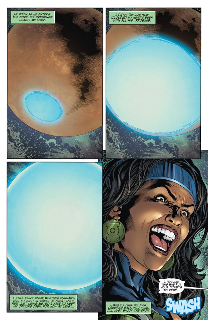 Settling into being a Green Lantern again, John ventures to Mogo to retrieve another escaped sciencell prisoner, putting him face-to-face with Ellie, whom he’s been avoiding. Meanwhile Keli, Aya, Vexar’u, and Narf’s training on energy-twin projection is interrupted by a Red Lantern/Yellow Lantern dispute in the middle of Malaqyte!