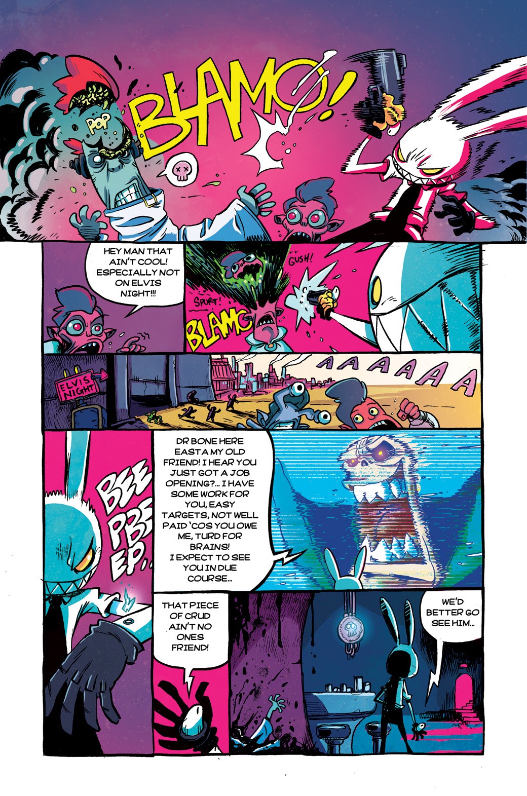 2nd printing! The gloriously demented mind of Kit Wallis brings the galactic adventures of the third best assassin in the universe to Scout Comics! Incredible, kinetically charged artwork blasts the blood, mayhem and quirky humor directly through your brain like a high-caliber bullet. In this issue, it’s Elvis night at an interstellar backwater bar, but with all due respect to the King, that doesn’t stop Mr. Easta. With the help of Frank, his teleportation parasite, who can also transform into any handheld weapon imaginable, it’s business as usual.