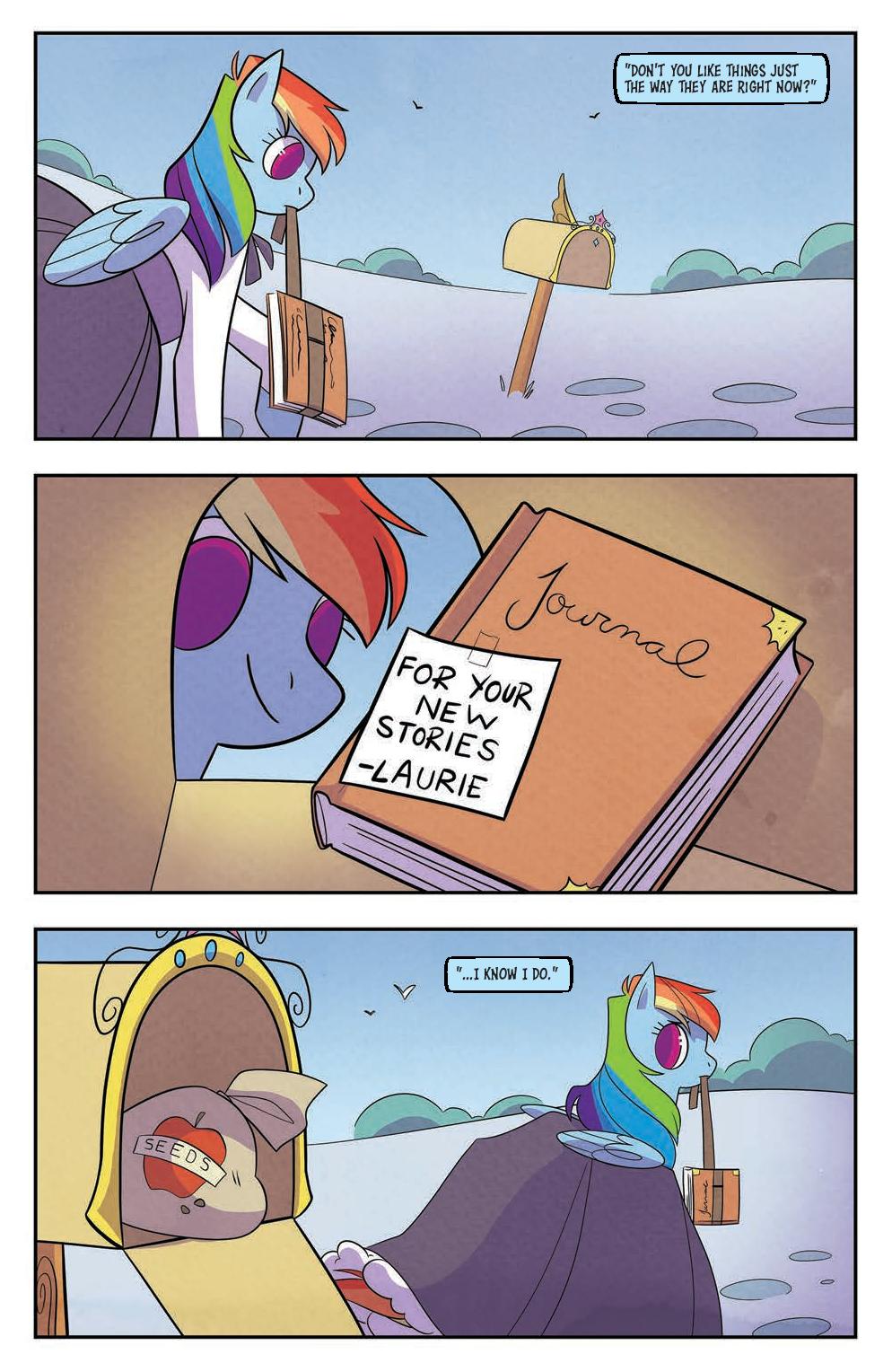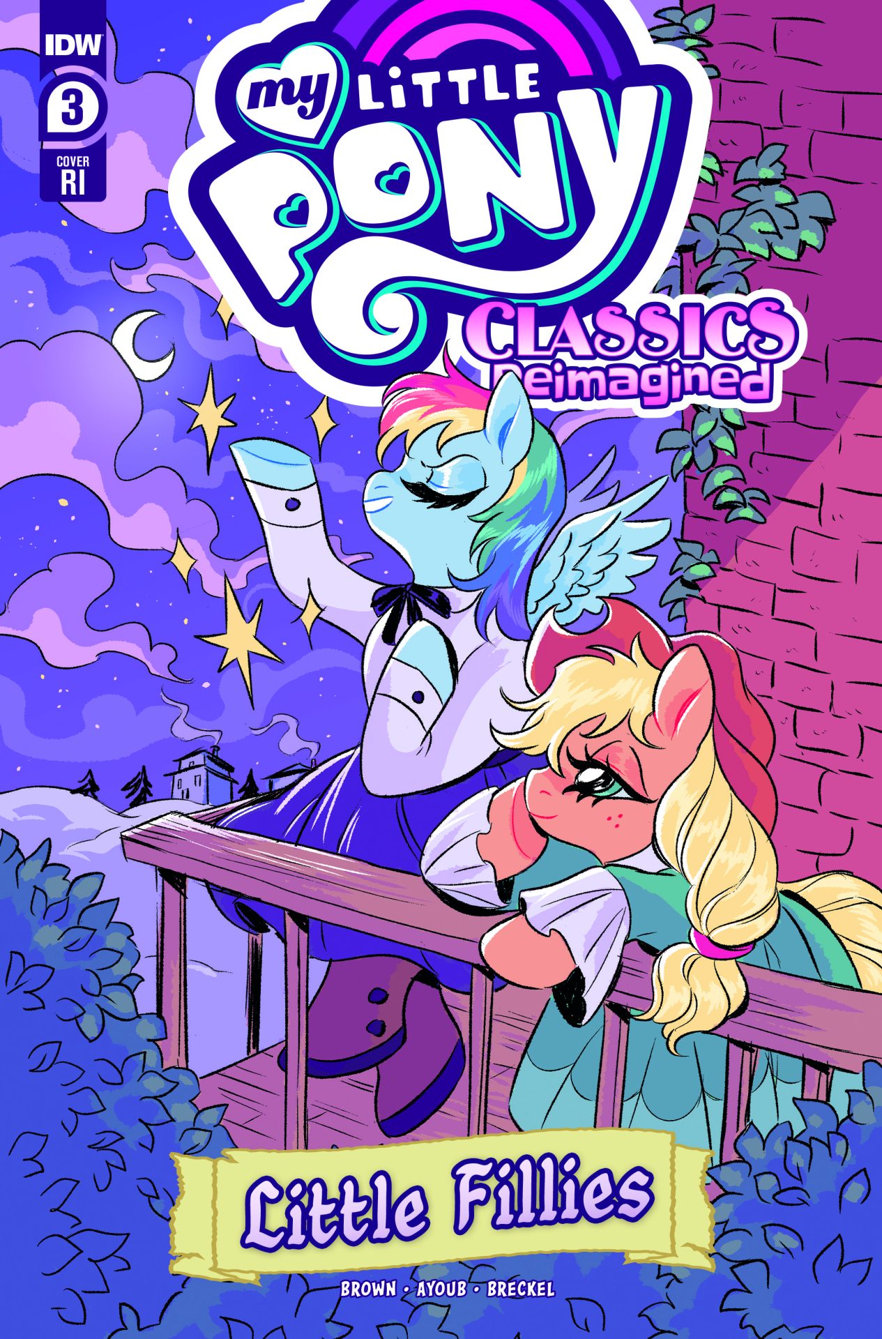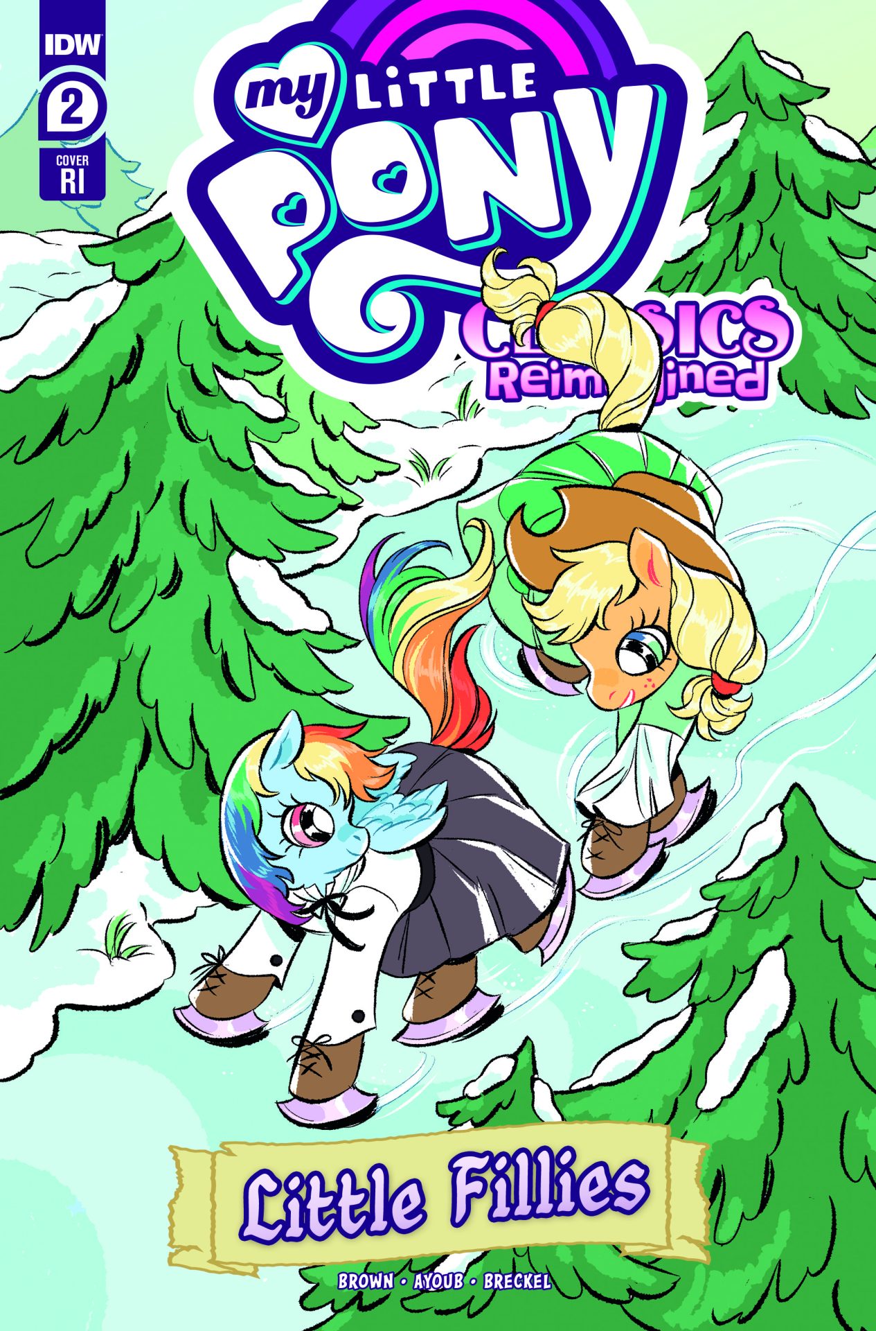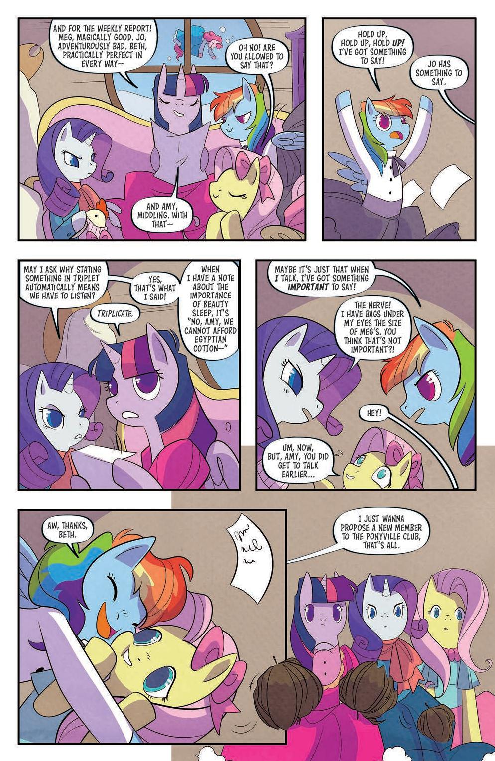 My Little Pony: Classics Reimagined—Little Fillies, written by Megan Brown, illustrated by Jenna Ayoub, and colored by Heather Breckel, is a new series about love, life, and sisterhood. Rainbow Dash, Twilight Sparkle, Fluttershy, and Rarity take on the roles of the March sisters, dreaming of life beyond Broncord, Massahoofetts. Rainbow Dash in particular yearns for excitement—something to write about. So when Applejack, the Marches’ neighbor, arrives home with tales of eel-wrangling and apple-eating, Rainbow Dash and her sisters dare to hope for more.