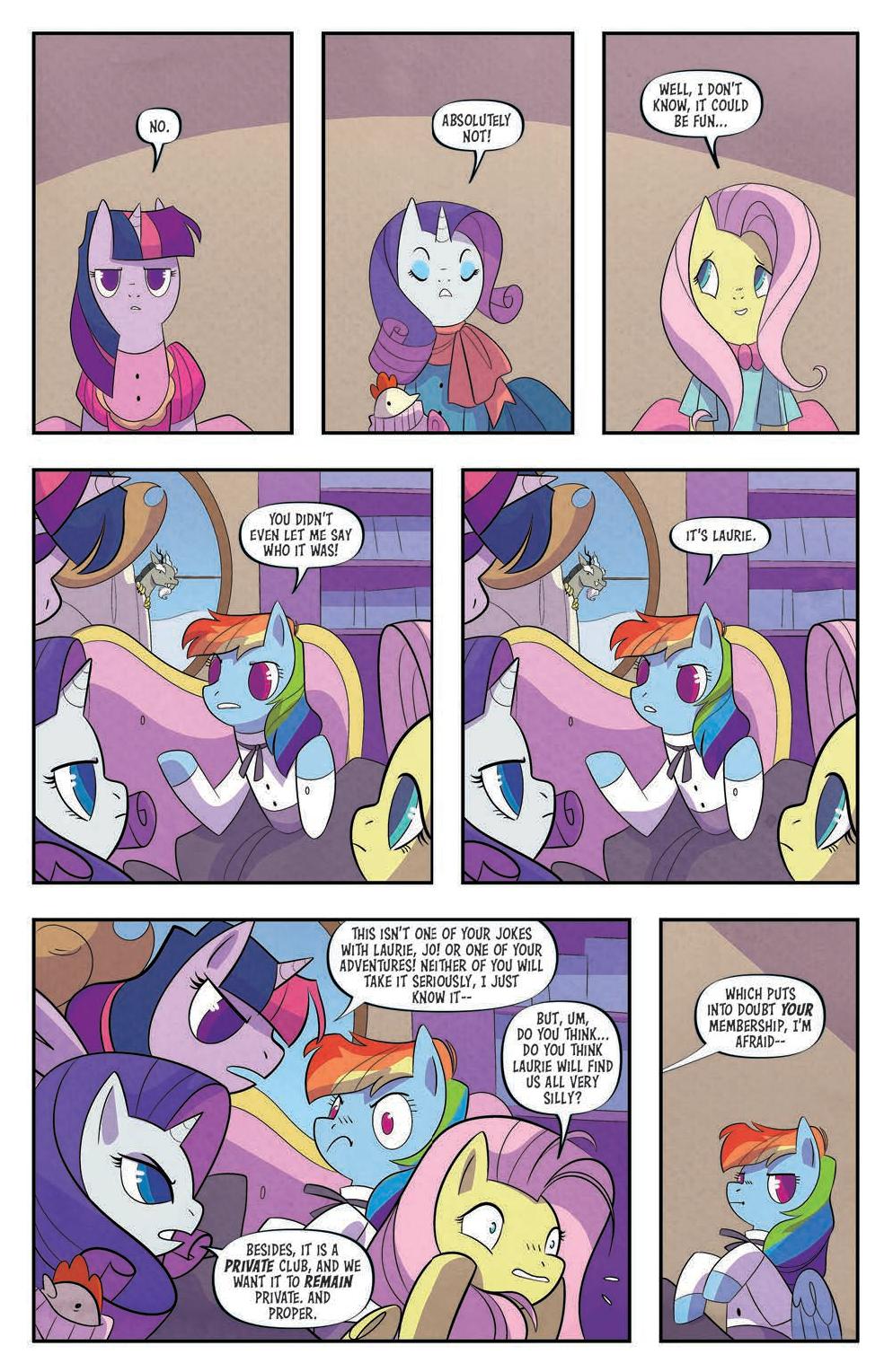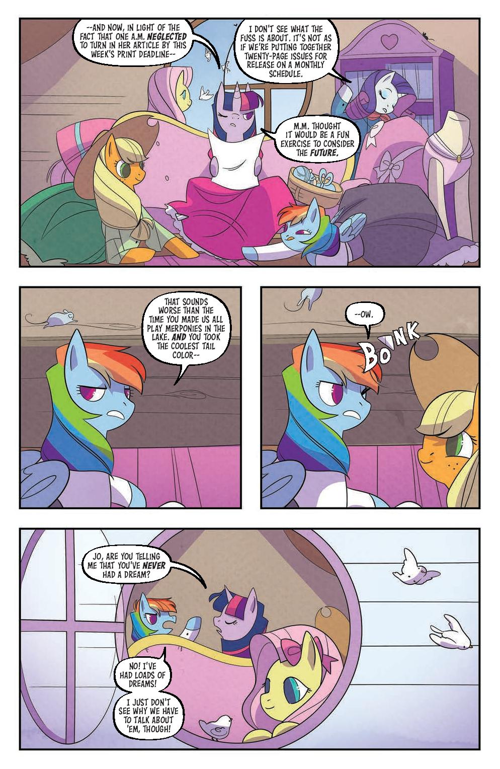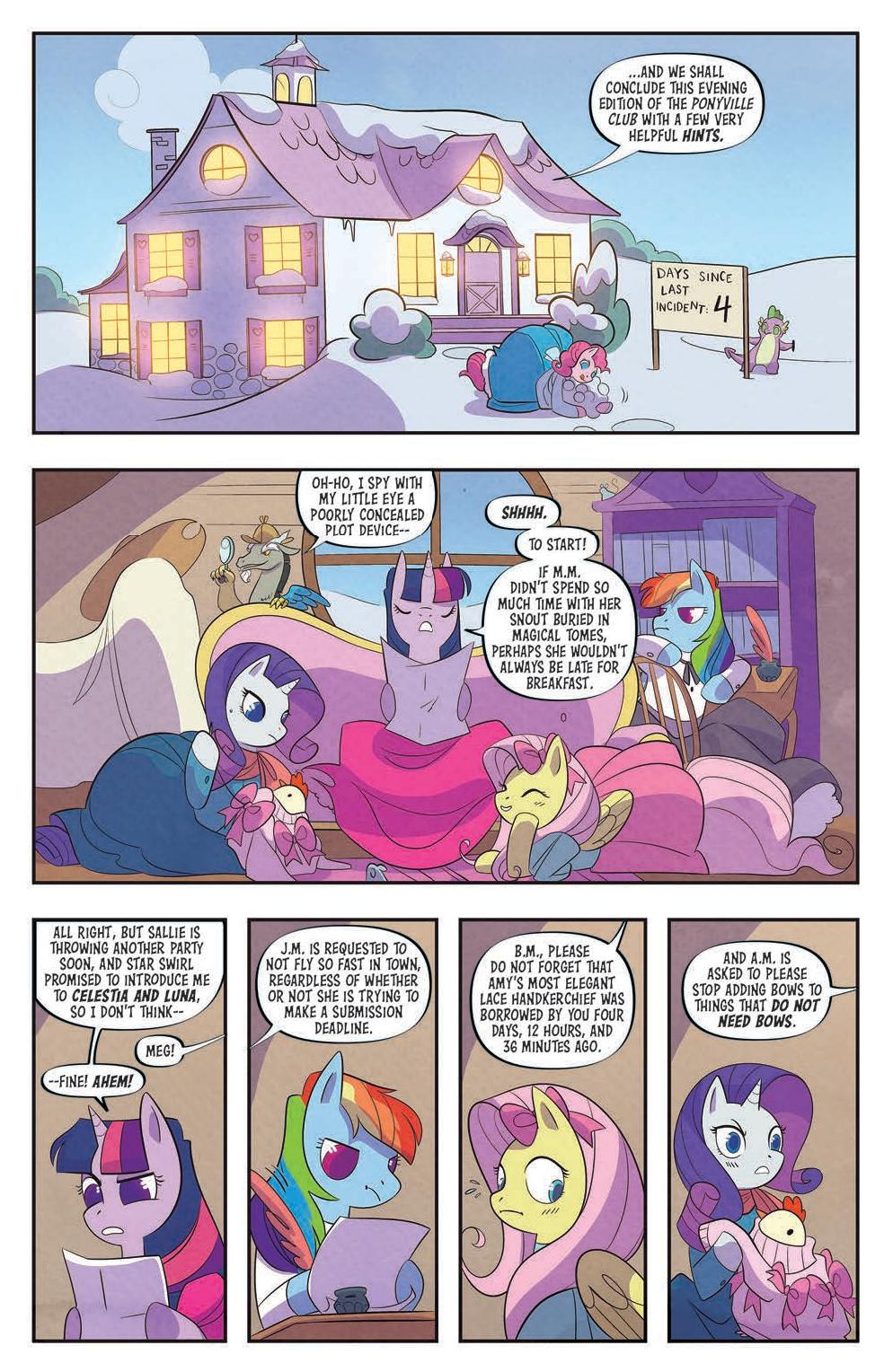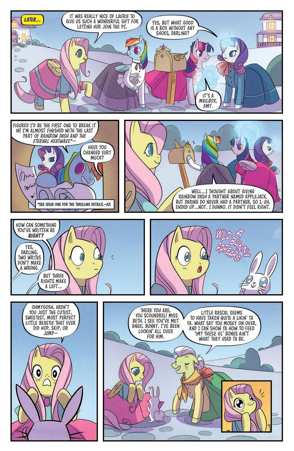 My Little Pony: Classics Reimagined—Little Fillies, written by Megan Brown, illustrated by Jenna Ayoub, and colored by Heather Breckel, is a new series about love, life, and sisterhood. Rainbow Dash, Twilight Sparkle, Fluttershy, and Rarity take on the roles of the March sisters, dreaming of life beyond Broncord, Massahoofetts. Rainbow Dash in particular yearns for excitement—something to write about. So when Applejack, the Marches’ neighbor, arrives home with tales of eel-wrangling and apple-eating, Rainbow Dash and her sisters dare to hope for more.
