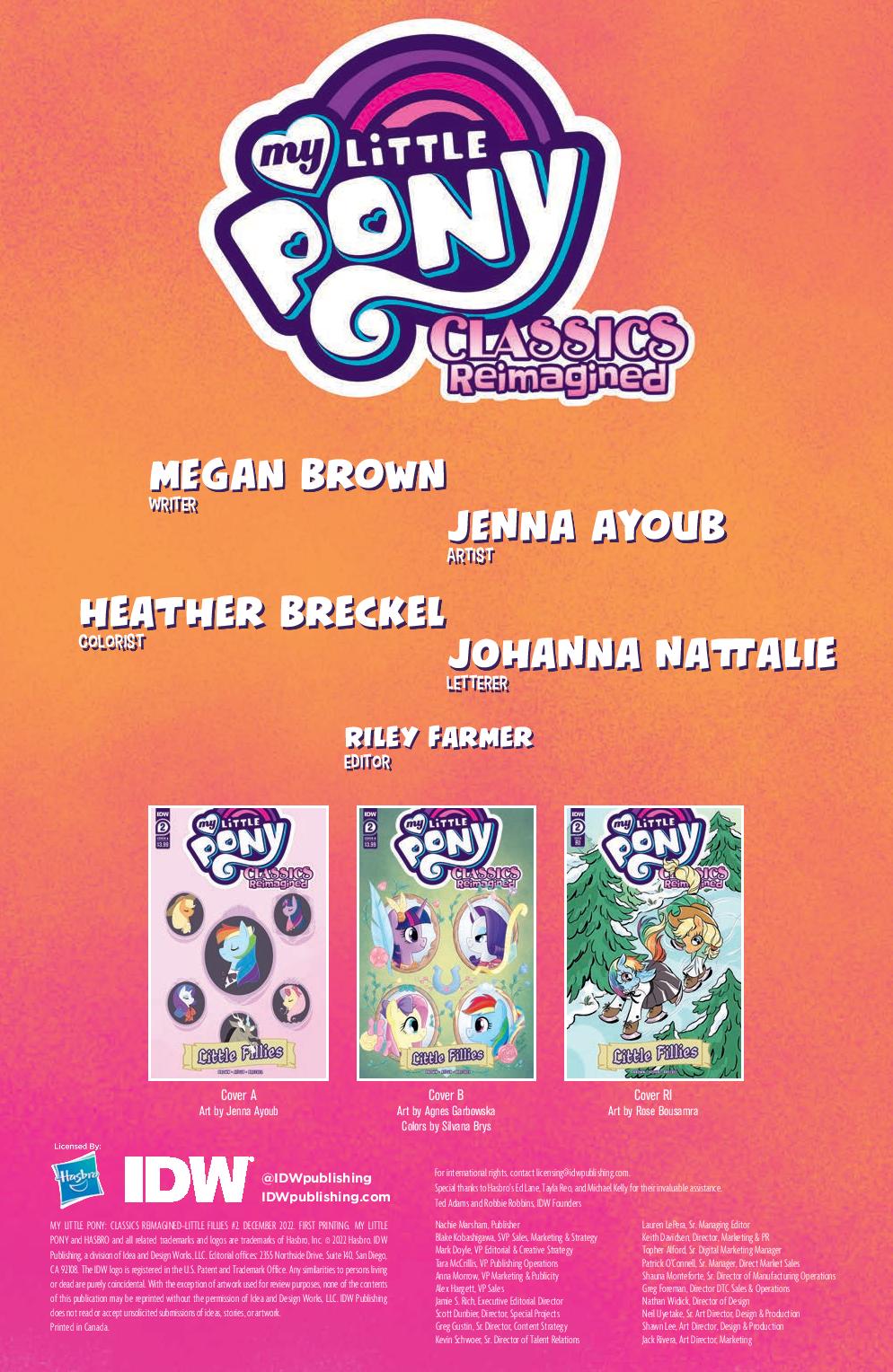 My Little Pony: Classics Reimagined—Little Fillies #1 will be available with multiple cover variants for retailers and fans to enjoy, including Cover A by series artist Jenna Ayoub, Cover B by Agnes Garbowska, and a special Retailer Incentive variant by Rose Bousamra.