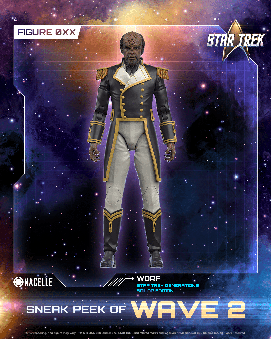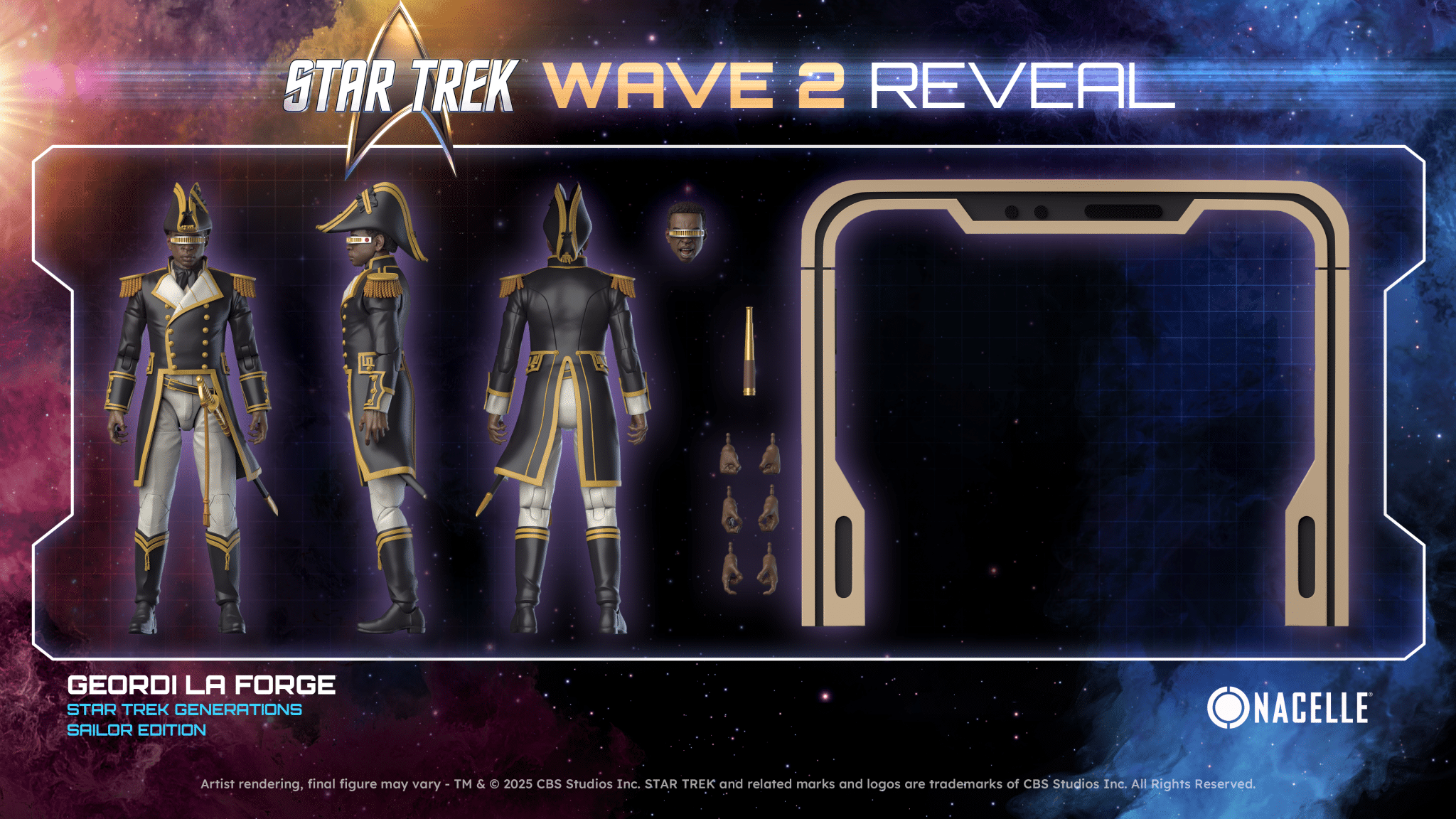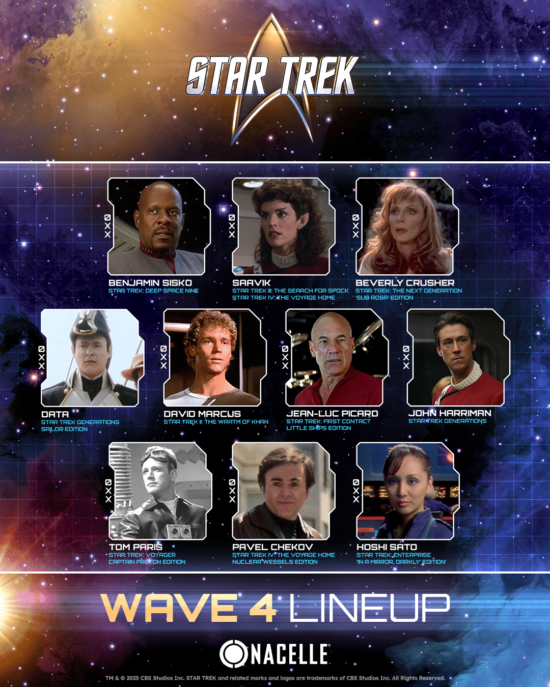 In October 2024, Nacelle announced the complete lineup for wave one at New York Comic-Con, which included Edward Jellico from Star Trek: The Next Generation “Chain of Command”, Weyoun from Star Trek: Deep Space Nine, Rachel Garrett from Star Trek: The Next Generation “Yesterday’s Enterprise”, Hikaru Sulu from Star Trek VI: The Undiscovered Country, Peter Preston from Star Trek II: The Wrath of Khan, Tuvix from Star Trek: Voyager “Tuvix”, Valkris from Star Trek III: The Search for Spock and Mirror Universe Archer from Star Trek: Enterprise “In A Mirror, Darkly”.