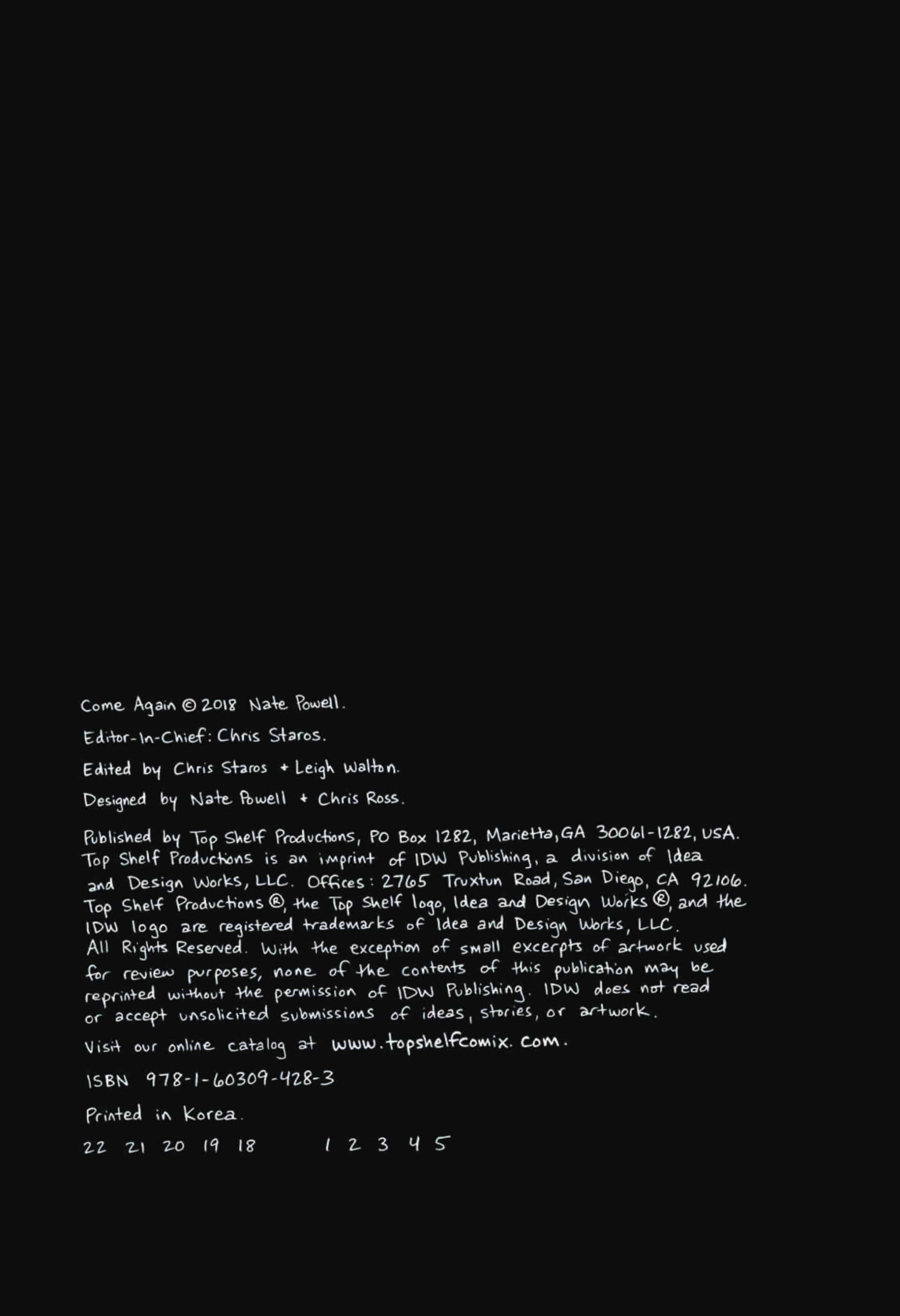Powell’s newest book is the demon-haunted Arkansas fairytale Come Again (Top Shelf Productions, 2018).