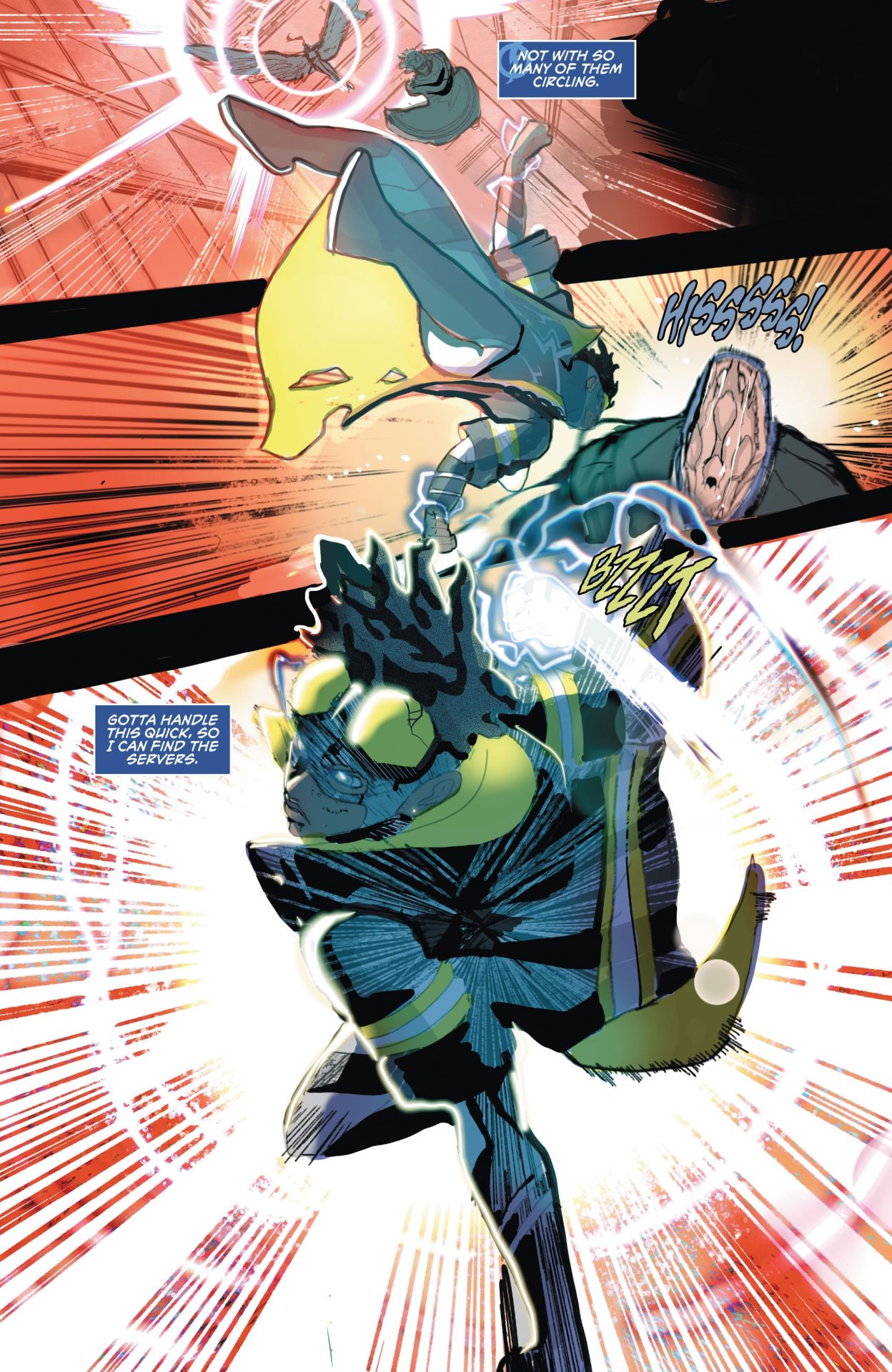 Best of all, this focus on action in Static: Season One #6 allows Draper-Ivey to flex his skills with layout, poses, and especially color. Kind of like turning up the voltage, Nikolas Draper-Ivey saturates with white space, blue, and cool glitch effects that show the strain that Static is going through to help his friends and get out alive. It’s the climax of some super-kinetic storytelling with Draper-Ivey capturing the greatest hits of a fight scene through speed lines, small panels, and poses straight out of anime. Everything is hyper-stylized and dynamic with the act of throwing a baseball bat turning into a momentum changer as Static’s abilities bleed into almost every panel on the page.