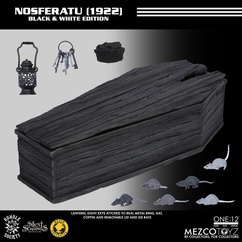 Nosferatu comes complete with a removable hat, a lantern that he can hold in his nightmare-inducing claw-like hands, a rat-infested coffin and lid that he can lay inside, a set of castle keys on a metal ring, and six rats.
