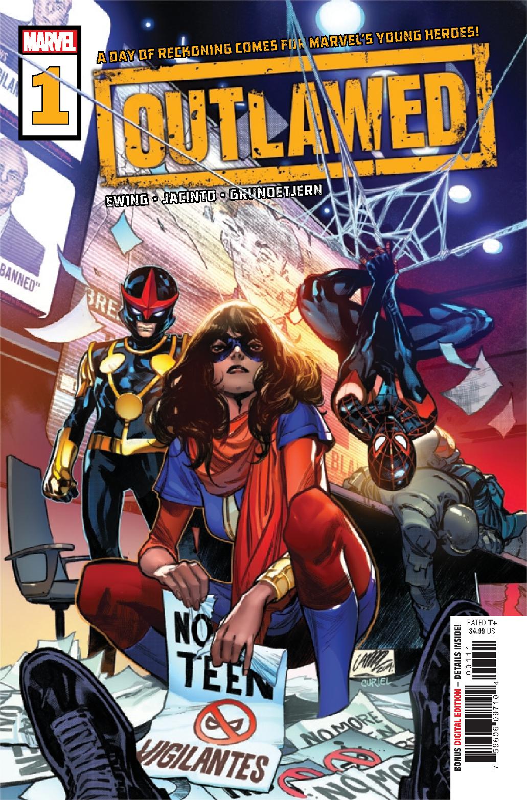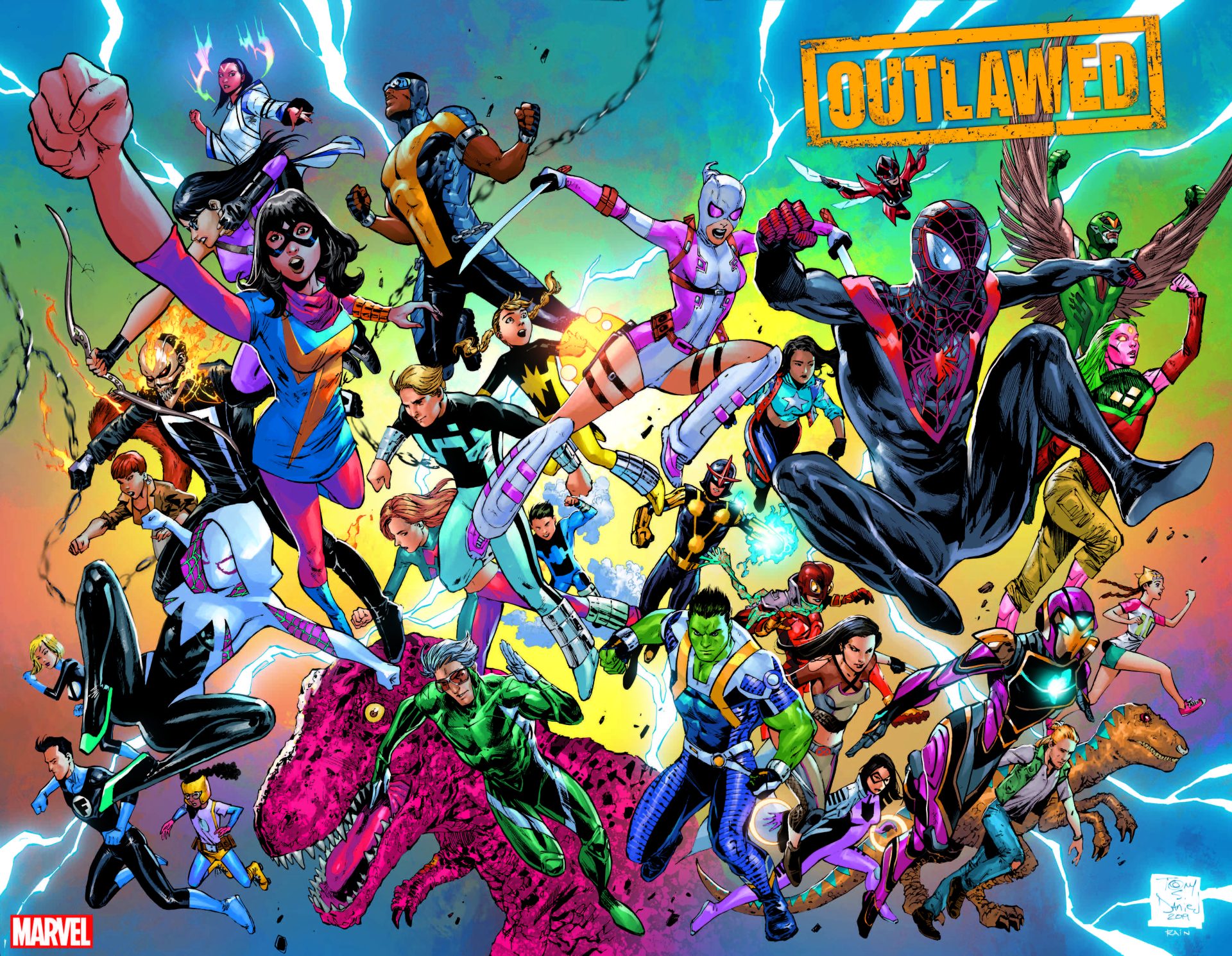 It’s a one-shot that will have a lasting impact on your favorite Marvel super heroes from Ms. Marvel to Miles Morales and it all starts in writer Eve L. Ewing, artist Kim Jacinto, colorist Espen Grundetjern, and letter Clayton Cowle’s Outlawed! Coming in March, Outlawed will throw the lives of Marvel’s youngest heroes into chaos when a law is passed outlawing teenage vigilantes. You won’t want to miss it! For now, see a who’s who of the next generation of Marvel super heroes below in artist Tony Daniel’s epic wraparound variant cover featuring colors by Rain Beredo!