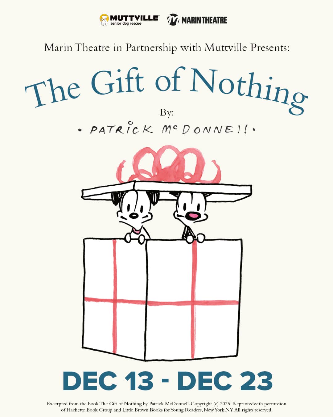 The Marin Theater event is the West Coast Premiere of The Gift of Nothing, a heartwarming new musical for children of all ages and their families based on the book of the same name by Patrick McDonnell featuring his beloved Mutts comic strip characters, Mooch and Earl. This special production marks only the second time this musical has ever been staged and coincides with the 20th anniversary celebration of the original book—just in time for the holiday season.