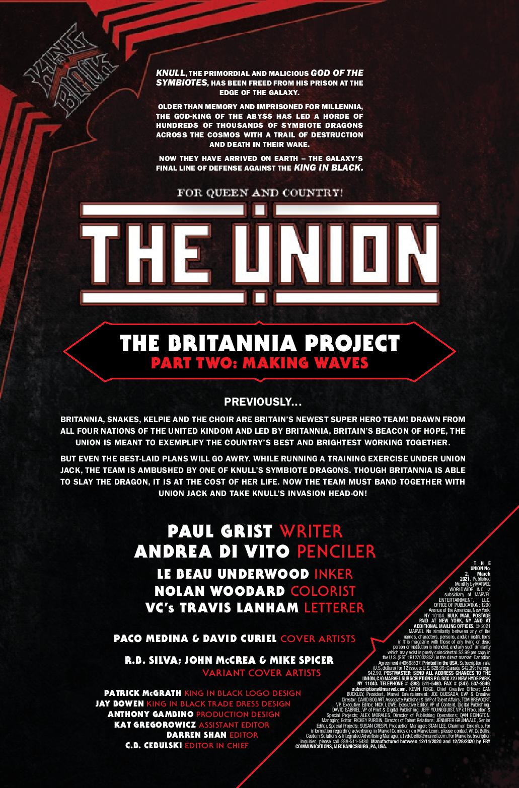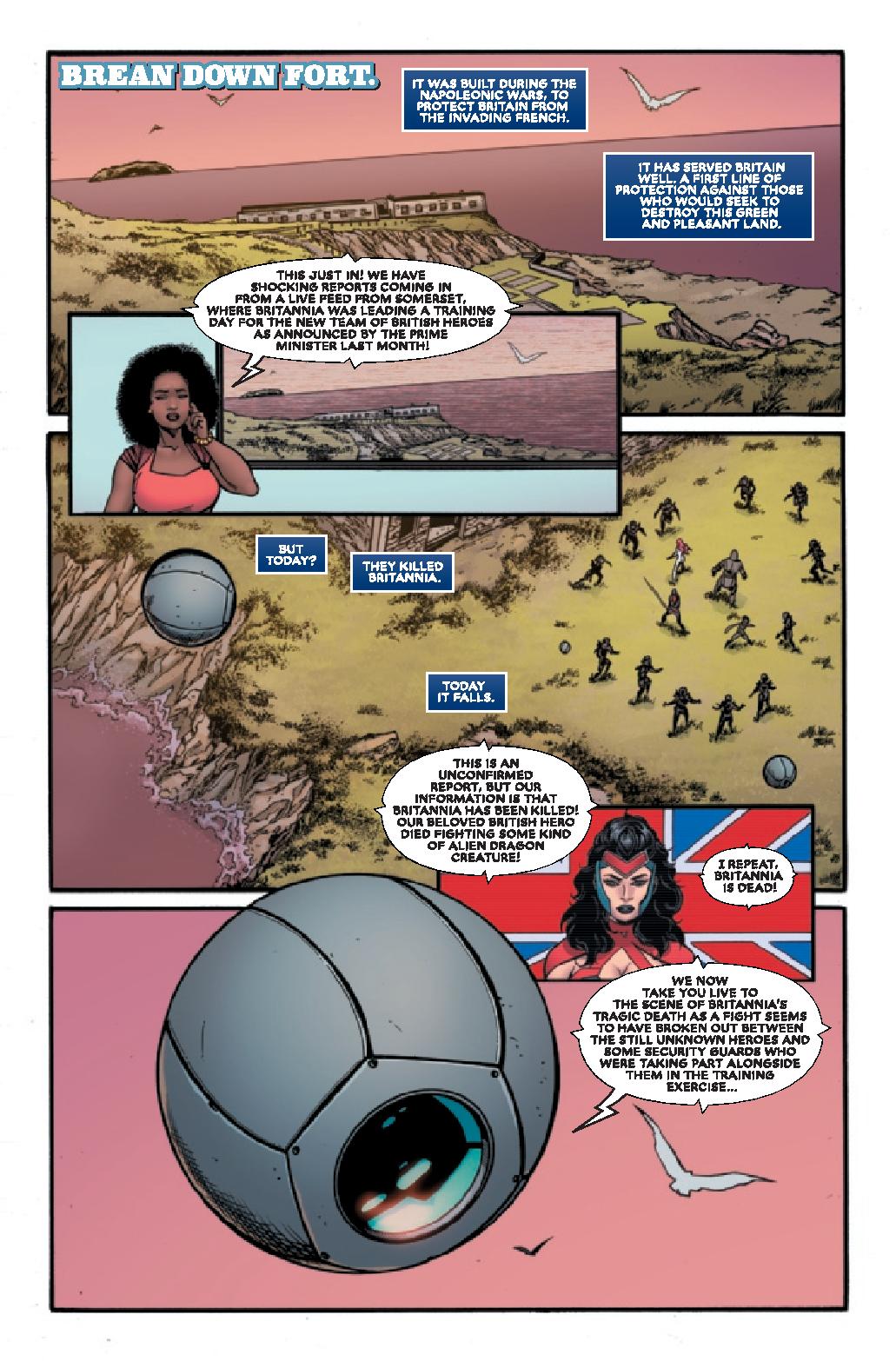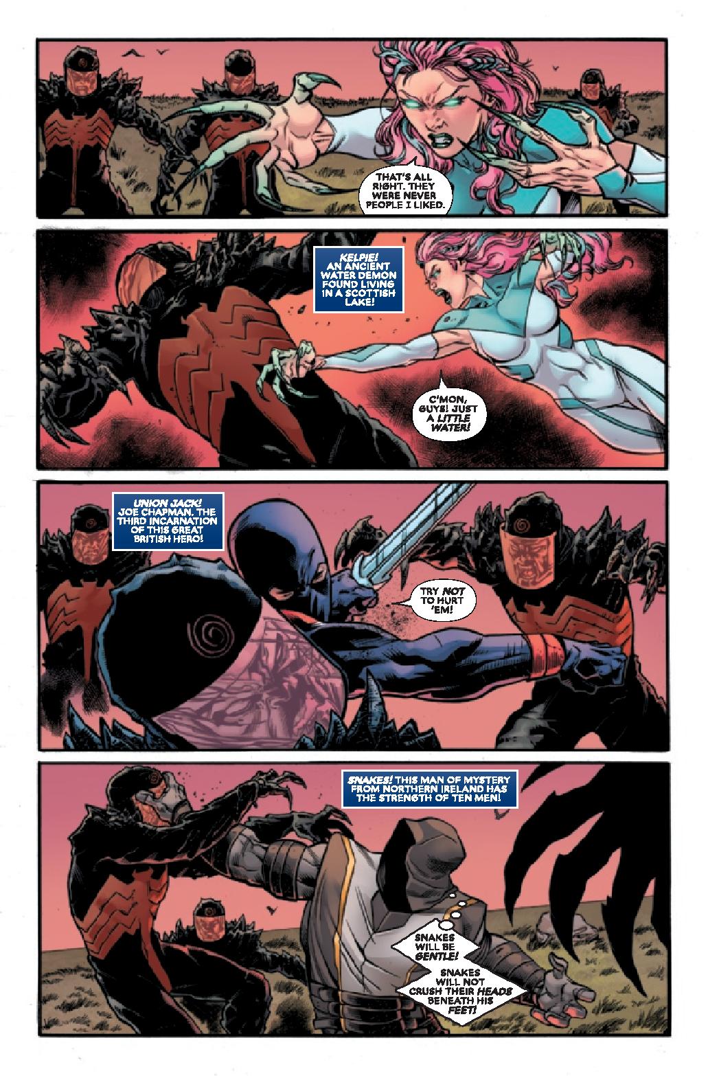 As I mentioned earlier, Andrea Di Vito, Drew Geraci, LeBeau Underwood, and Nolan Woodard’s art is probably the less egregious part of The Union #1. For example, Woodard uses deep blacks for the symbiotes against the cloyingly bright palette of the Somerset to show how silly all the media prattle seems against a real threat. In the same scene, Di Vito, Geraci, and Underwood channel medieval compositions when Britannia goes against a symbiote dragon while quipping about St. George not actually being British, which is a nice bit of satire about the emptiness and historical inaccuracy of nationalist symbolism from Paul Grist. If only the rest of the comic could have synthesized wit and action like these pages. However, I didn’t have many complaints about the art. It’s easy to follow, and each team member has a distinct design and power set even if their personalities aren’t as fleshed out yet.