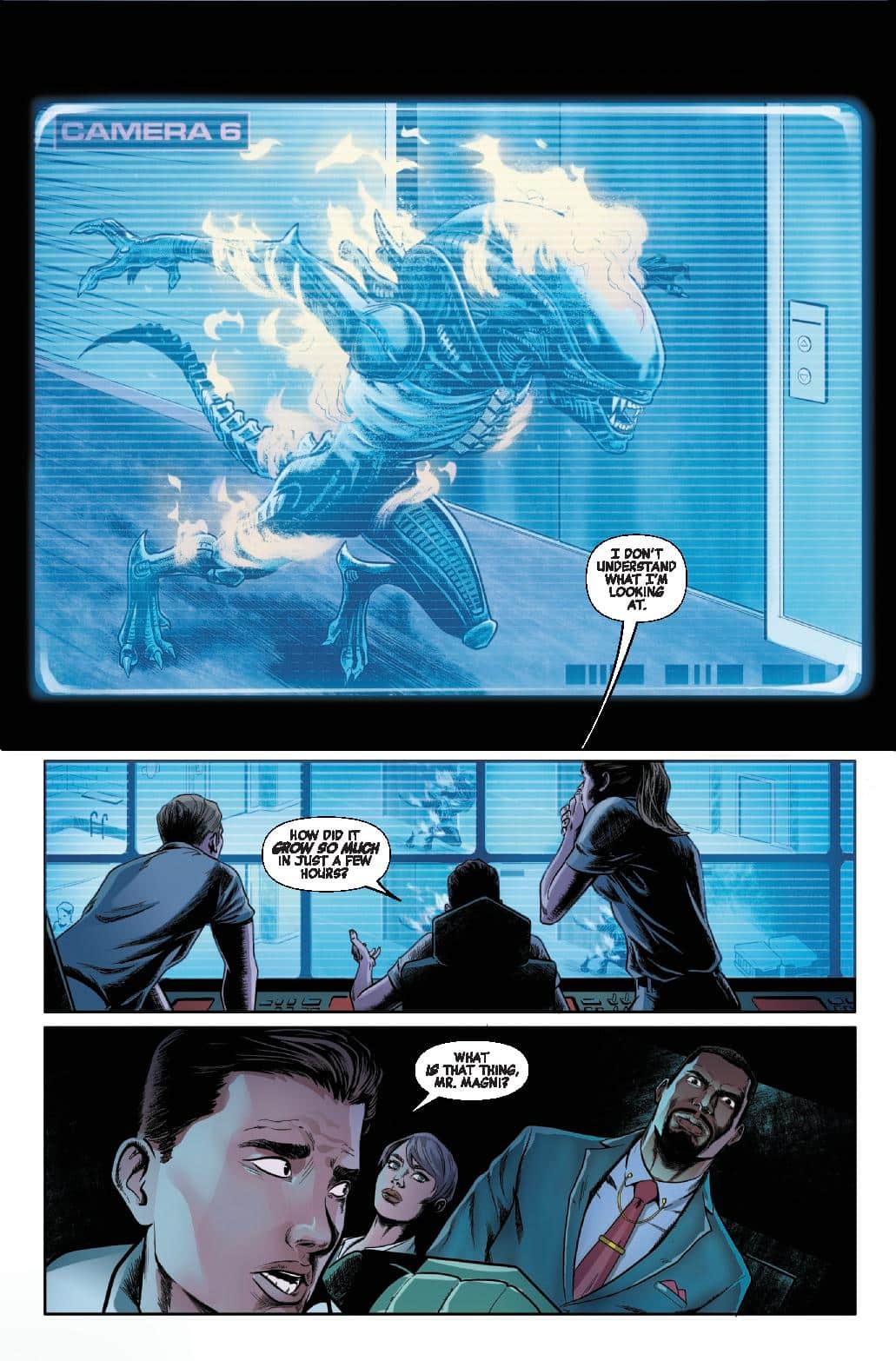 That’s brought to us by Edgar Salazar, ink by Victor Nava, color by Carlos Lopez, and lettering by Clayton Crain. The art is generally good with just enough gore to feel like an Aliens murder fest and some solid kills that feel rather unique and fun in a way. Where the visuals get interesting is the art by Peter Nguyen who provides visuals from the perspective of the xenomorph. It’s an interesting decision and not something I’ve seen (that I remember) in previous comics, so it stands out as something new.