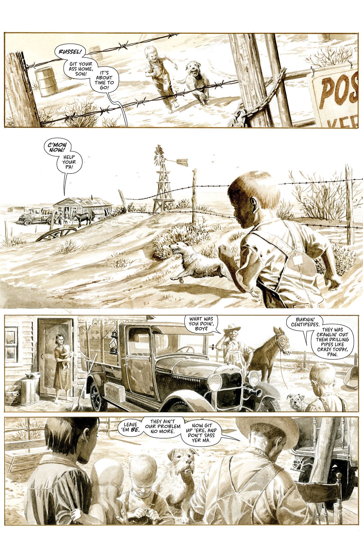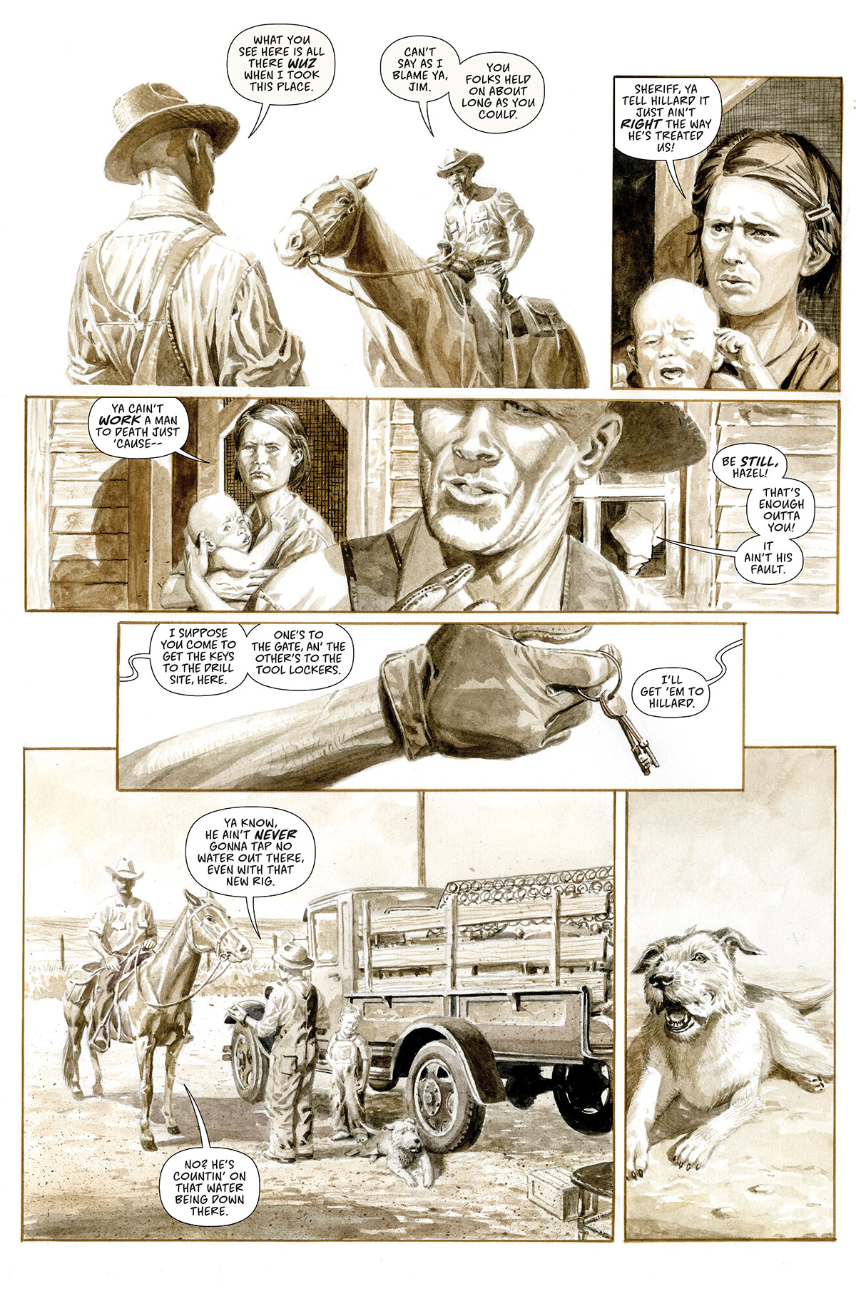 Written by JG Jones and Phil Bram, Dust to Dust #3 is another excellent issue that’s haunting in so many ways. The story is a murder mystery but it’s set in a small town during the rather intriguing time of the Dust Bowl. There’s a level of detail to it that begs readers to linger on pages attempting to parse out every item for clues.