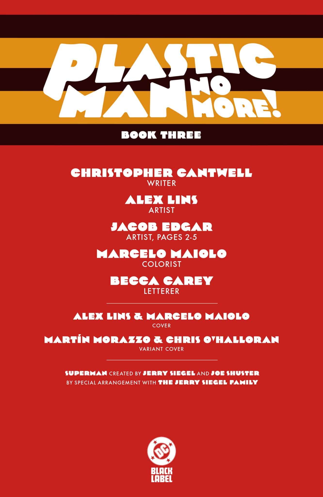 Plastic Man No More! #1, written by Cantwell with art and main cover by Lins, additional art by Jacob Edgar, color by Marcelo Maiolo and lettering by Becca Carey, will have variant covers by Michael Allred, Chris Samnee, and Tyler Boss (1:25). Plastic Man No More! #1 will hit local comic book shops on September 4, 2024. Plastic Man No More! is a DC Black Label comic book series and carries an Ages 17+ content descriptor (for mature readers). Each issue of Plastic Man No More! will be 32 pages, with 32 story pages per issue. Artists Riley Rossmo and Martin Morazzo will be featured on additional variant covers throughout the new DC Black Label series.