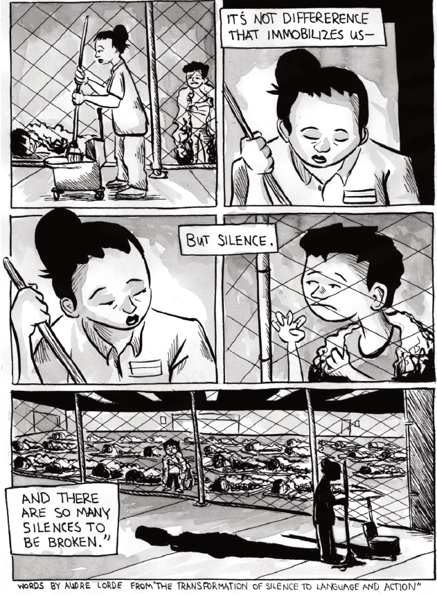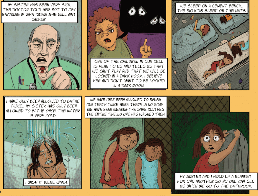 CONTENT WARNING: This graphic novel covers the human rights violations of migrants imprisoned in ICE detention centers. This includes scenes abuse, starvation, neglect, physical violence, and racial slurs, many of which involve children.