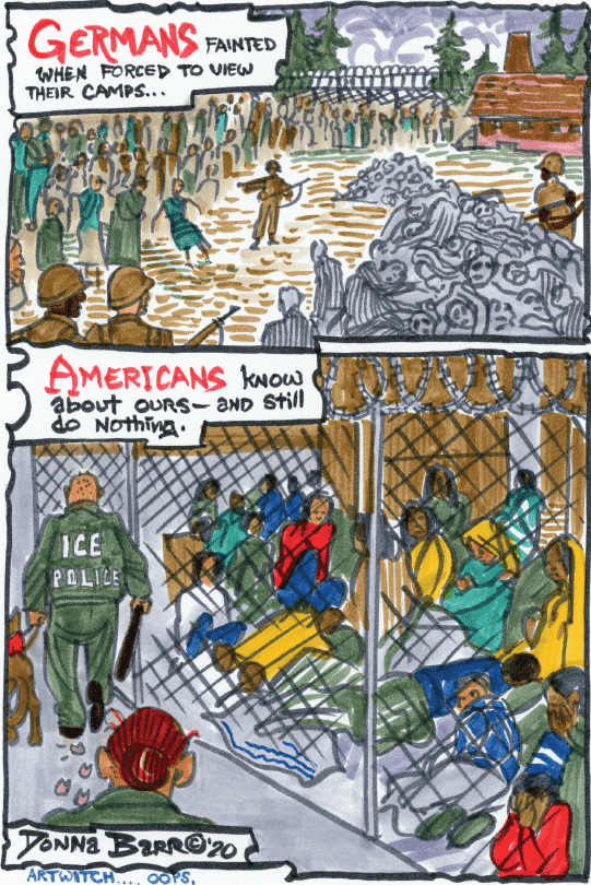 The Posters is the last segment, and it’s top quality! The point here is to use the artform of posters to make commentary, much like the WPA era. This commentary ranges from the strength and beauty of migrants to ICE brutality to satire. Some of these posters are one page comics, a particularly brutal one by Donna Barr that shows the different reactions between Germans learning about the concentration camps and Americans finding out about the detention centers. It is incredibly chilling.