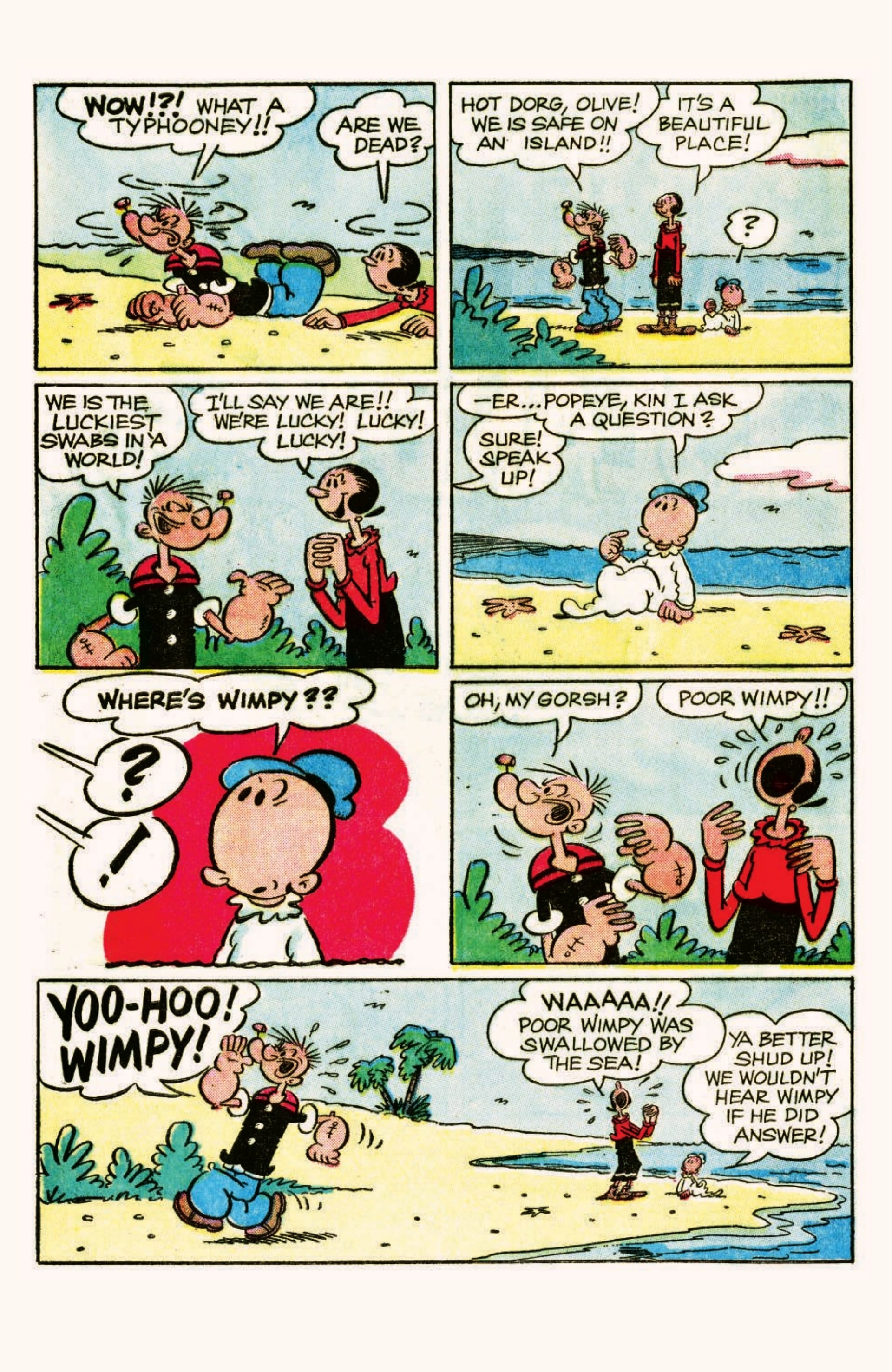 In the first story, Popeye fights a titanic sea battle to bring orchids to hungry jeeps–watch out for the Sea Hag! Plus, an adventure-filled Old West story, “Pot of Gold,” including Wimpy and Swee’pea. Read a delightful Uncle Elmo story and a hilarious O.G. Wotasnozzle comic!