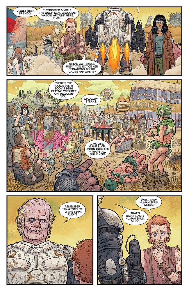 Dave Stewart definitely adds another level of awesomeness with his colors. They go together well. It helps sell the image of a blade going through someone’s head or various mutated wasteland folks. And besides the art, Skroce is a pretty good storyteller. If I had to nitpick, I’d say the dialogue is the weakest part of Post Americana #1.