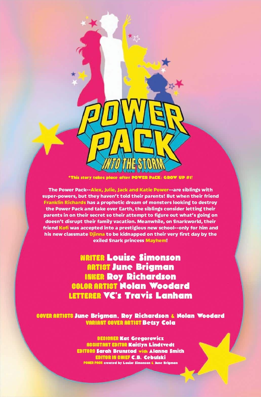 The Pack is back — and so are their legendary co-creators! In honor of the group’s 40th anniversary, co-creators Louise Simonson and June Brigman return with an all-new Power Pack saga this January—Power Pack: Into the Storm!
