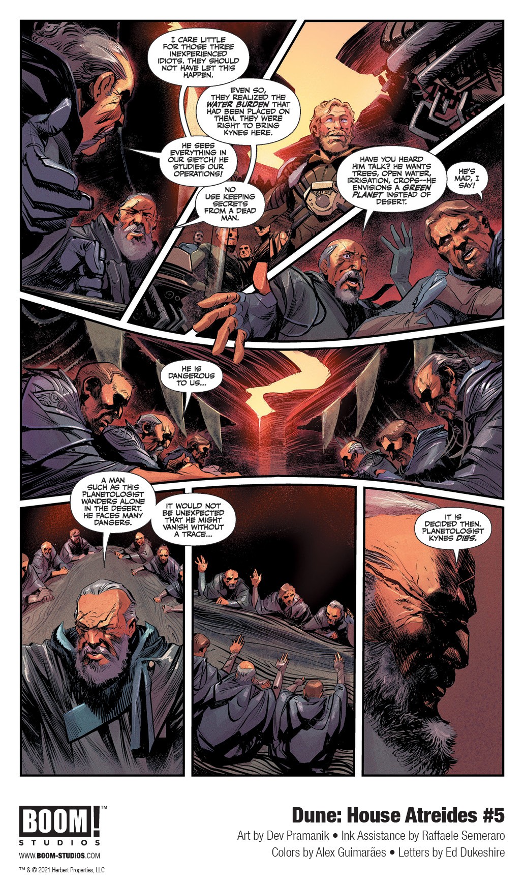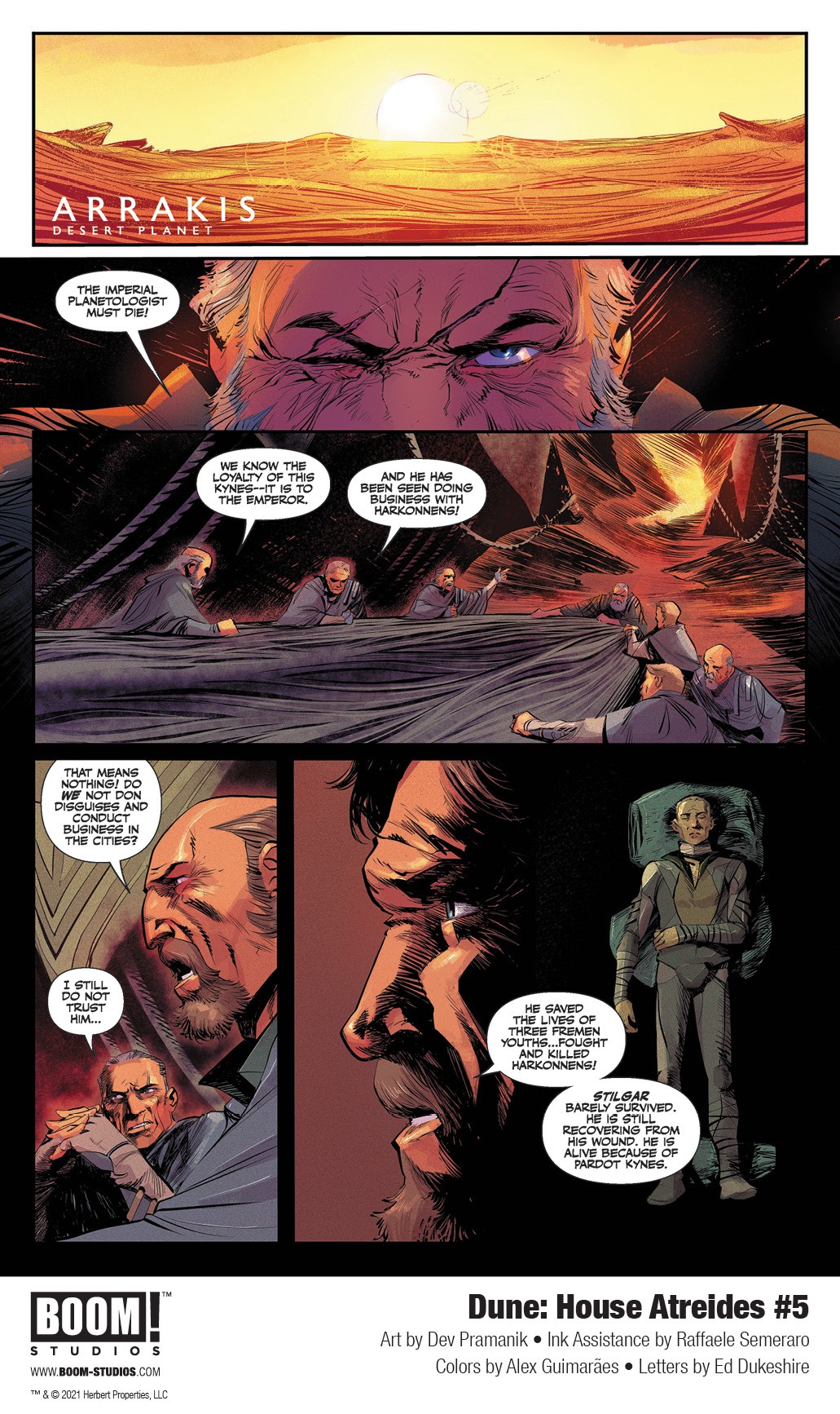 BOOM! Studios has revealed a first look at Dune: House Atreides #5, adapted and scripted by Brian Herbert and Kevin J. Anderson, who co-wrote the eponymous prequel novel based on Frank Herbert’s notes and illustrated by artist Dev Pramanik with ink assistance by Raffaele Semeraro, colorist Alex Guimarães and letterer Ed Dukeshire, in partnership with Herbert Properties LLC and in full coordination with Abrams ComicArts, who published the first of three graphic novel adaptations of Herbert’s original classic novel Dune in Fall 2020.