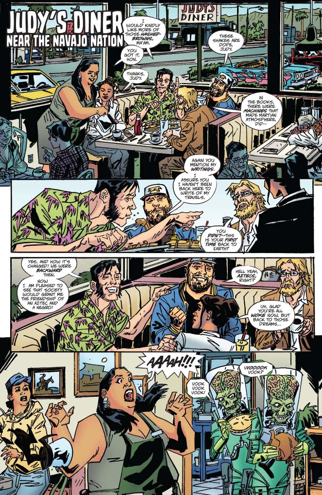 Wrapping up the trio of stories is “Lobo Land!” from writer Sam Humphries, artist Denys Cowan, inks by Bill Sienkiewicz, colorist Chris Sotomayor, and letterer Dave Sharpe. With the Death Metal in hand Lobo does what he does best and gets distracted. Again, it adds little to the narrative and again opens up questions. Lex Luthor was able to snatch Lobo initially but doesn’t once he has the metal?