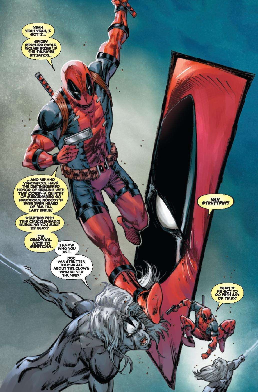 BATTLE ROYALE ‘POOL STYLE! Has WADE met his match against VENOMPOOL and THUMPER? Can DEADPOOL survive the depths of KILLVILLE even with WOLVERINE and SPIDER-MAN by his side? Thumper makes a bold move to consolidate power!