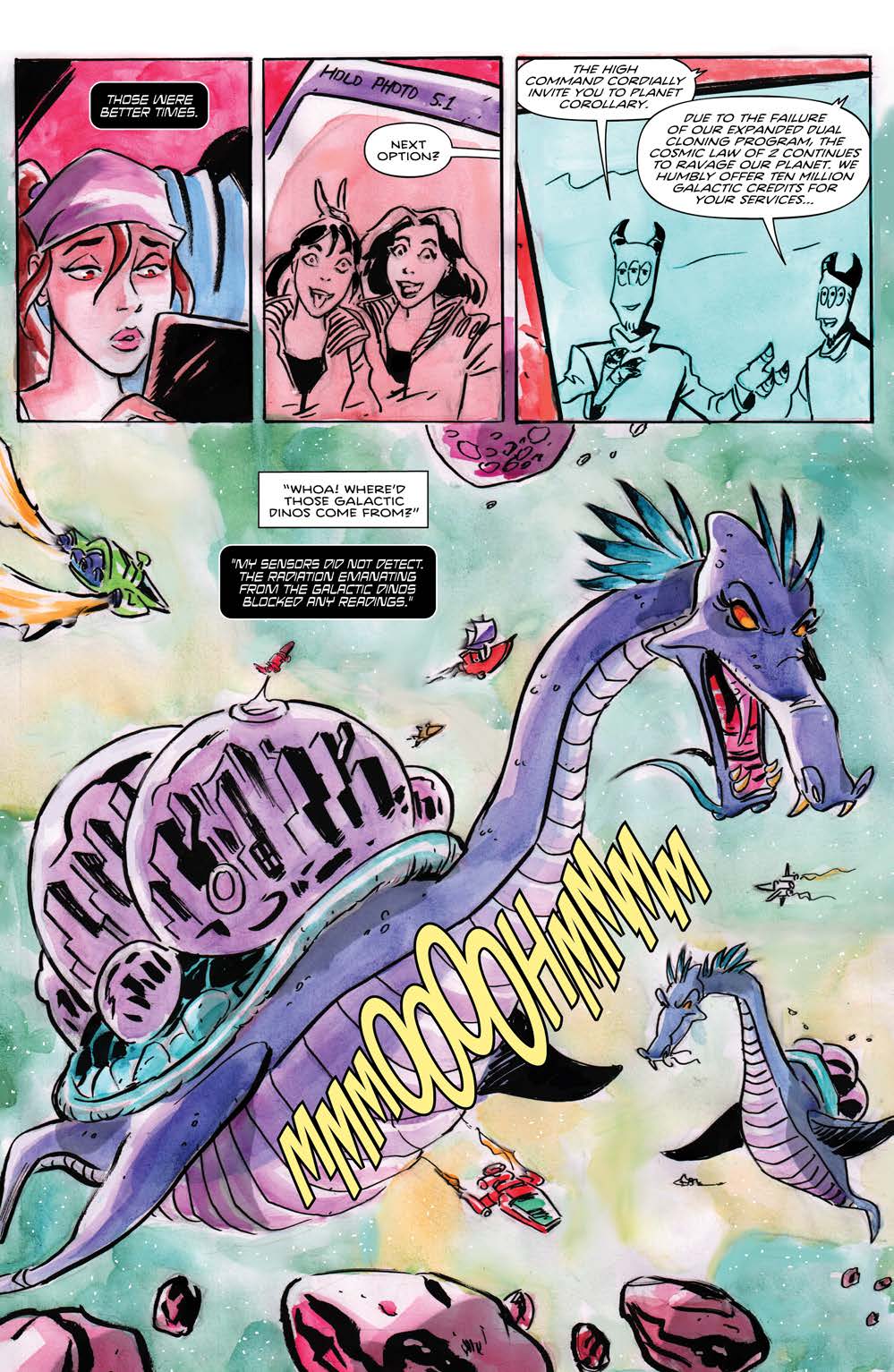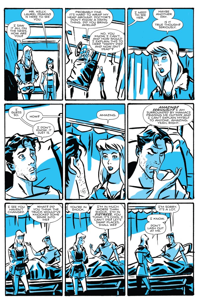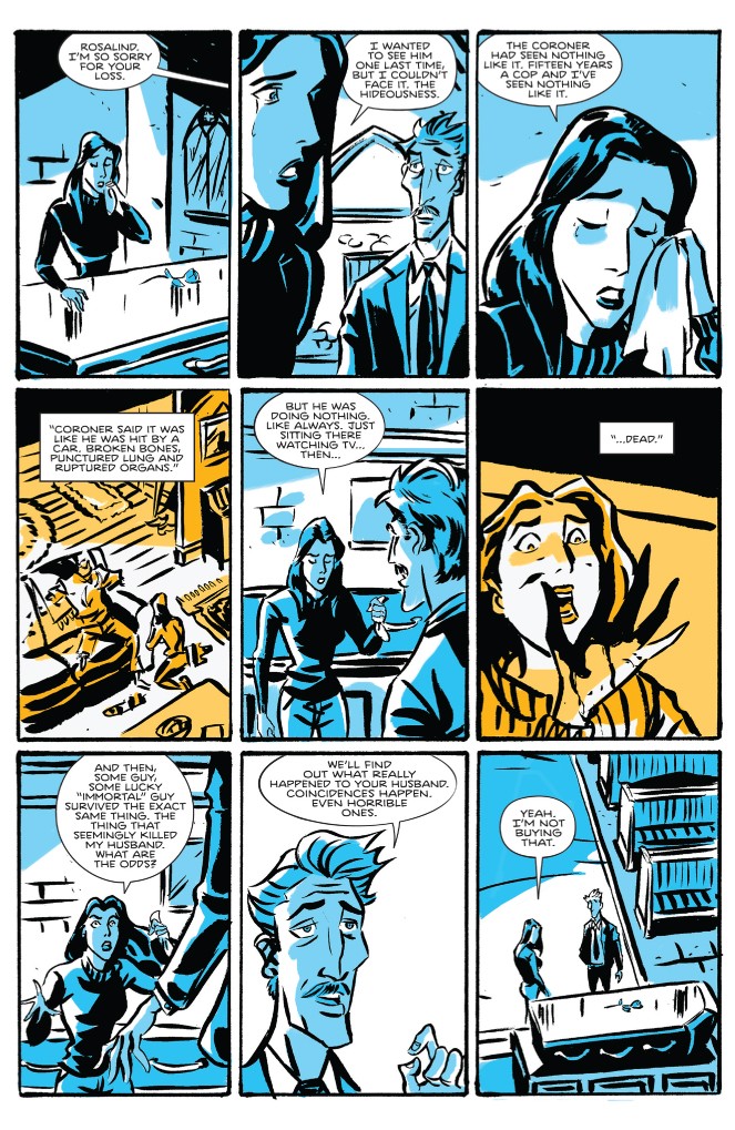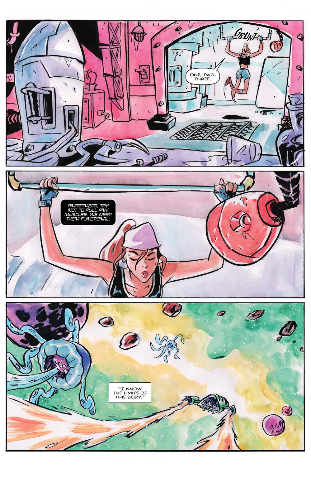 Corollary is a high-concept series where anything goes and inhabitants of the galaxy might find themselves in cities built on the backs of dragons or arguing with neurotic sentient moons. Ahmad’s art matches the frenetic storytelling with a style that is at once familiar and inventive.