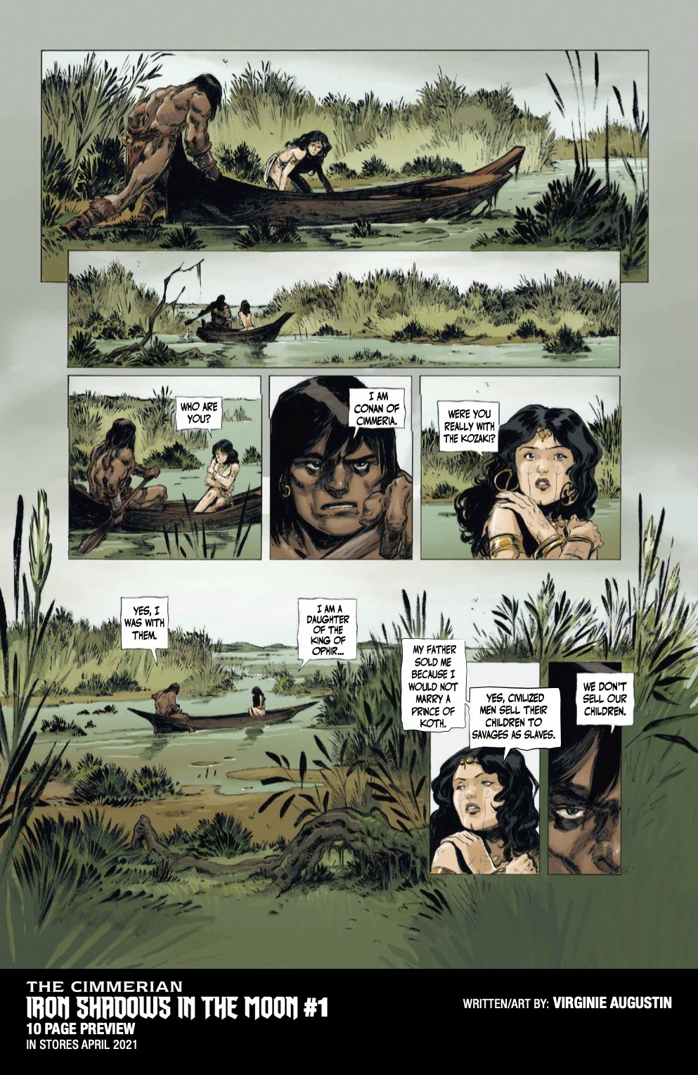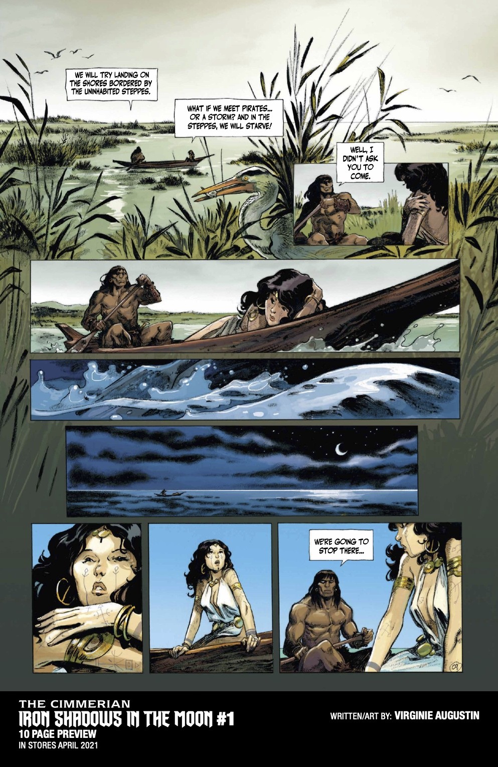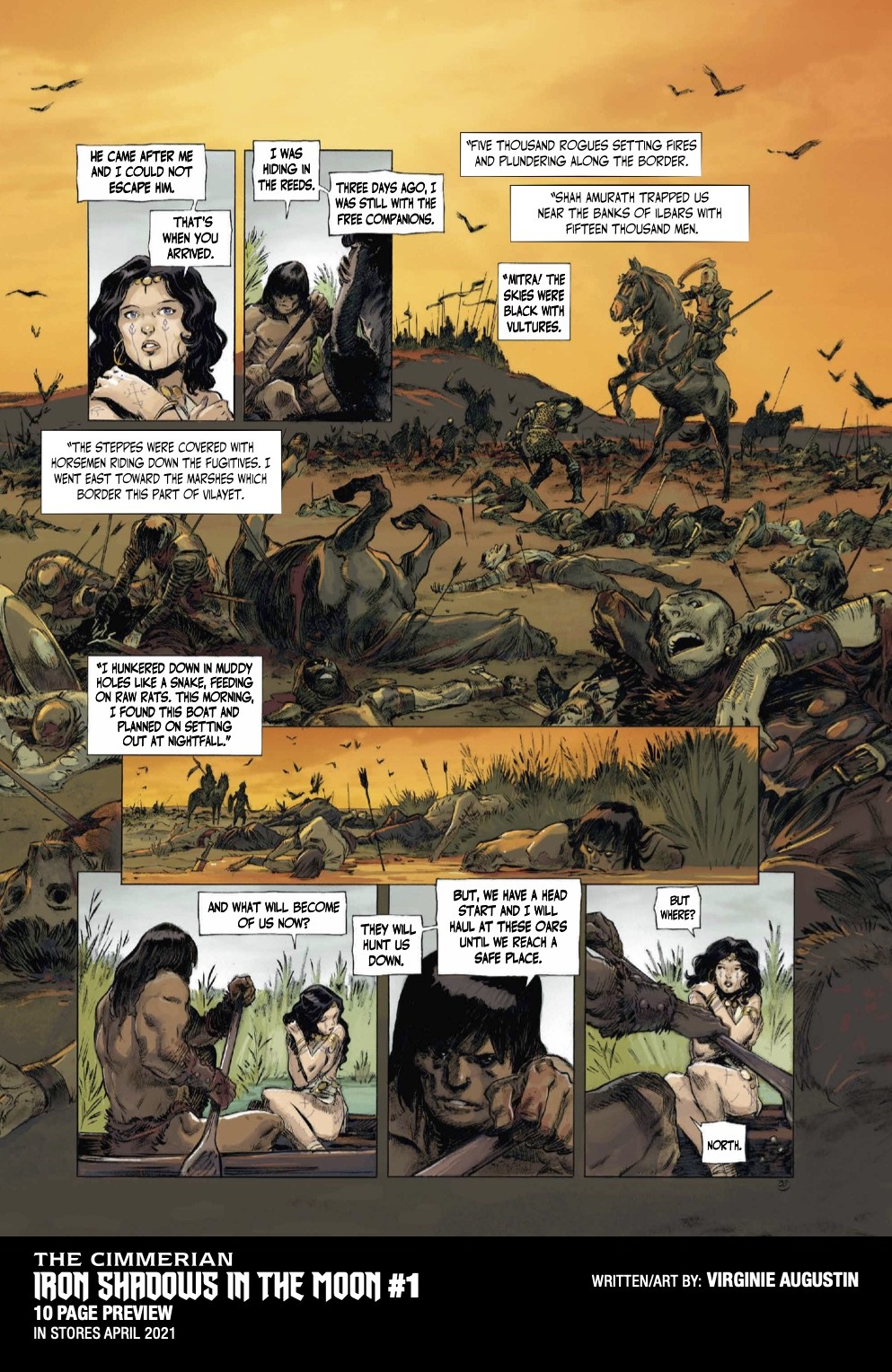 The Cimmerian: Iron Shadows in the Moon #1 will be solicited in the Jan 2021 issue of Diamond Previews for April 2021 shipping items, with an on-sale date of 4/7/21. Issue 1 will feature cover art by Virginie Augustin, as well as Brian Level, Kajo Baldisimo, and Fritz Casas.