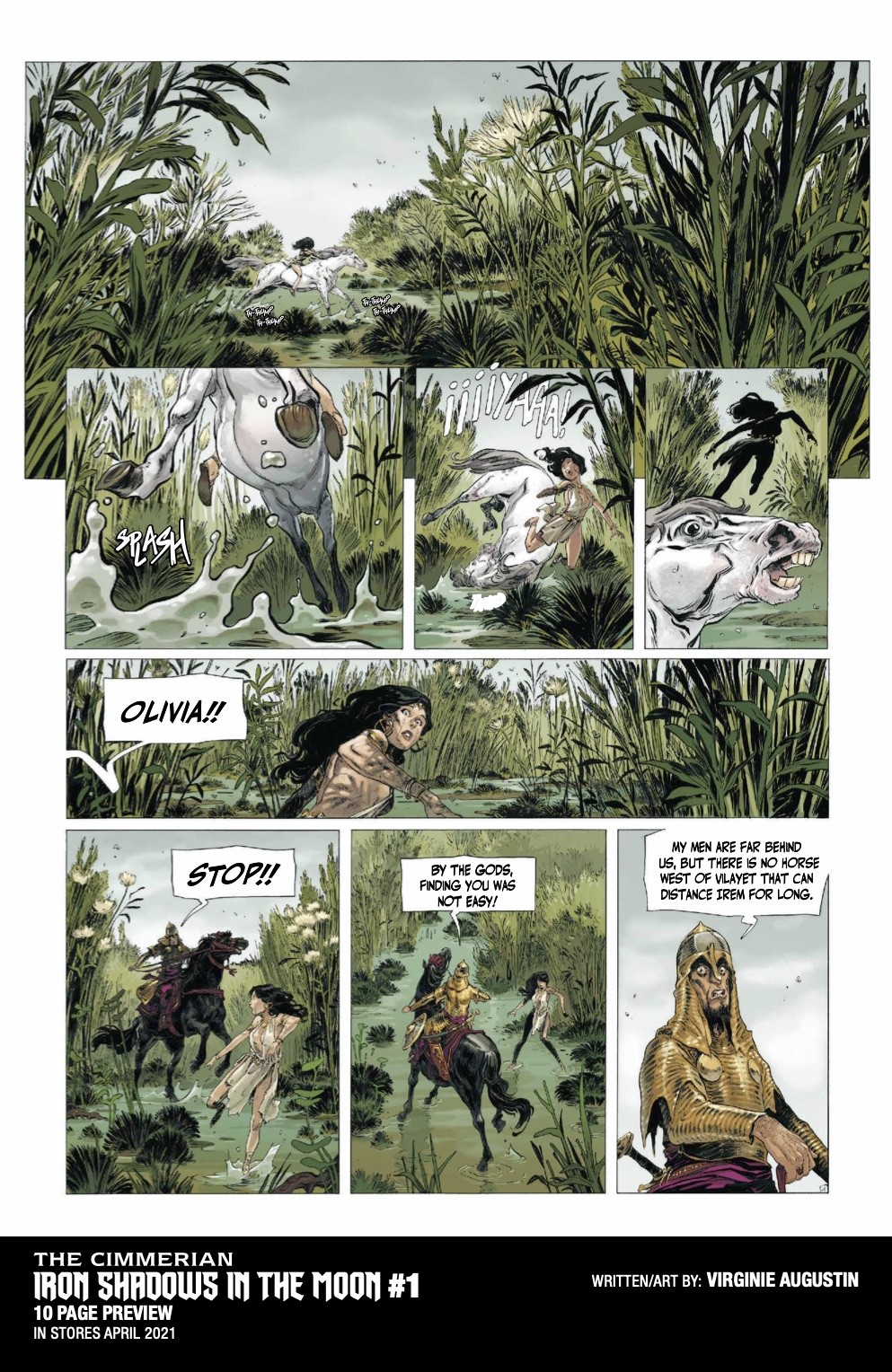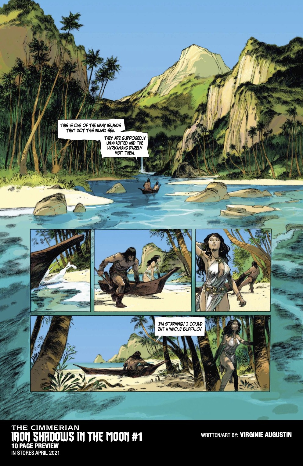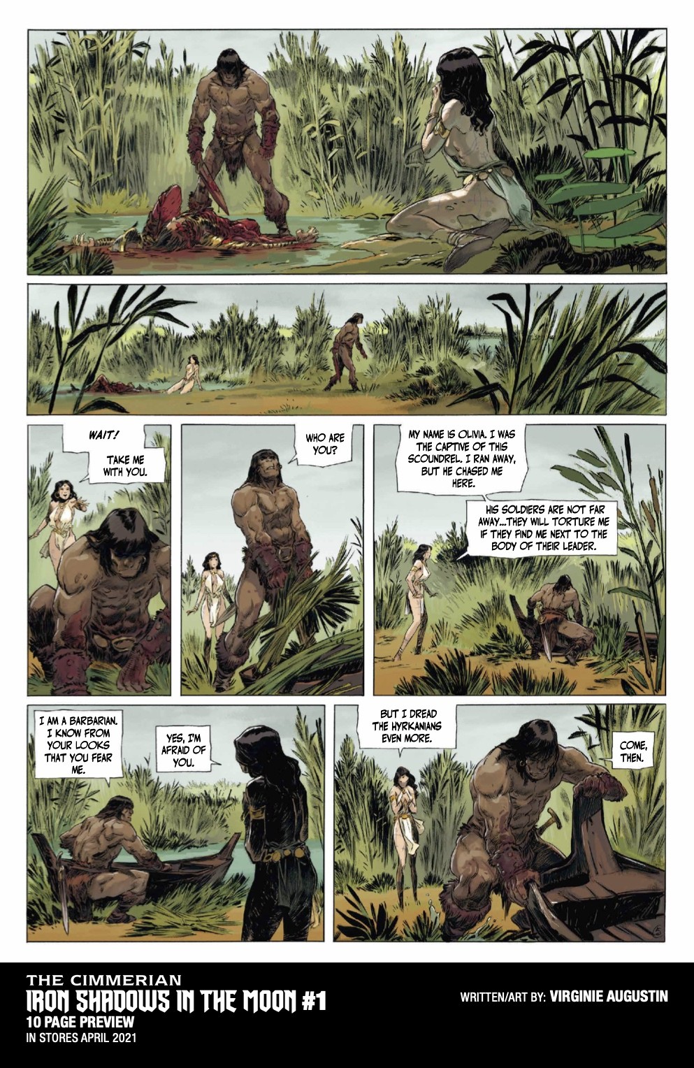 The Cimmerian: Iron Shadows in the Moon #1 will be solicited in the Jan 2021 issue of Diamond Previews for April 2021 shipping items, with an on-sale date of 4/7/21. Issue 1 will feature cover art by Virginie Augustin, as well as Brian Level, Kajo Baldisimo, and Fritz Casas.