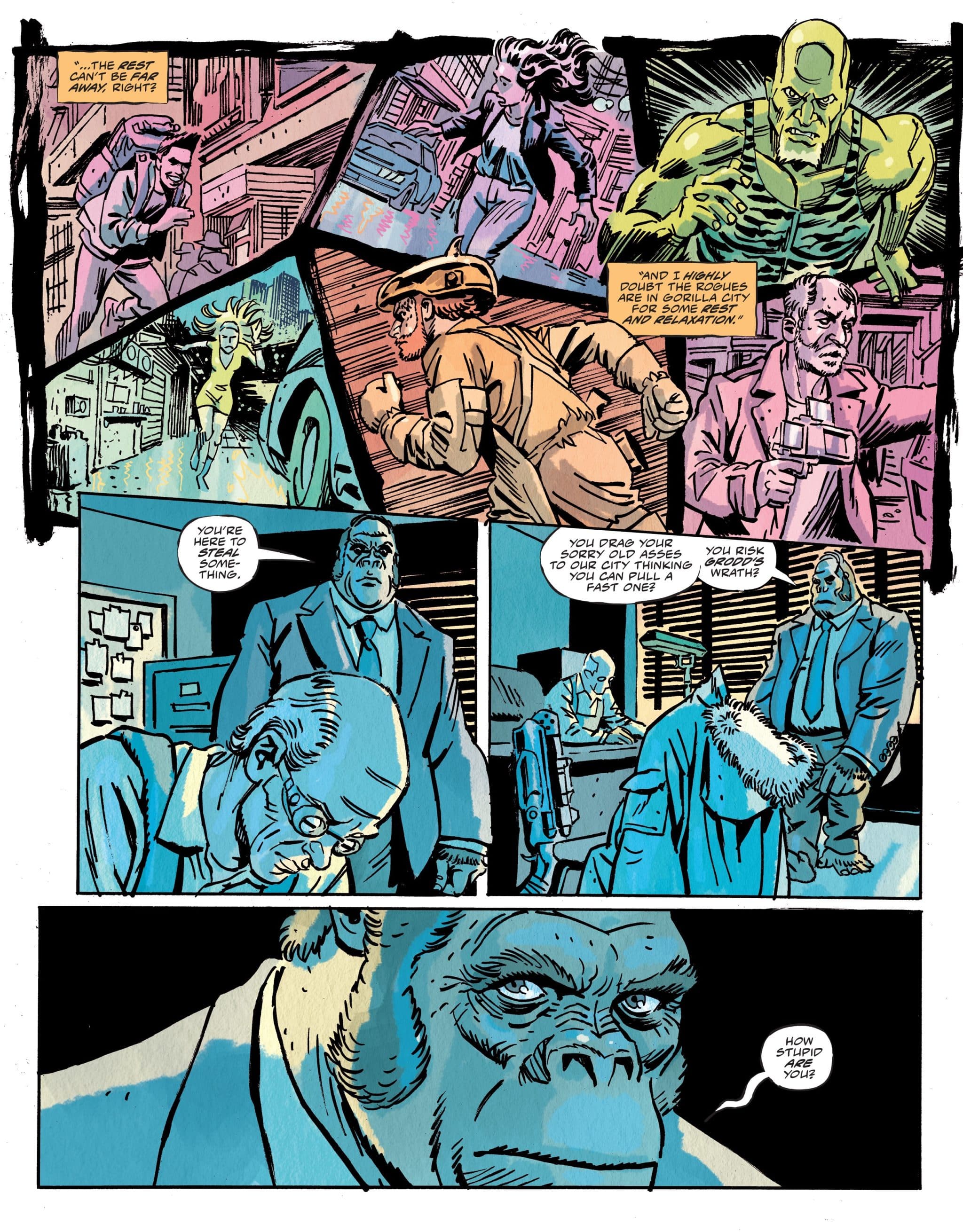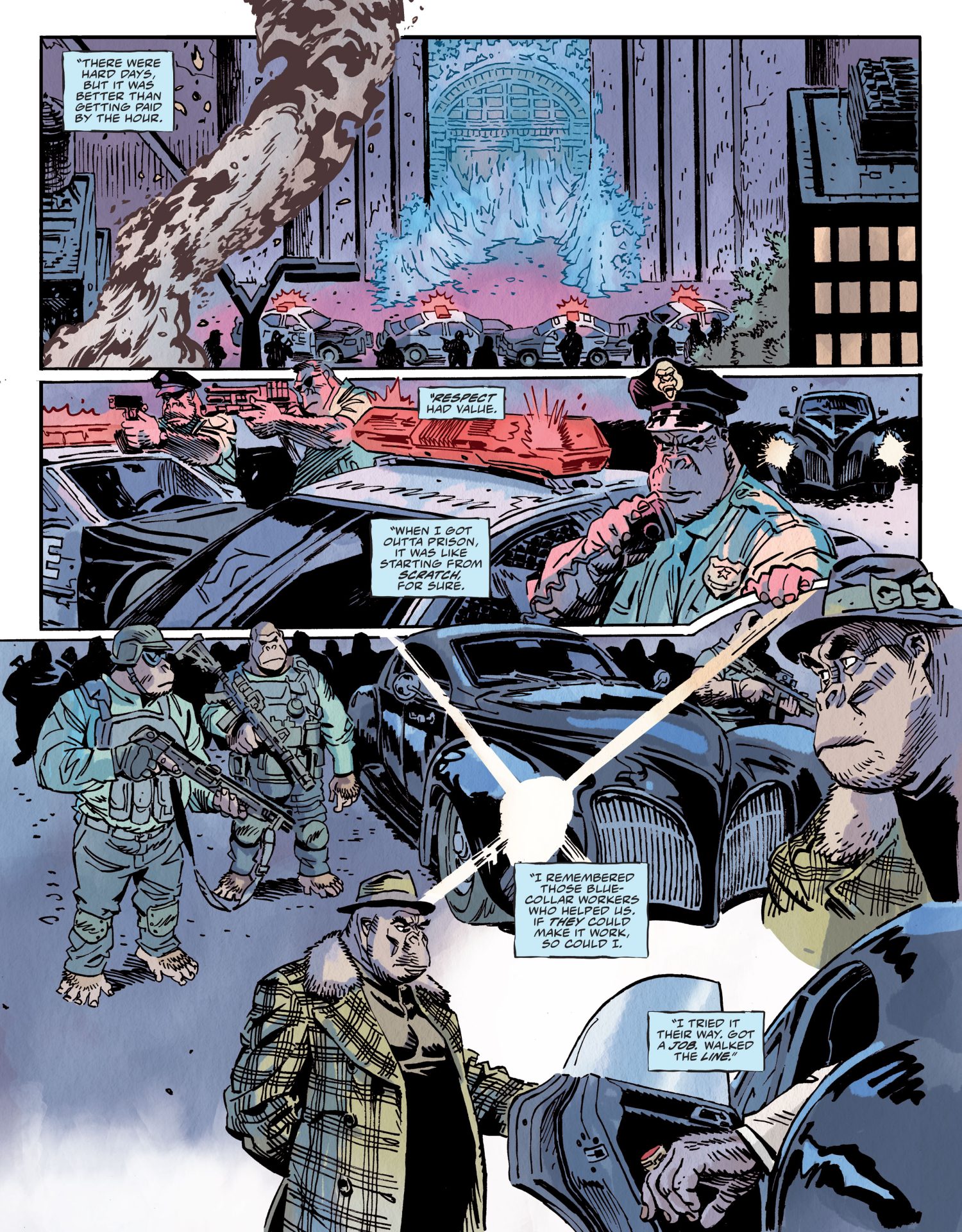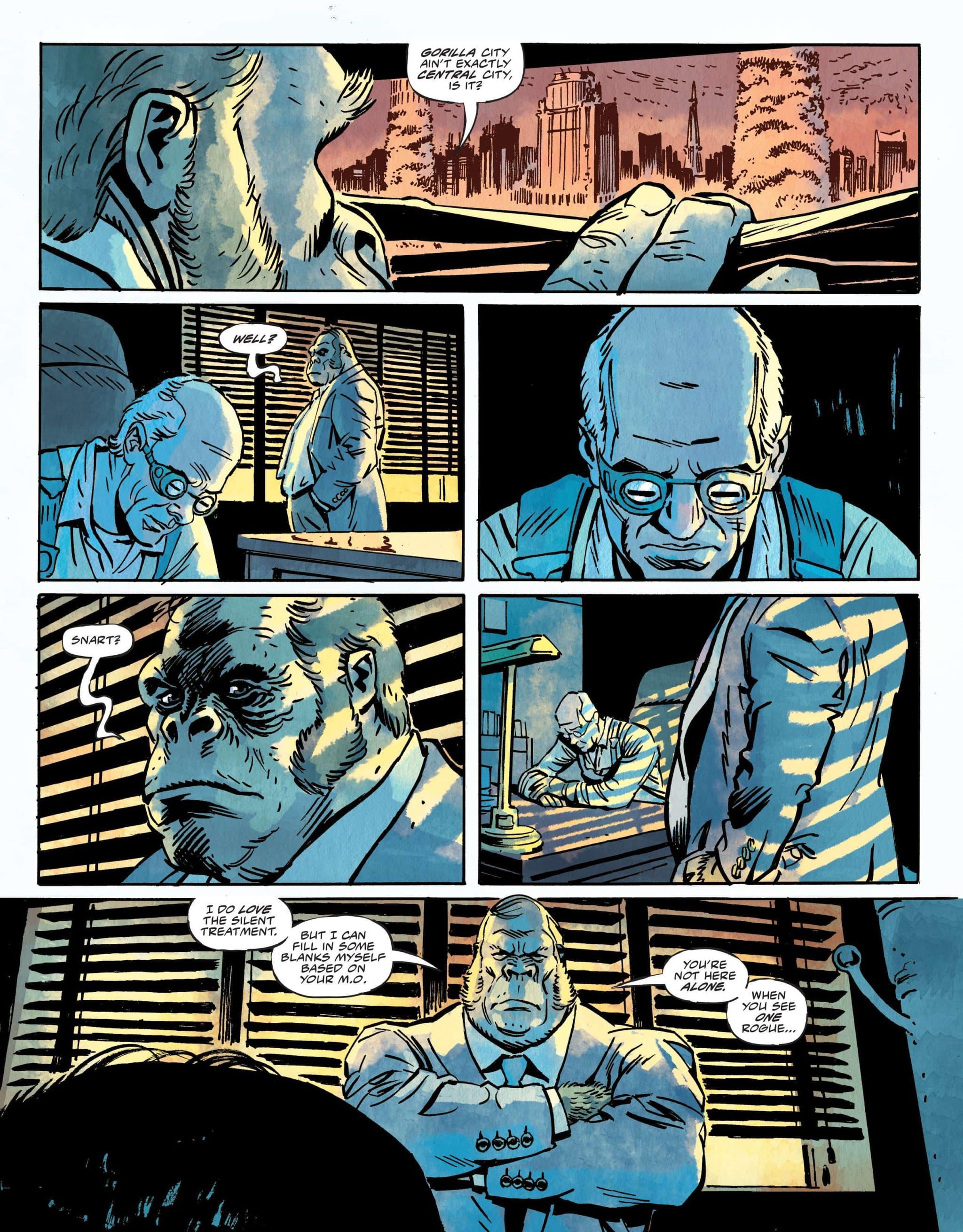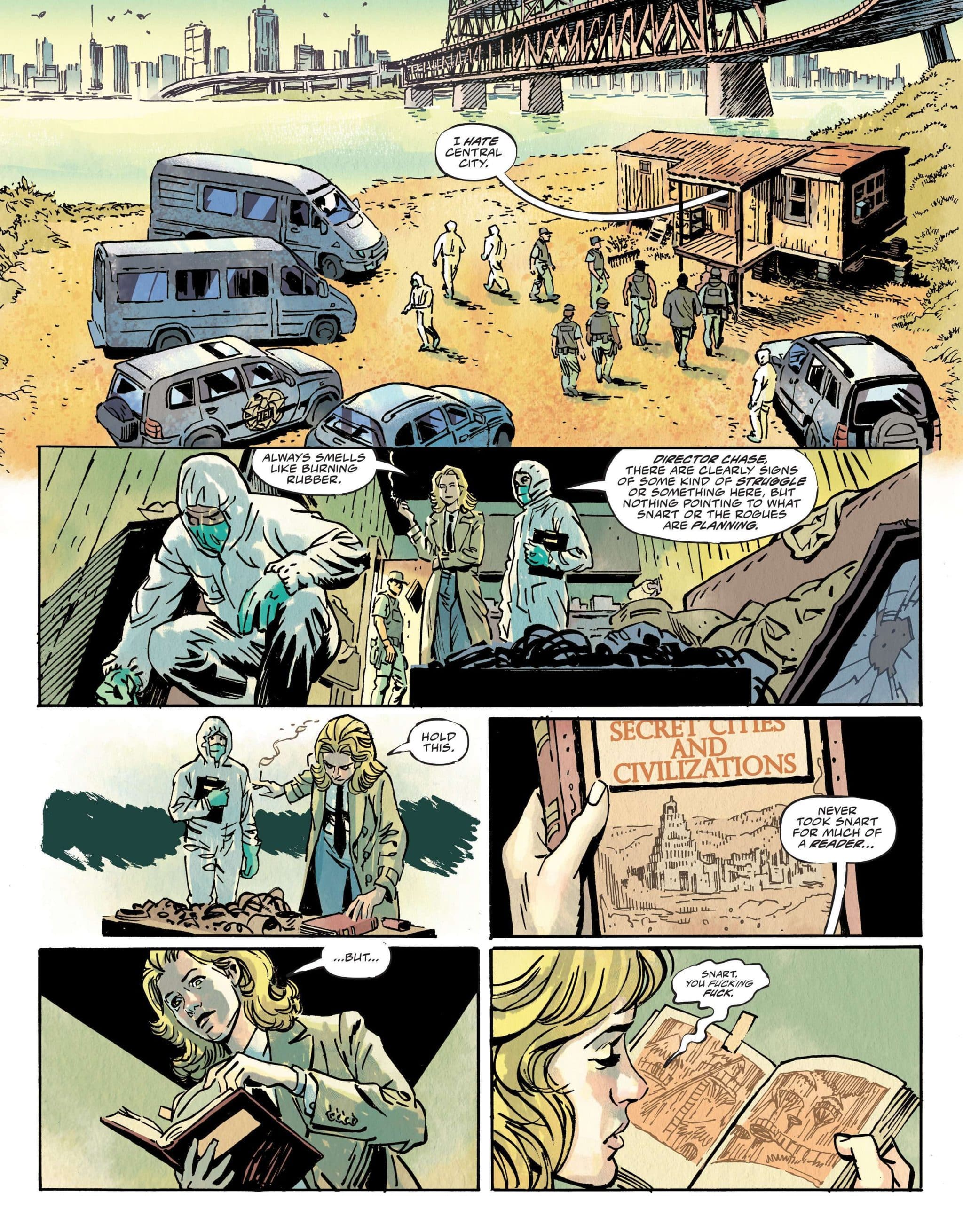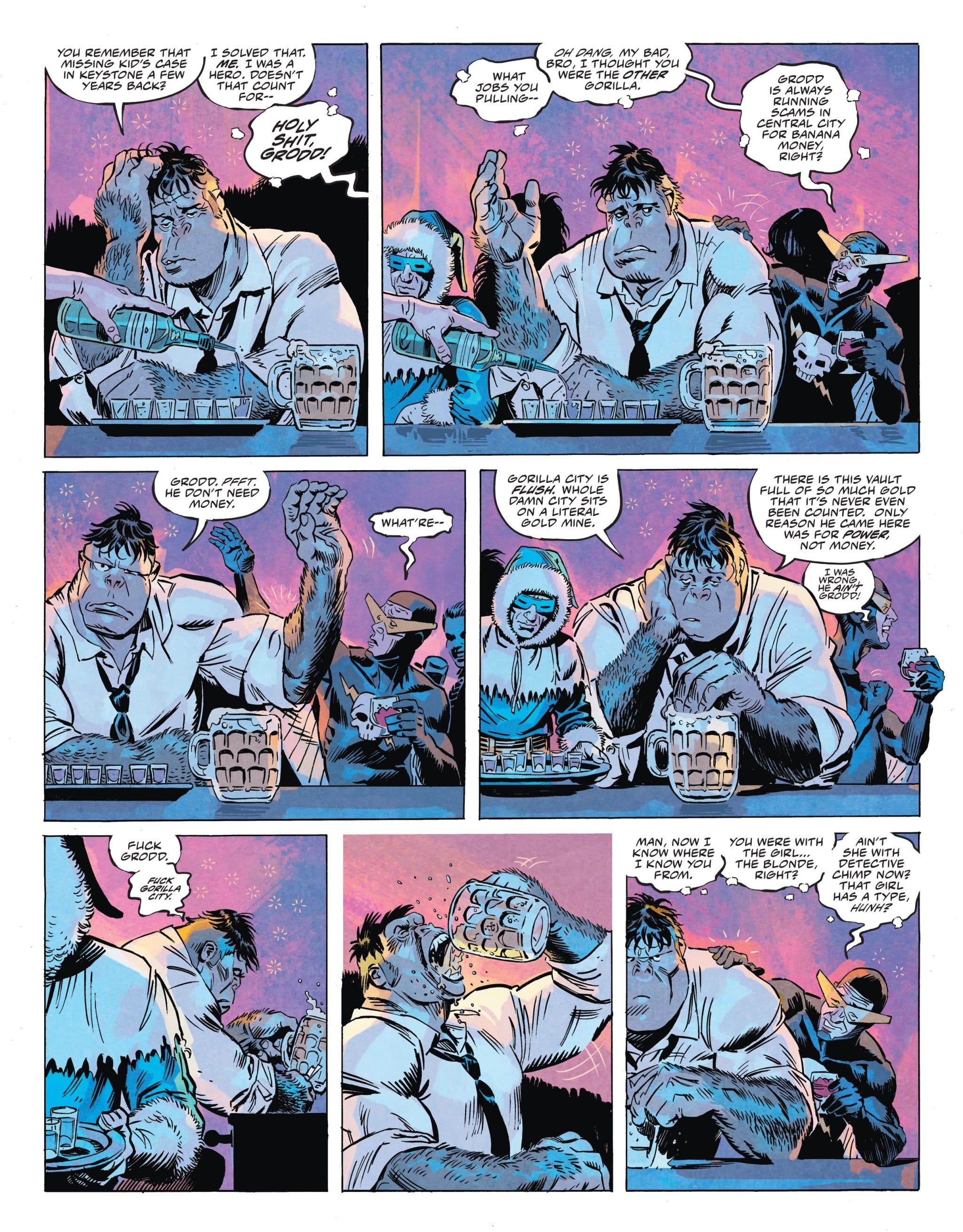 Hassan Otsmane-Elhaou is a very underrated part of Rogues #1 from the opening scene where the ridges on the end of his balloons and the little bubbles show that the Ape (Of Angel and the Ape fame) is washed out and just wants to pick a fight at the supervillain bar because his girlfriend is dating Detective Chimp. Later, on in the story, Otsmane-Elhaou uses crooked curlicues when Leonard Snart speaks with his supervisors and waits for the other shoe to drop to symbolize him carefully picking his words so he doesn’t end up on his ass. Finally, to match the bustling city streets that Leomacs draws and Joshua Williamson’s dialogue, the lettering is all over the page when Snart begs and pleads for his sister to help him out on his last job even though she’s found fulfilling work as a social worker. Unlike the all-in Mick Rory or the desperate Magenta, it takes some cajoling for Lisa Snart to even have a conversation with her brother, and Leomacs’ body language for her shows that she doesn’t want any more from this interaction. As I mentioned earlier, each Rogue’s reintroduction is a mini-masterclass in different storytelling techniques culminating in a super tense set piece that isn’t the actual heist just yet.