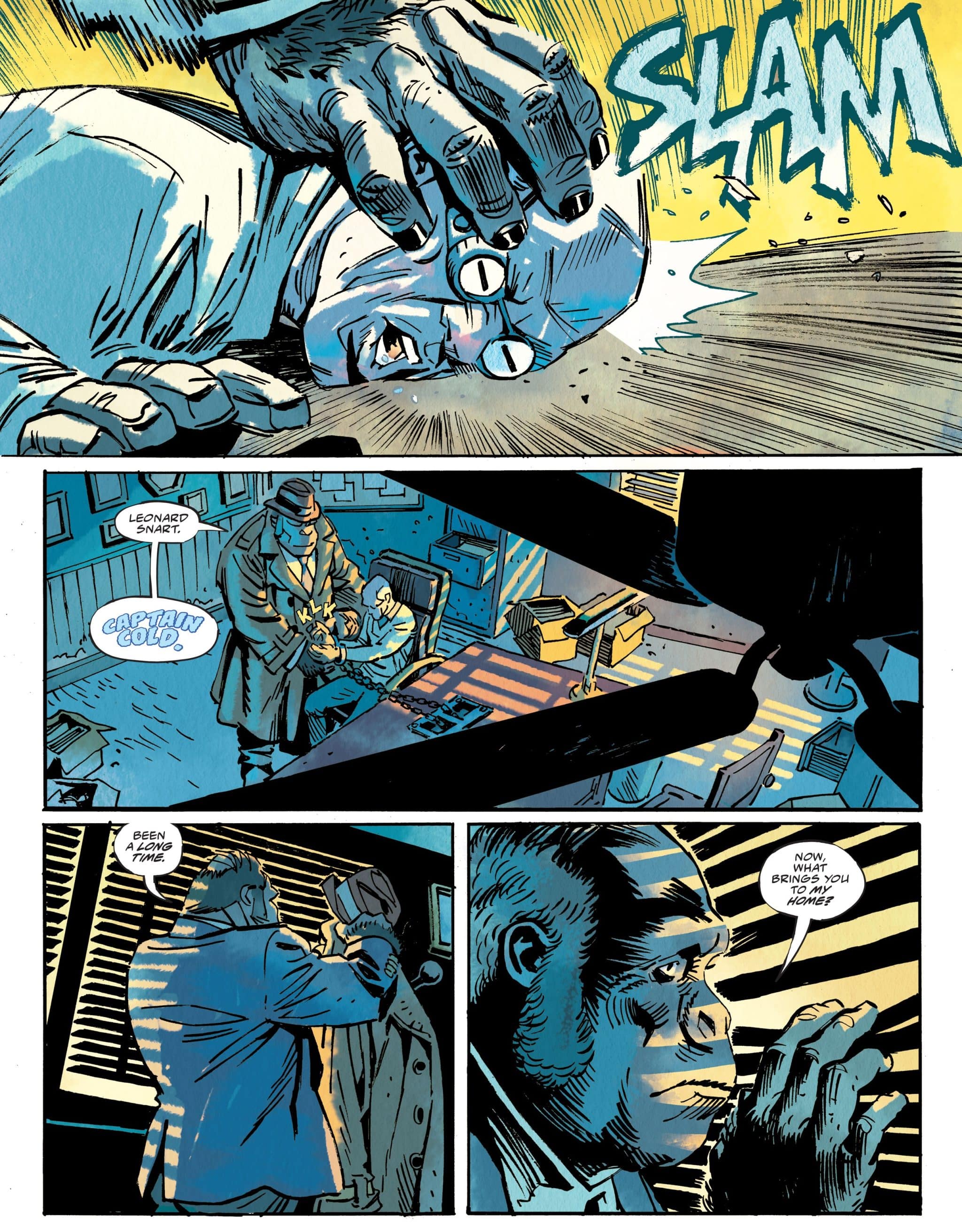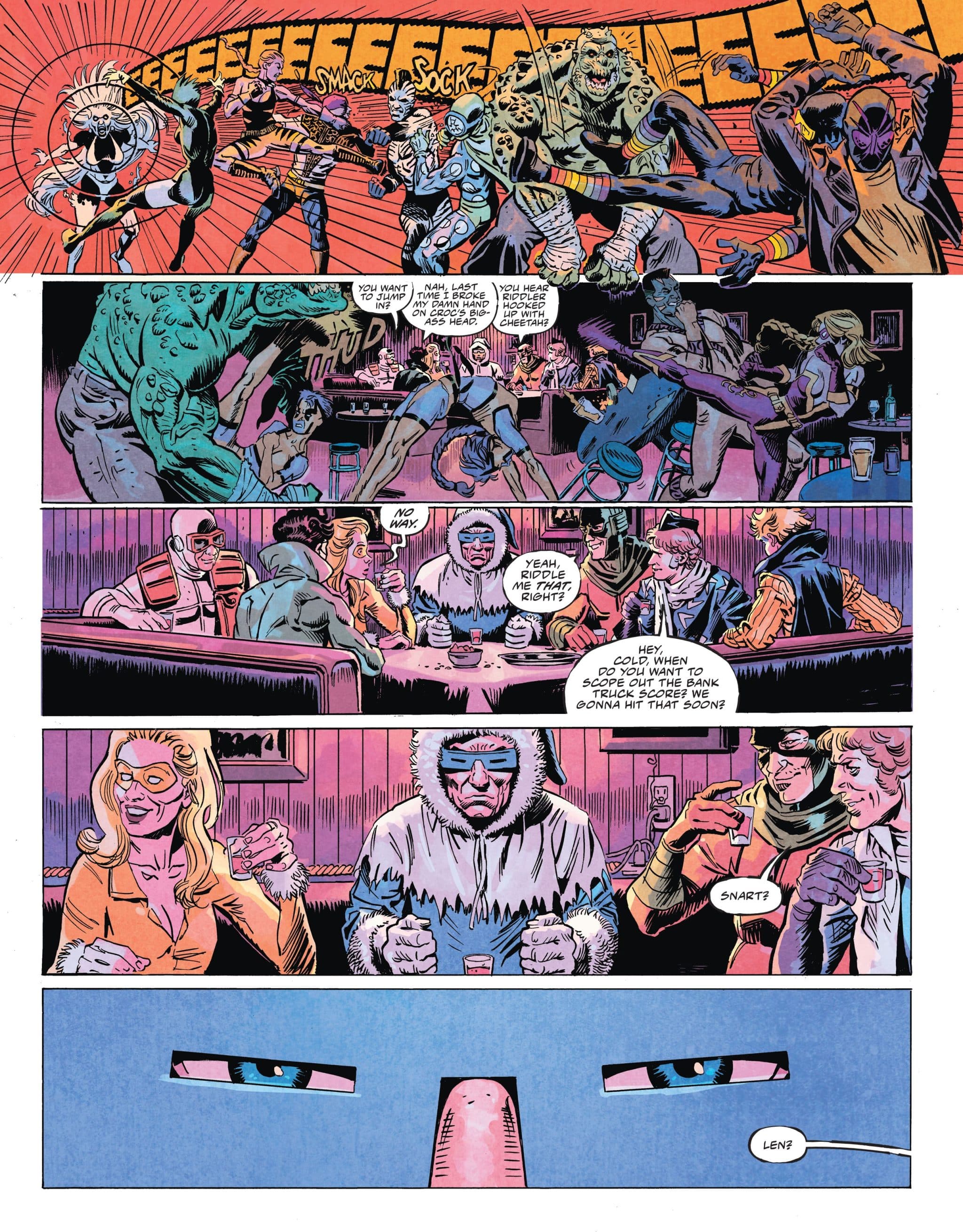 But before setting up the crew, Joshua Williamson and Leomacs spend a decent chunk of Rogues #1 digging into what Leonard Snart’s post-Captain Cold days are like, and it isn’t a pretty sight. Later, in the story, Snart is super manipulative and let’s say definitely gets into “Black Label” territory instead of the usual Rogues’ code of honor so showing him get jerked around by probation officer and the suits at the warehouse he works at help him score major sympathy points. Williamson and Leomacs nail the tedium and pain of modern existence as Snart gets a promotion at work, but finds out it’s because his bosses know that he’ll do whatever they want because he’s an ex-con. Then, he and Leomacs cut to the overcrowded train (Hey, at least, Central City has public transit unlike some American cities.), his old neighborhood getting torn down, and finally, his disorderly apartment. No wonder, he rages out and returns to a life of crime. Lopes’ palette shift from brown to red and finally blue is a story in and of itself, and Leomacs brings out the goggles and blue jacket to show this change when Snart begins to recruit his crew.