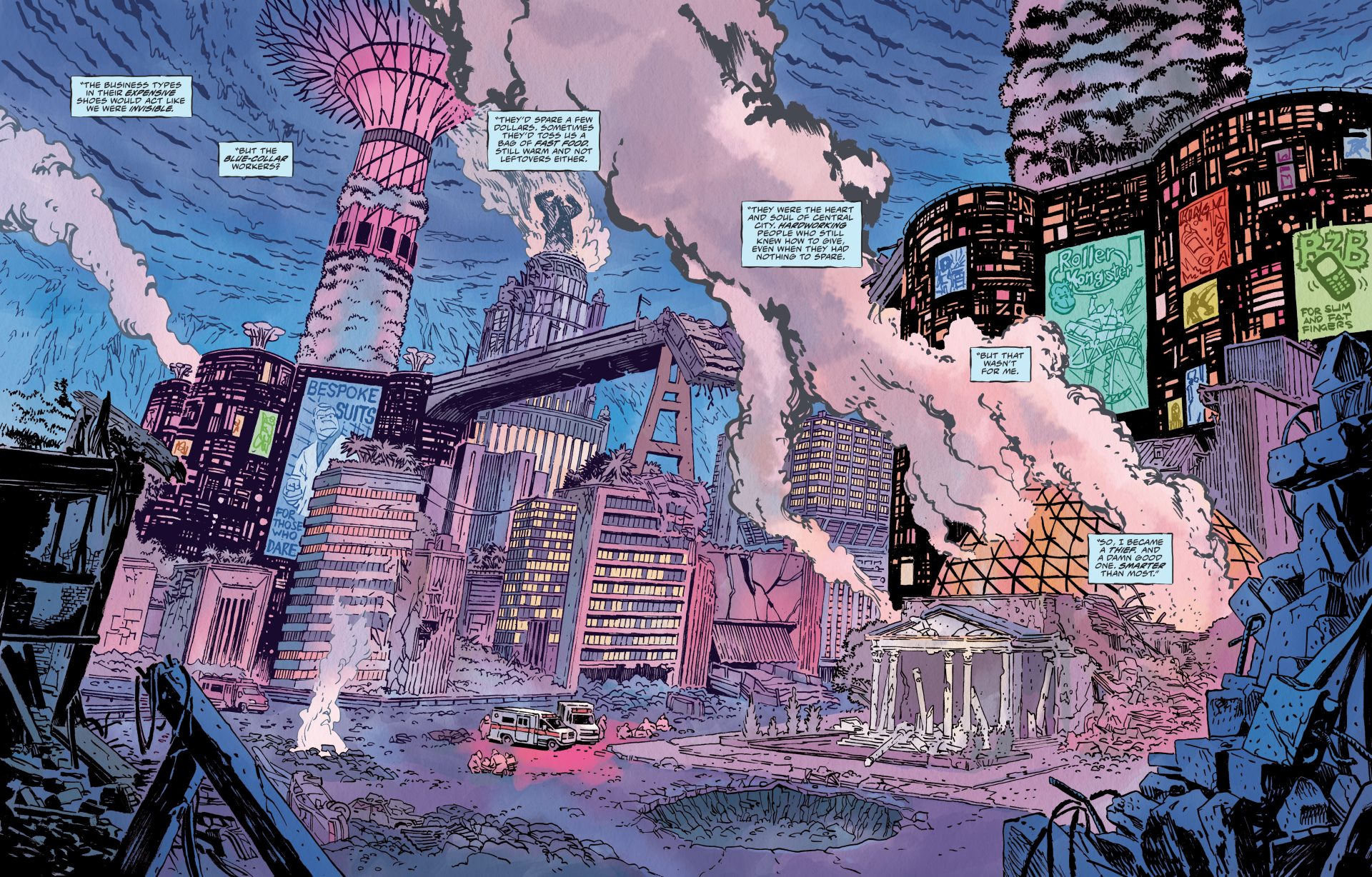 Rogues #1 is a damn fine crime comic by Joshua Williamson, Leomacs, Mat Lopes, and Hassan Otsmane-Elhaou. It follows Leonard Snart, or the artist formerly known as Captain Cold, ten years after his last big score as he struggles to put his life back together in a rapidly gentrifying Central City. Yes, Rogues has timely commentary on the American healthcare system, city life, and capitalism through the lens of aging B-list supervillains. Also, Leomacs and Lopes’ visuals hit that nice sweet spot between super detailed art and cartooning while using silent montages and shifts in color to shift the mood of the story. For example, Snart’s windows turn blue when he gets back to work on his cold gun.