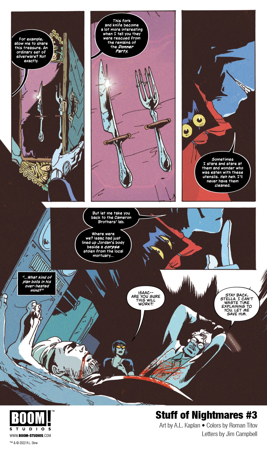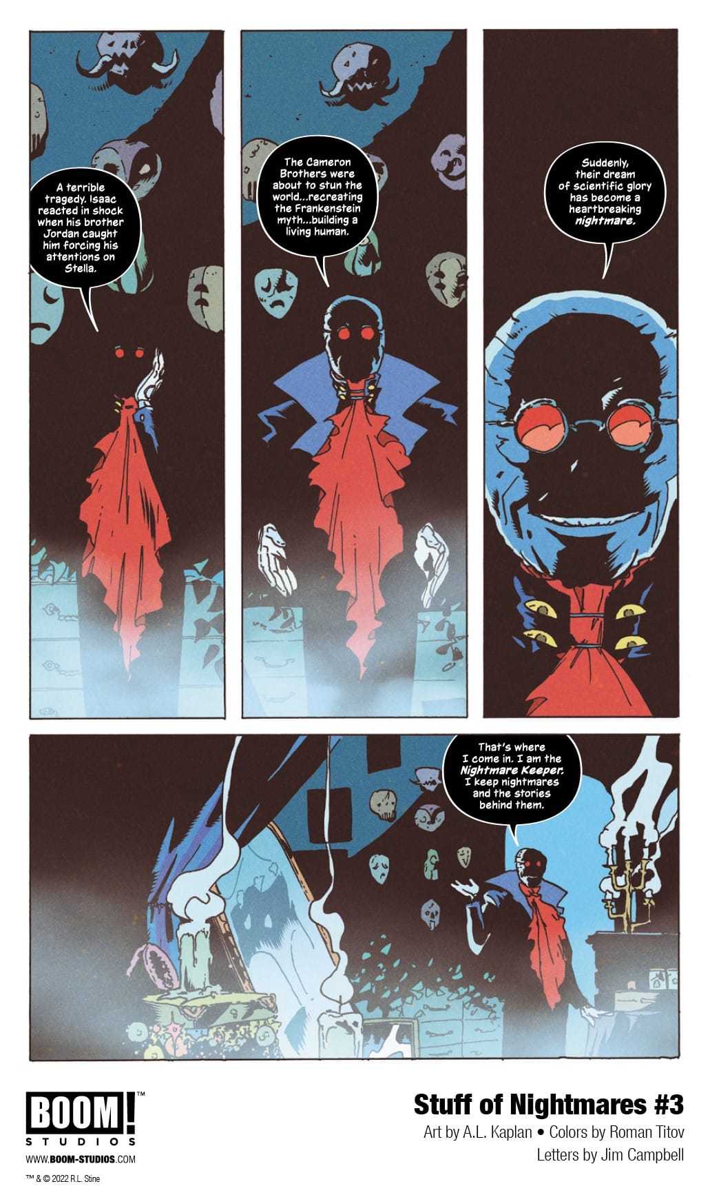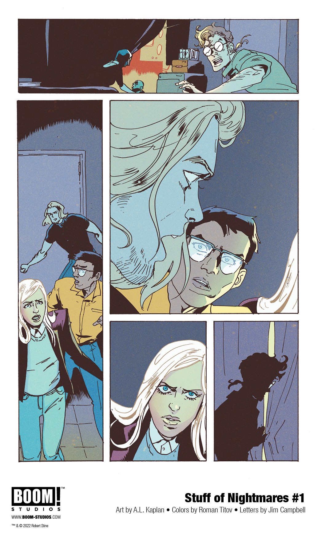BOOM! Studios has revealed a first look at Stuff of Nightmares #1, the premiere issue of a brand new four-issue limited comic book series from R.L Stine with chilling art by A.L. Kaplan, colors by Roman Titov, and letters by Jim Campbell. Available in September 2022.