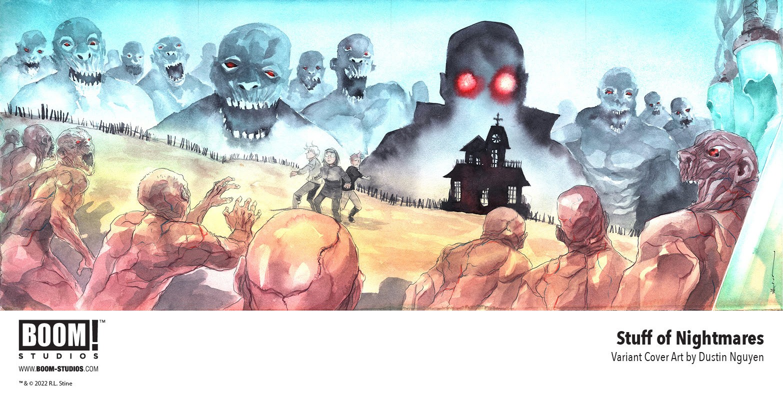 BOOM! Studios has revealed a first look at the connecting variant covers of Stuff of Nightmares #1-4, by legendary illustrator Dustin Nguyen. Stuff of Nightmares is a brand new four-issue limited comic book series from R.L Stine, the legendary author of Fear Street and Goosebumps, who’s back with a chilling new take on iconic creatures from horror legend in his first creator-owned comic book series, with chilling art by A.L. Kaplan, colors by Roman Titov, and letters by Jim Campbell.