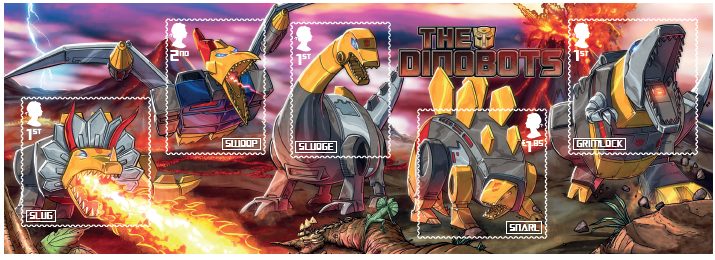 A further five stamps, presented in a miniature sheet, feature the Dinobots; Grimlock; Snarl; Slug; Sludge; and Swoop