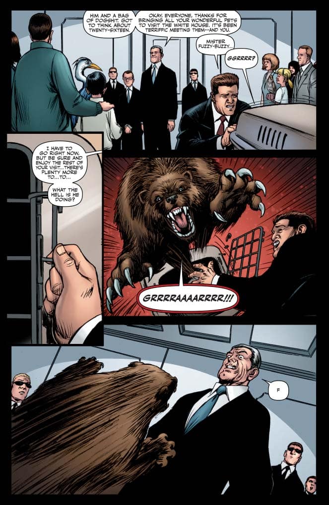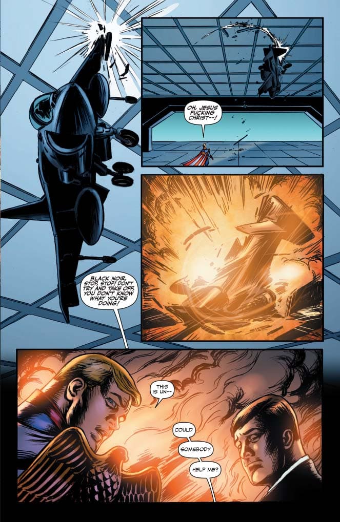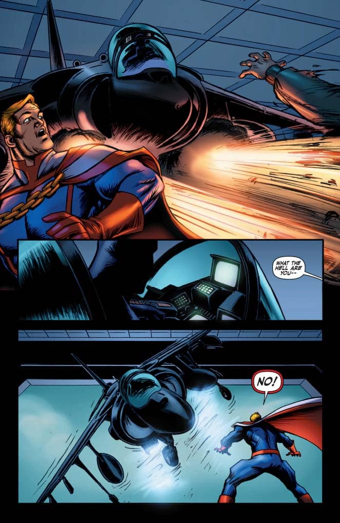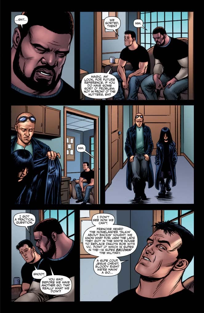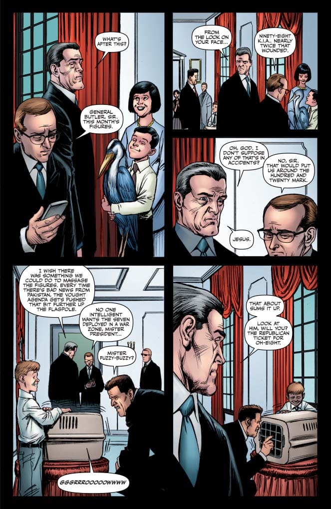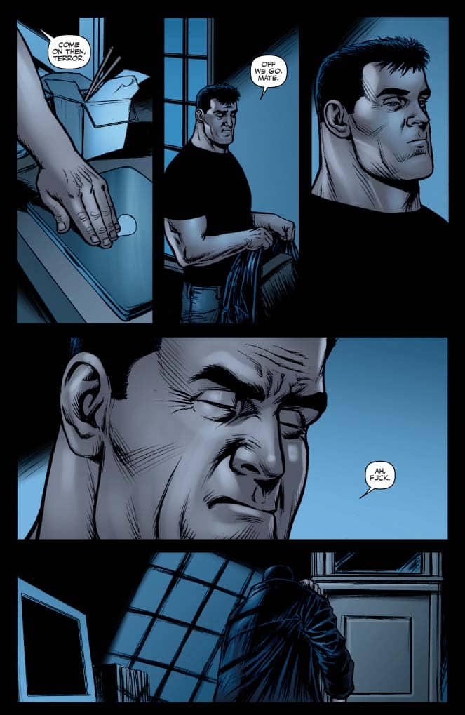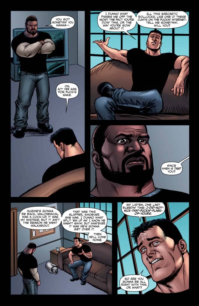 However, to look at the issue and Hughie from another perspective, not giving a shit could definitely be an after effect of the trauma he went through in The Boys. When Ennis and Braun aren’t trying to be edgy, middle-aged white male commentators on society, they do a good job of showing of how Hughie is unable to move on with his life, including several panels of him lying in the bathroom looking at a letter from Butcher that brings his past all the way back. The letters adds depth to the now-dead Butcher, who could take a step back and see that maybe pulling the tongue out of a ten year old copyright-friendly version of Shazam is not a good idea. Braun and Aviña’s art is definitely representative of The Boys’ cartoonish ultraviolence towards superheroes, but Garth Ennis adds an air of conscience in both Butcher’s dialogue and narrative captions that are Hughie reading his letter. He thinks about how the effects of his actions will have both on himself and on Becky and comes across like Wee Hughie when he first joined the team.