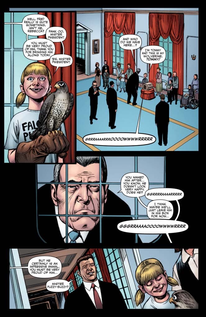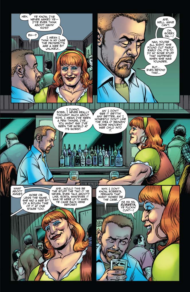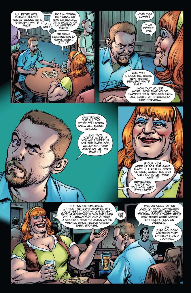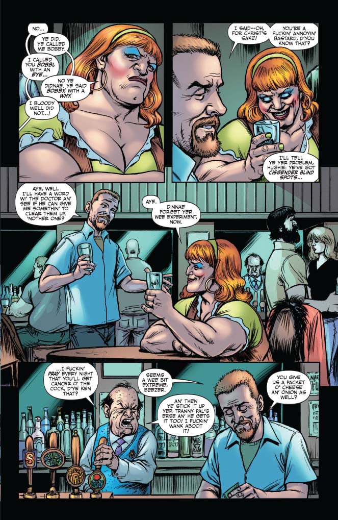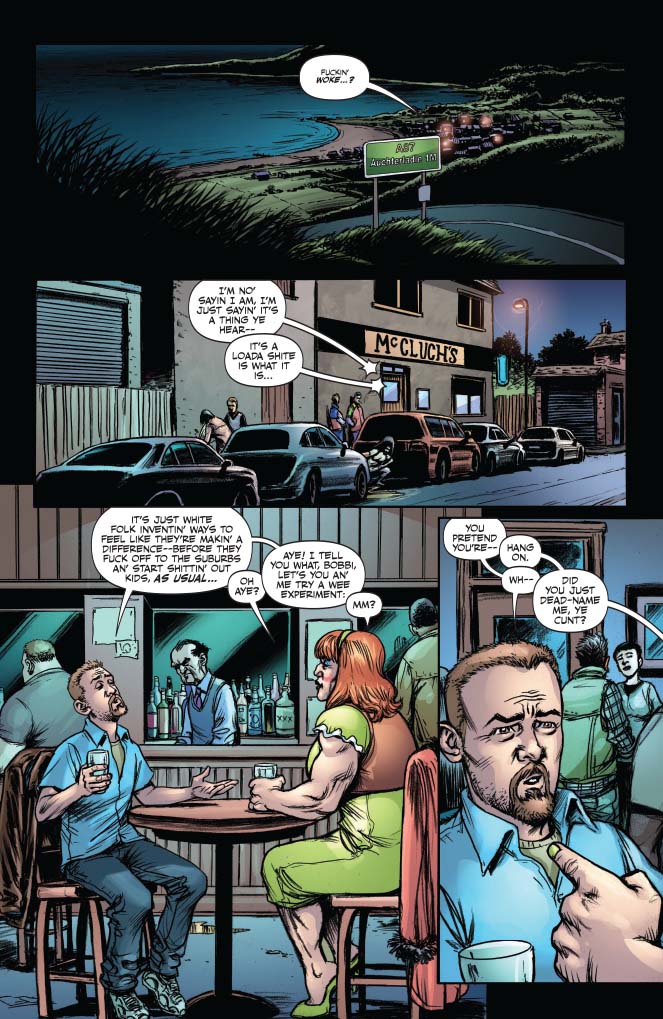 The Boys: Dear Becky #1 is truly a half good, half bad comic. The first half is Wee Hughie moaning at a pub about the state of the world to his friend Bobbi, who is trans and misgendered immediately. Paired with Russ Braun’s stereotypical art that is reminiscent of Howard Chaykin’s recent, hateful work on Divided States of Hysteria, it’s not a great way to start the story. But it is par for the course for the “Everyone’s bastards, especially superheroes.” sensibility of Ennis’ writing on The Boys. It seems like the goal of the pub scene is to reintroduce readers to Wee Hughie and his post-Boys life, but it’s all overwhelmed by tone deaf takes on everything from white male privilege to affirmative action. However, it’s not all punching down with (In true Scottish manner.) Wee Hughie and Bobbi taking the piss out of Brexit with the loss of the E.U. safety net negatively impacting rural Scotland and also wondering why so many of their fellow citizens are afraid of immigrants in such a racially homogenous area.