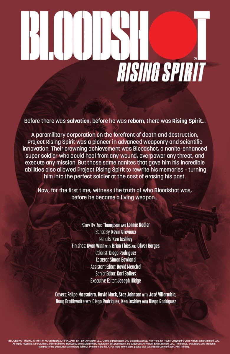 Bloodshot’s handlers have a problem: Their valuable asset isn’t quite the blank slate they’d hoped for and keeps rejecting the false memories they attempt to implant into his mind. Can Project Rising Spirit recoup their losses and produce the perfect supersoldier at last – or is their new prototype at risk of being shelved permanently?