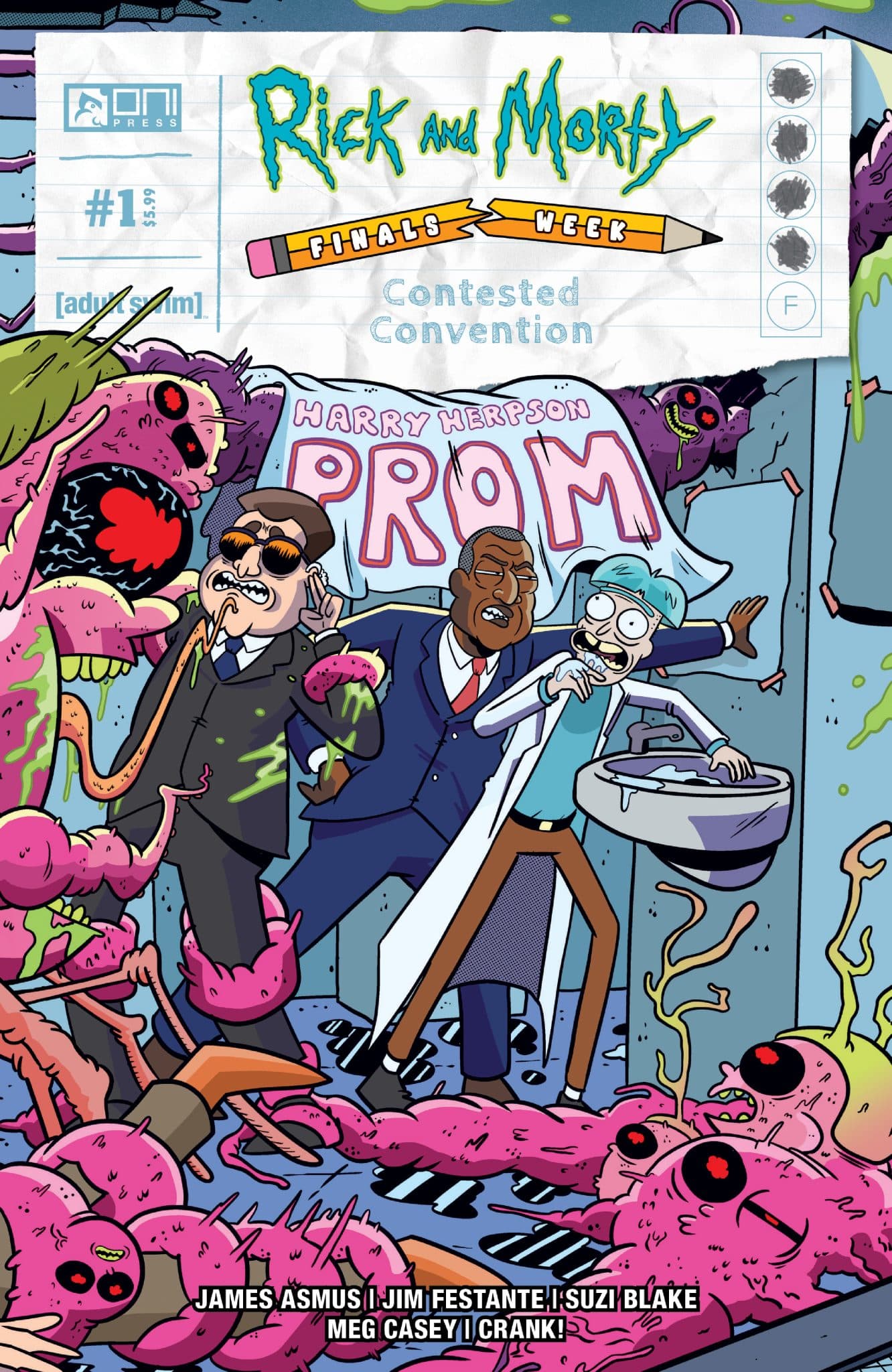 EVERYTHING WE KNOW ABOUT RICK AND MORTY IS ABOUT TO CHANGE FOREVER! The fourth installment of five, interconnected and oversized bi-monthly specials leading up to the most important, unmissable event in Rick and Morty comics history starts here on August 14th in Rick and Morty Finals Week: Contested Convention #1 – from writers James Asmus and Jim Festante and illustrator Suzi Blake! Another day down, another final to (hopefully not) flunk – Morty’s academic reckoning of the wills is about to get wrung through the Omniverse!