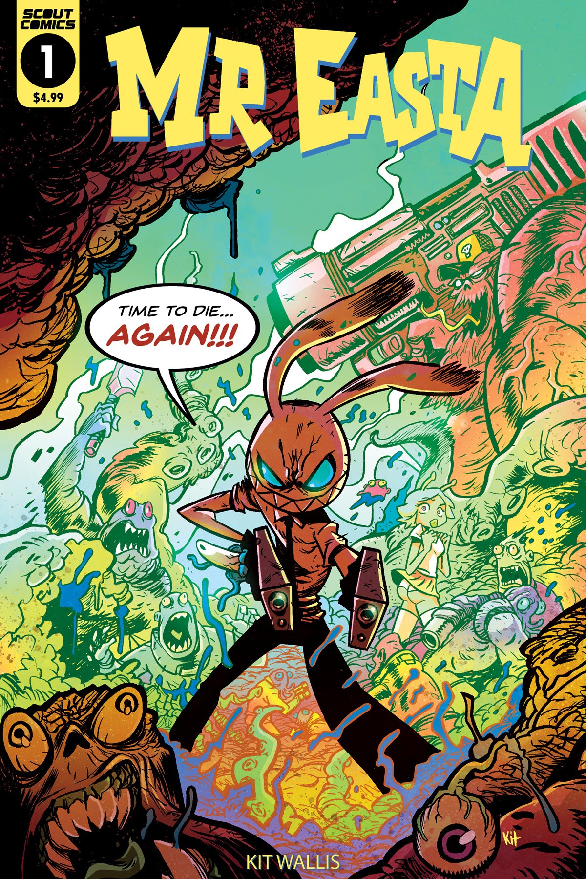 2nd printing! The gloriously demented mind of Kit Wallis brings the galactic adventures of the third best assassin in the universe to Scout Comics! Incredible, kinetically charged artwork blasts the blood, mayhem and quirky humor directly through your brain like a high-caliber bullet. In this issue, it’s Elvis night at an interstellar backwater bar, but with all due respect to the King, that doesn’t stop Mr. Easta. With the help of Frank, his teleportation parasite, who can also transform into any handheld weapon imaginable, it’s business as usual.