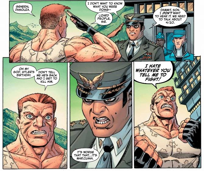 Writers Gerry Duggan and Brian Posehn along with illustrator Scott Koblish set their alternate history in 1980’s America. The President is a cross between Ronald Reagan and Margaret Thatcher that sees in marijuana a poll-raising opportunity to get the country behind her administration. To wage this war, she sends the story’s unlikely hero, Scotch McTiernan (an Arnold Schwarzenegger-type commando that’s all of the 80’s action movies rolled into one) to jumpstart the conflict.