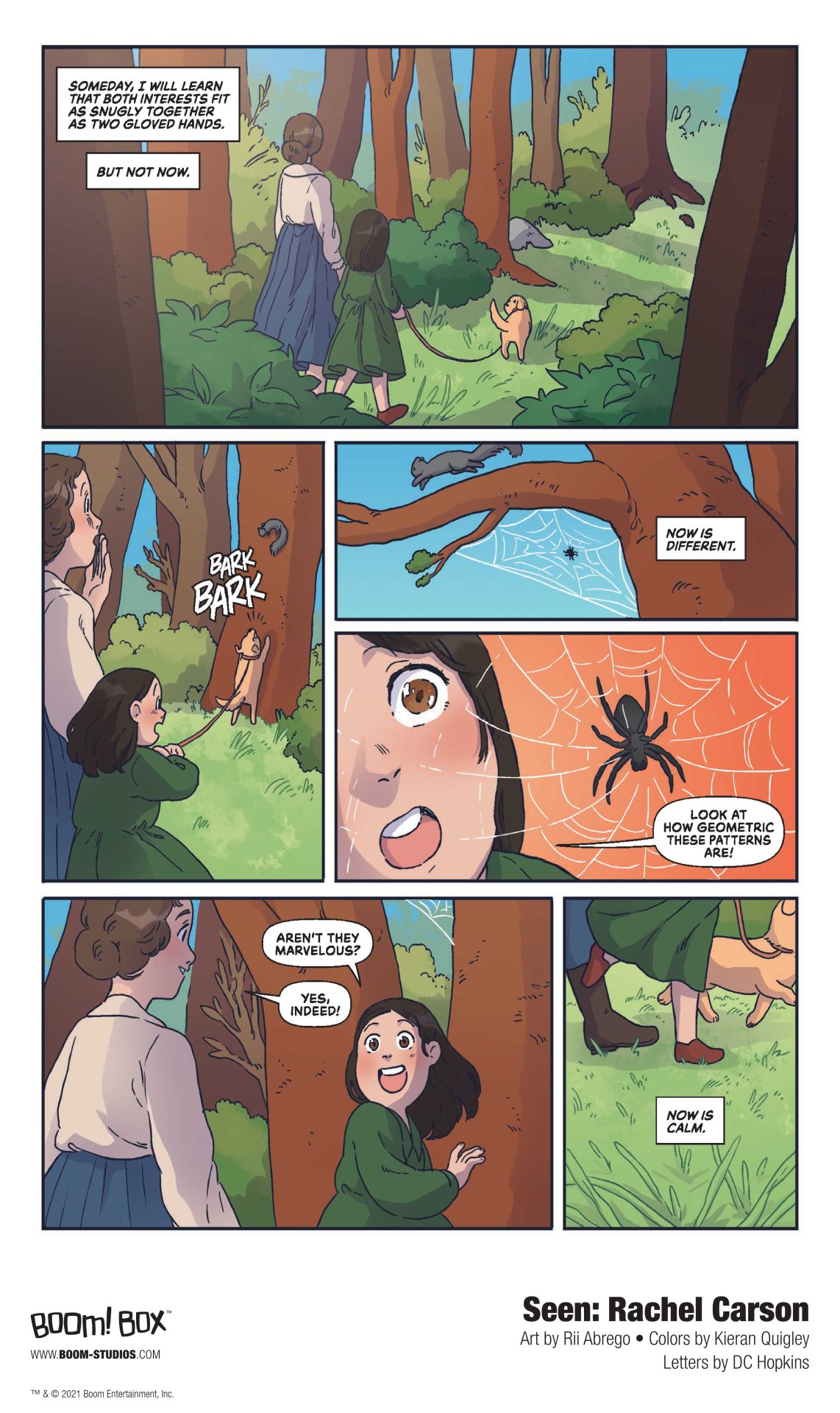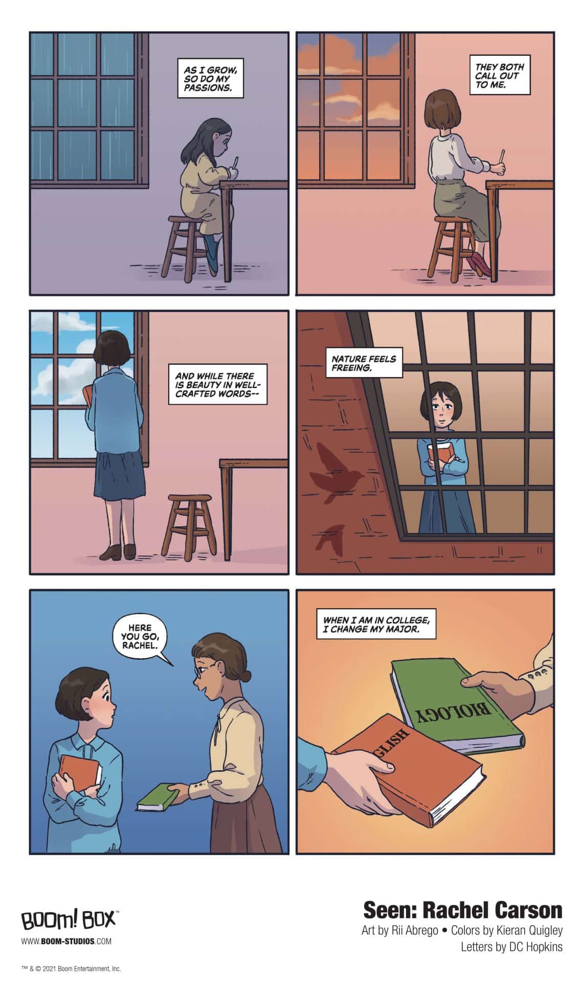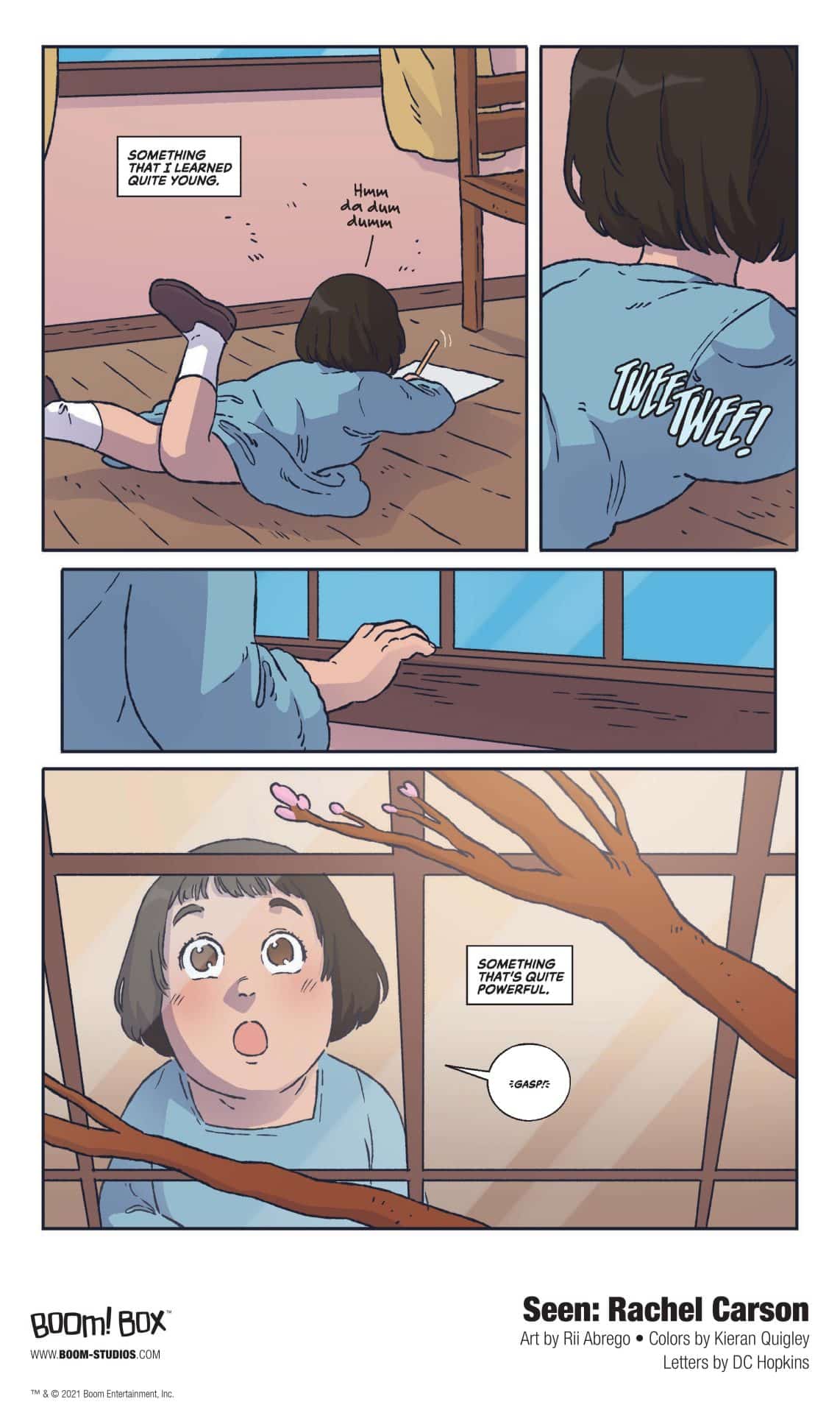 BOOM! Studios has revealed today a first look at Seen: Rachel Carson, a brand new original graphic novel from writer Birdie Willis and artist Rii Abrego in the Seen: True Stories of Marginalized Trailblazers series illuminating the triumphs and struggles of important historical figures who aren’t found in traditional textbooks, but deserve to be remembered for their contributions to humanity and their inarguable strength and courage in the face of impossible odds. They’re the heroes— the inventors, the artists, the activists, and more—whose stories you won’t want to miss.