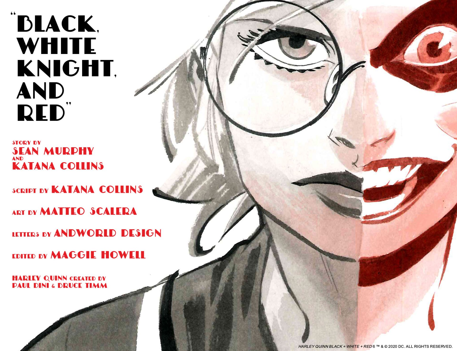 Art is provided by Matteo Scalera and lettering by Andworld Design. I love this art style and the use of colors is fantastic. The “present” is presented in black and white while the past is red and white. The art style is so perfect and is reminiscent of Murphy’s own style though with a bit more of an animated Batman feel to it. There’s a lot of small details throughout that enhance Murphy and Collins’ story. Harley’s facial reaction or what she’s doing as the Joker threatens a guard are all small details that add to the character and deliver her demeanor. There’s a big difference in a character standing and watching a threat versus one jumping around like a small child in the background. One is cold while the other is a bit whimsical. It’s a simple choice but it makes all the difference.