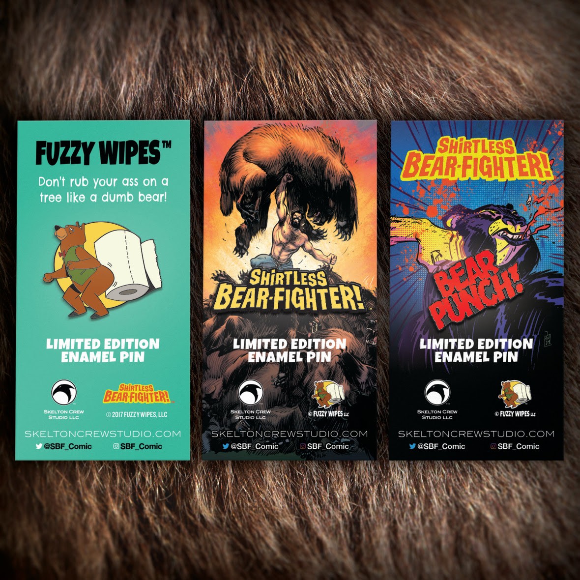 The Shirtless Bear-Fighter Ultimate Rugged Limited Edition Enamel Pin Set features three designs based on artwork in the hit comic Shirtless Bear-Fighter by Jody Leheup, Sebastian Girner, Nil Vendrell, and Mike Spicer, published by Image Comics.