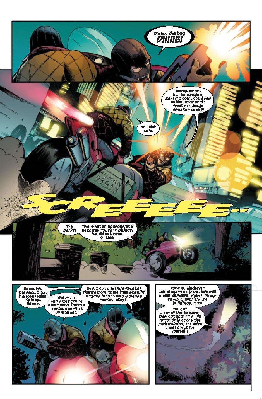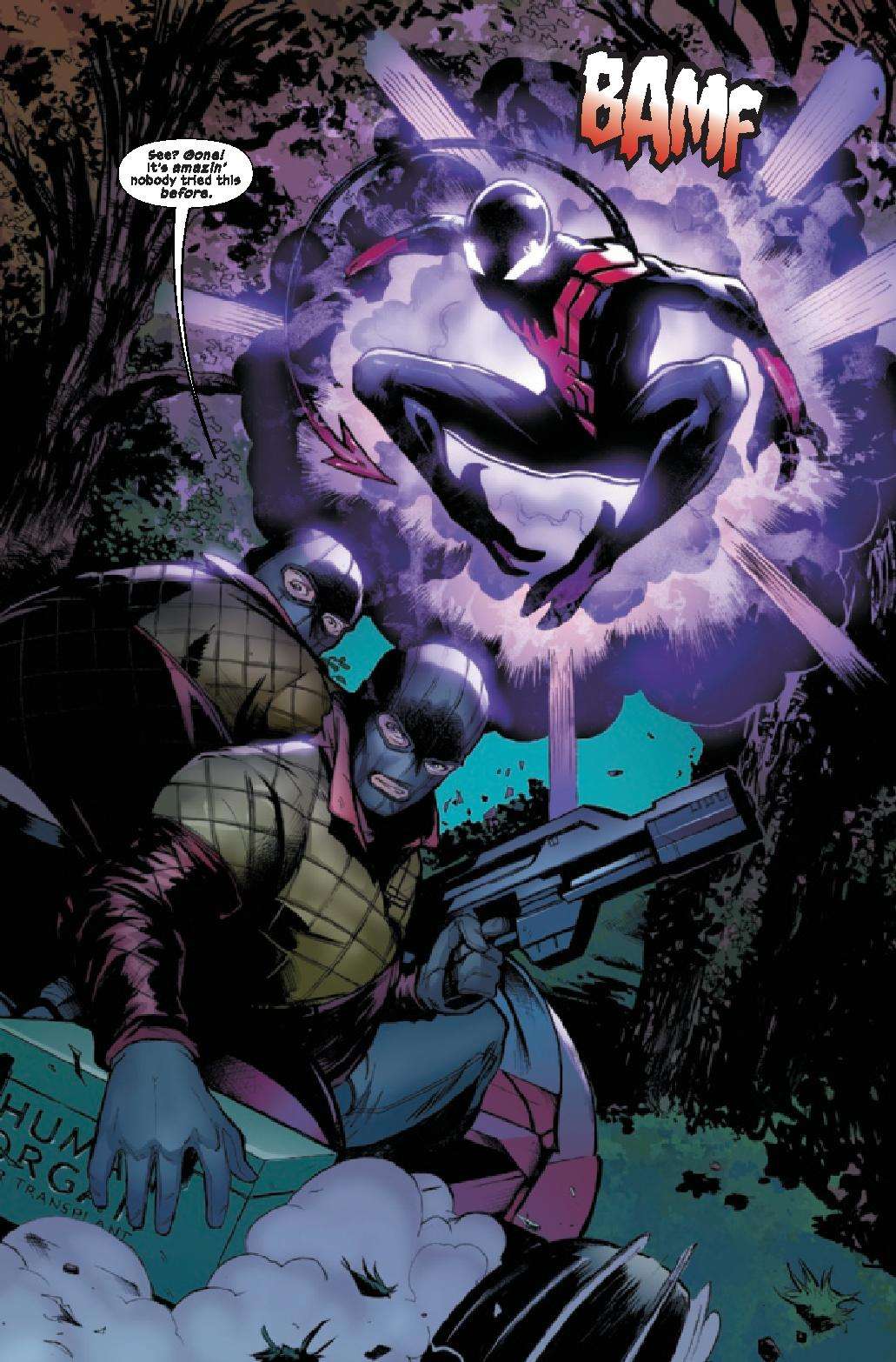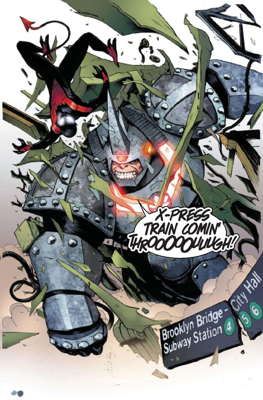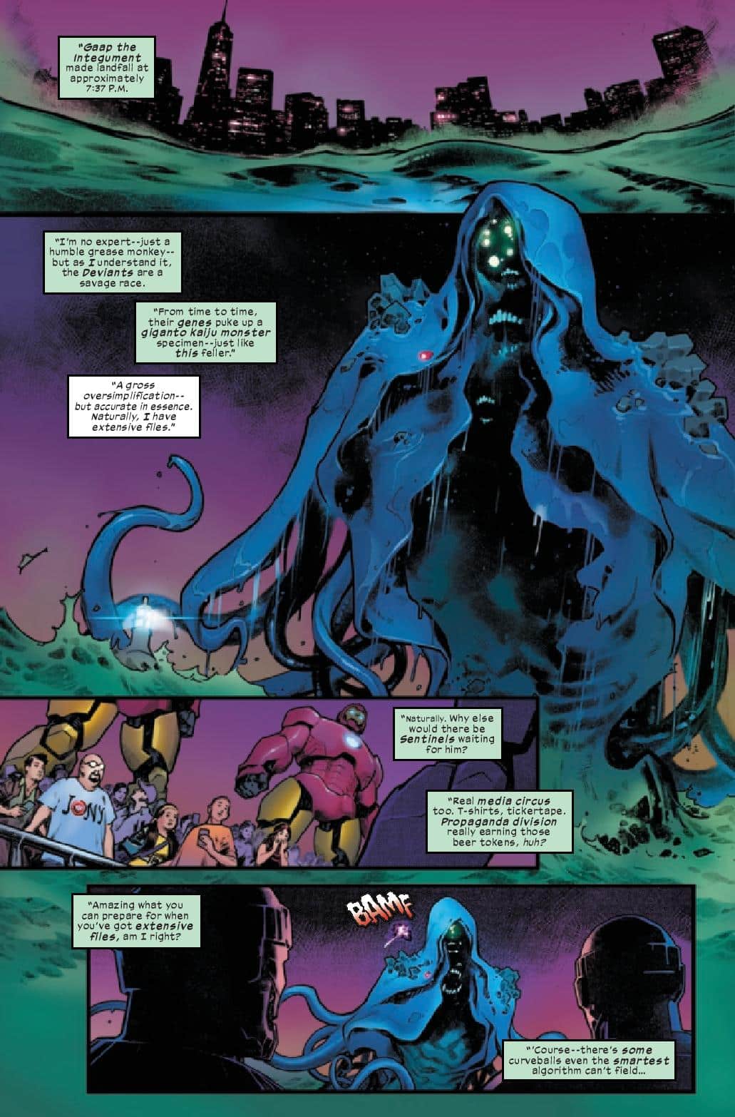 The comic takes us through some adventures of Kurt as he stops bad guys and has run in with Sentinels. It’s all fun action but overall it’s the other moments that really stand out. We get a hurt and still healing Kurt talking to Spider-Man about his current status. The conversation is interesting with real heart and plays off the personalities of the two quite well. But, the negative, is Spurrier’s focus on Kurt the outsider. There’s a focus on his attempt at banter with villains and pizza. The idea of Kurt not knowing pizza all that well feels a bit odd like he’s treated as brand new to New York City and the US as a whole. It just doesn’t feel like something he’d be so surprised about, enjoy like TMNT sure, but there’s a weird focus on it in the comic. But, Spurrier really nail’s Kurt’s playfulness and juxtaposes it with Peter Parker Spider-Man to show that when it comes to other characters donning Spider-Man’s costume, he’s not that odd of a choice.