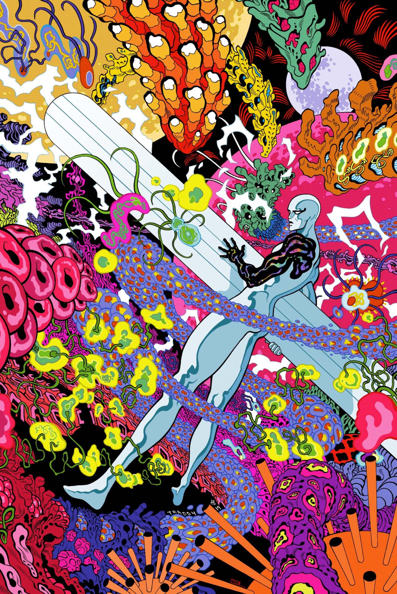 Tradd Moore is one of comics’ best storytellers, and his work on Silver Surfer: Black is among his all-time best. We’re really excited to team up with Tradd and colorist Felipe Sobreiro to release a screenprint of their gorgeous art for the cover of issue 3.