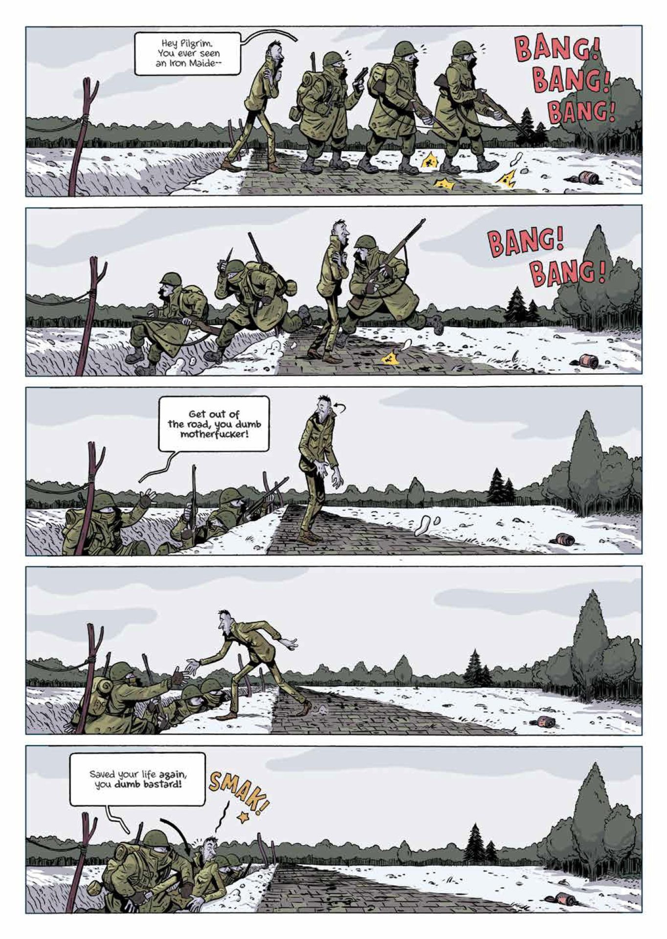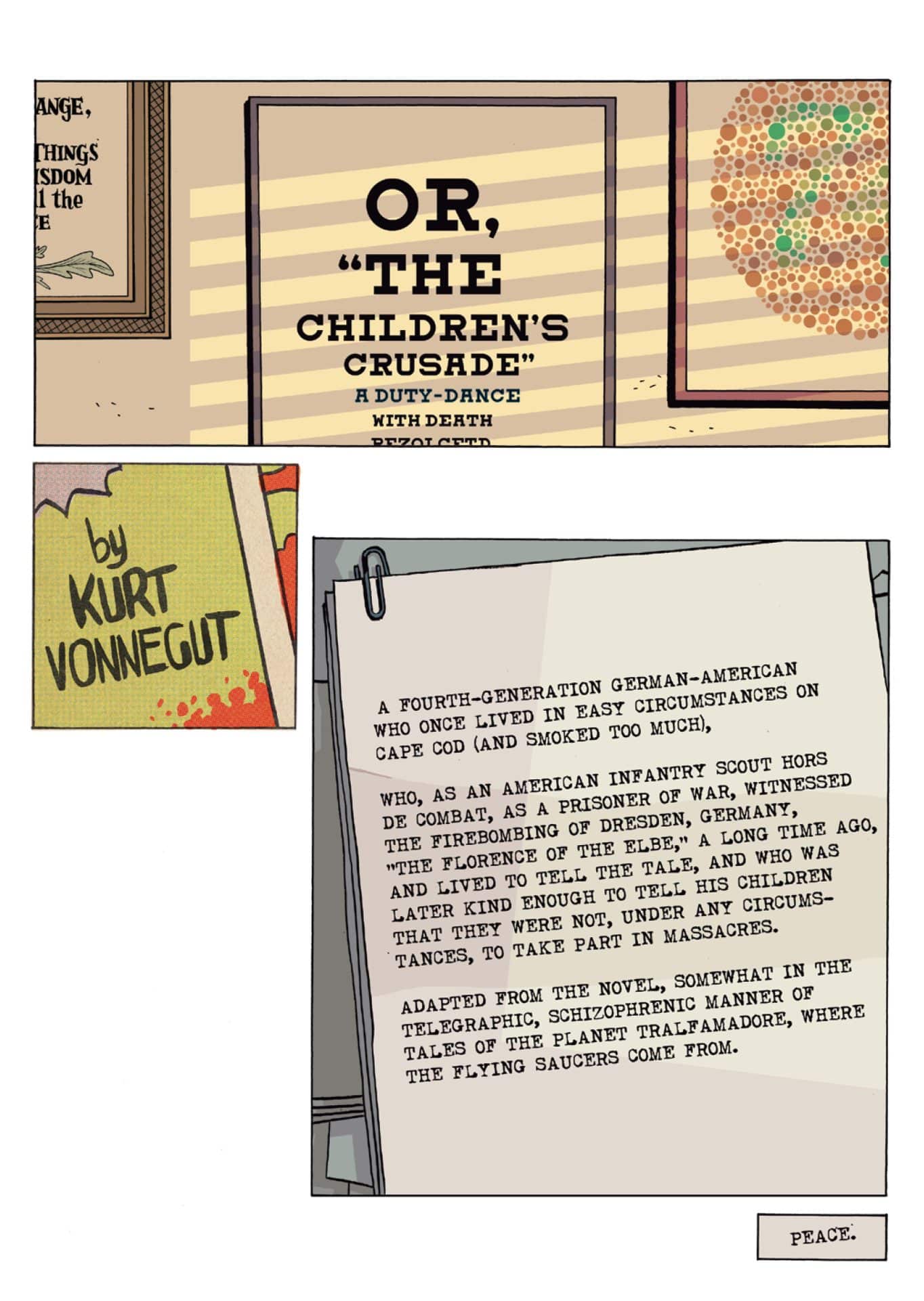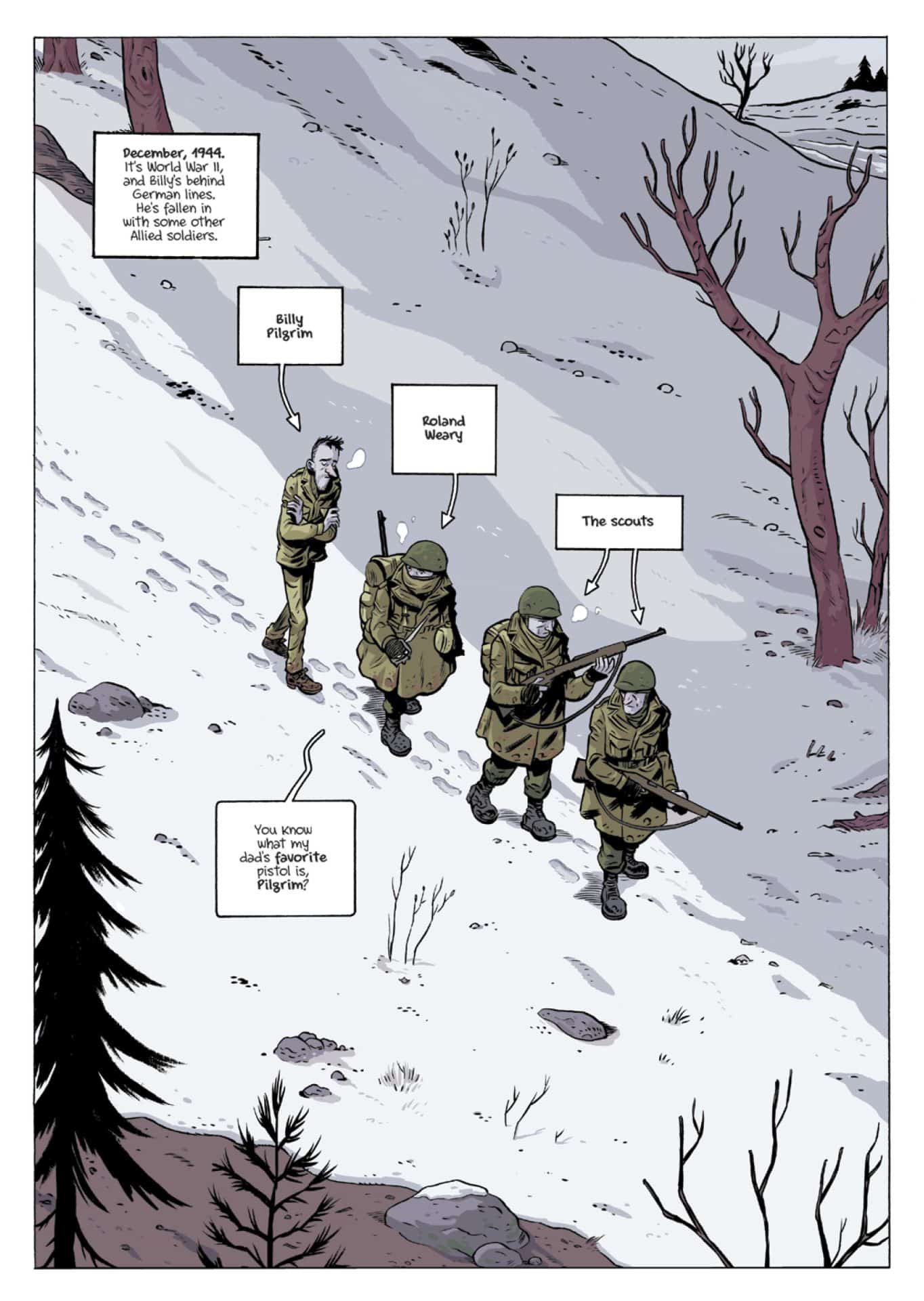 Instead, North provides a bit of his own narration and exposition via text boxes placed throughout the story. In essence, he inserts himself as the narrator. Although these asides occasionally leaned toward humorous, I don’t feel like they added much to the narrative. To be frank, it felt to me like adding lines to a production of Shakespeare. In trying to retell one of Vonnegut’s stories, North effectively cuts him out of the narrative completely, and the representative character out until the very end. There are also some asides during scenes in the German prison camp where North points out Vonnegut (who was actually captured by the Germans during the war). Altogether, I think these asides are meant to mimic Vonnegut’s technique in the novel. Unfortunately, what is a sophisticated meta-textual literary device in Vonnegut’s hands feels more like pandering under North’s.