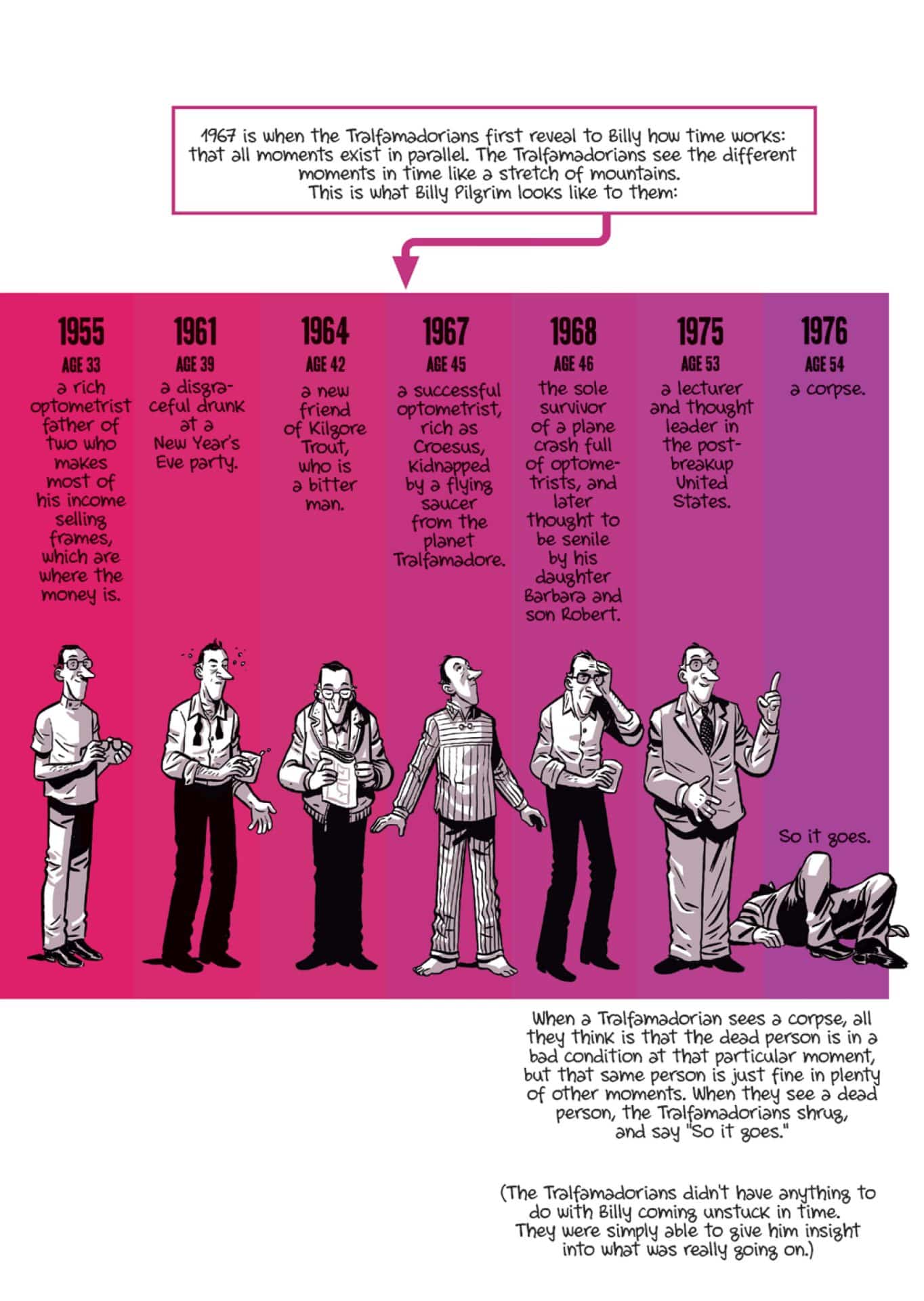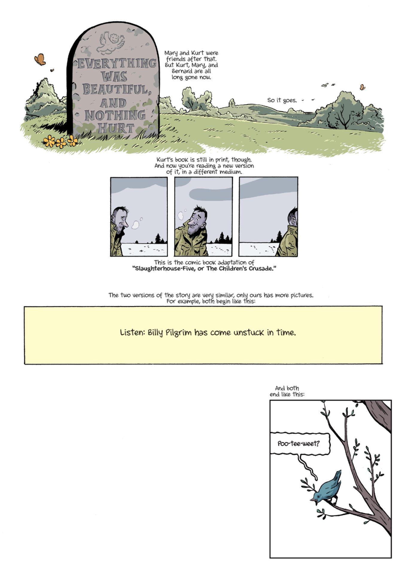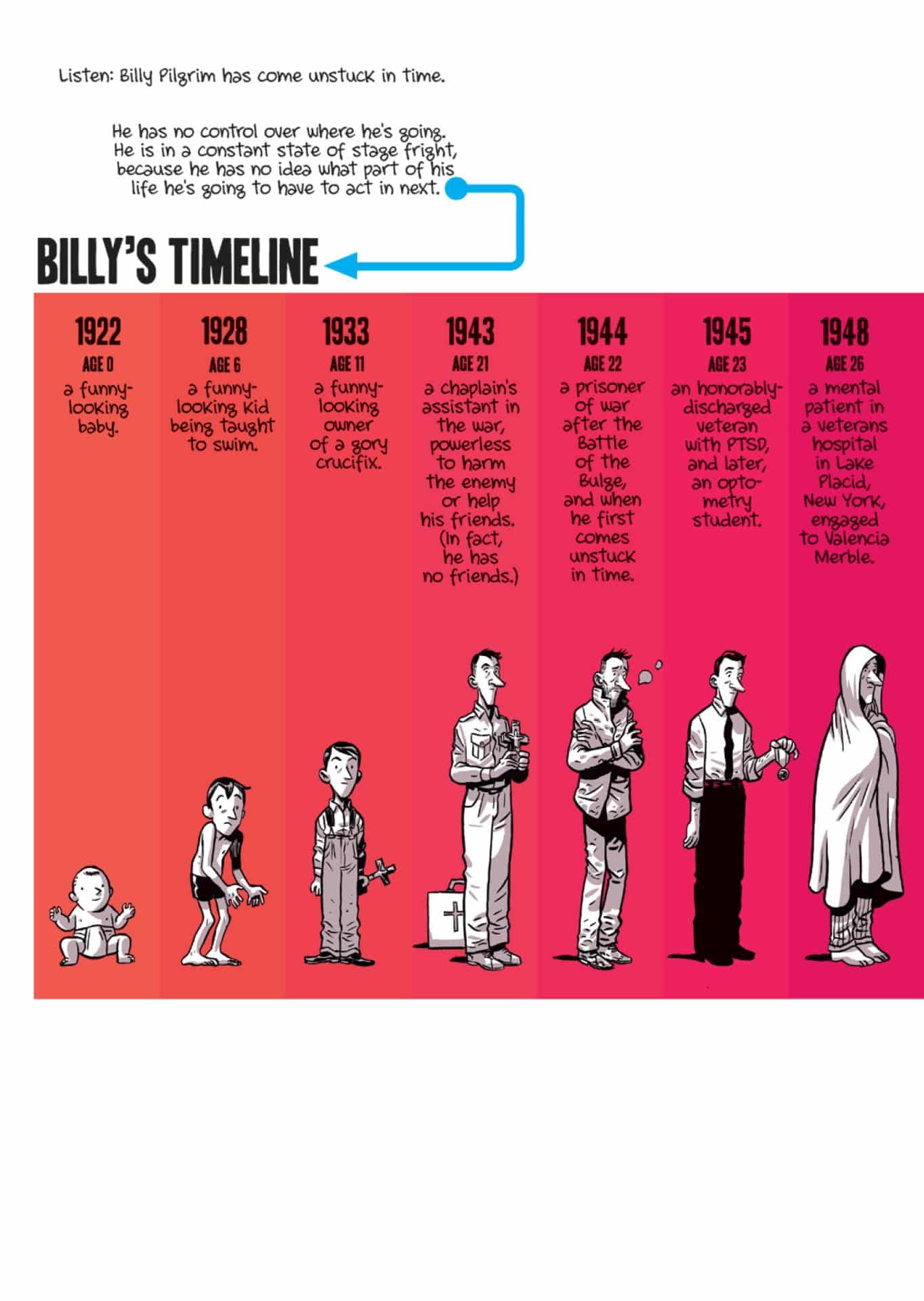 Along those same lines, I could have done without the seven pages of illustrated introduction. If a reader picks up this graphic novel, and has no idea it’s based on a Vonnegut novel, they should be allowed to enjoy it without pretense. North also gives a timeline of Billy Pilgrim’s “journey” through time, which basically amounts to a huge spoiler for a story that hasn’t even started yet. Plus, illustrating this introduction just felt unnecessary. One page of printed introduction, as is common in other graphic novels, would have sufficed. Or the illustrated introduction could have been tacked on to the end. The context it tries to impart would have had more impact after a reader has finished the graphic novel. Place at the beginning, it seemed like a waste of time for fans of Slaughterhouse-5, and wasn’t a good way to engage new readers.