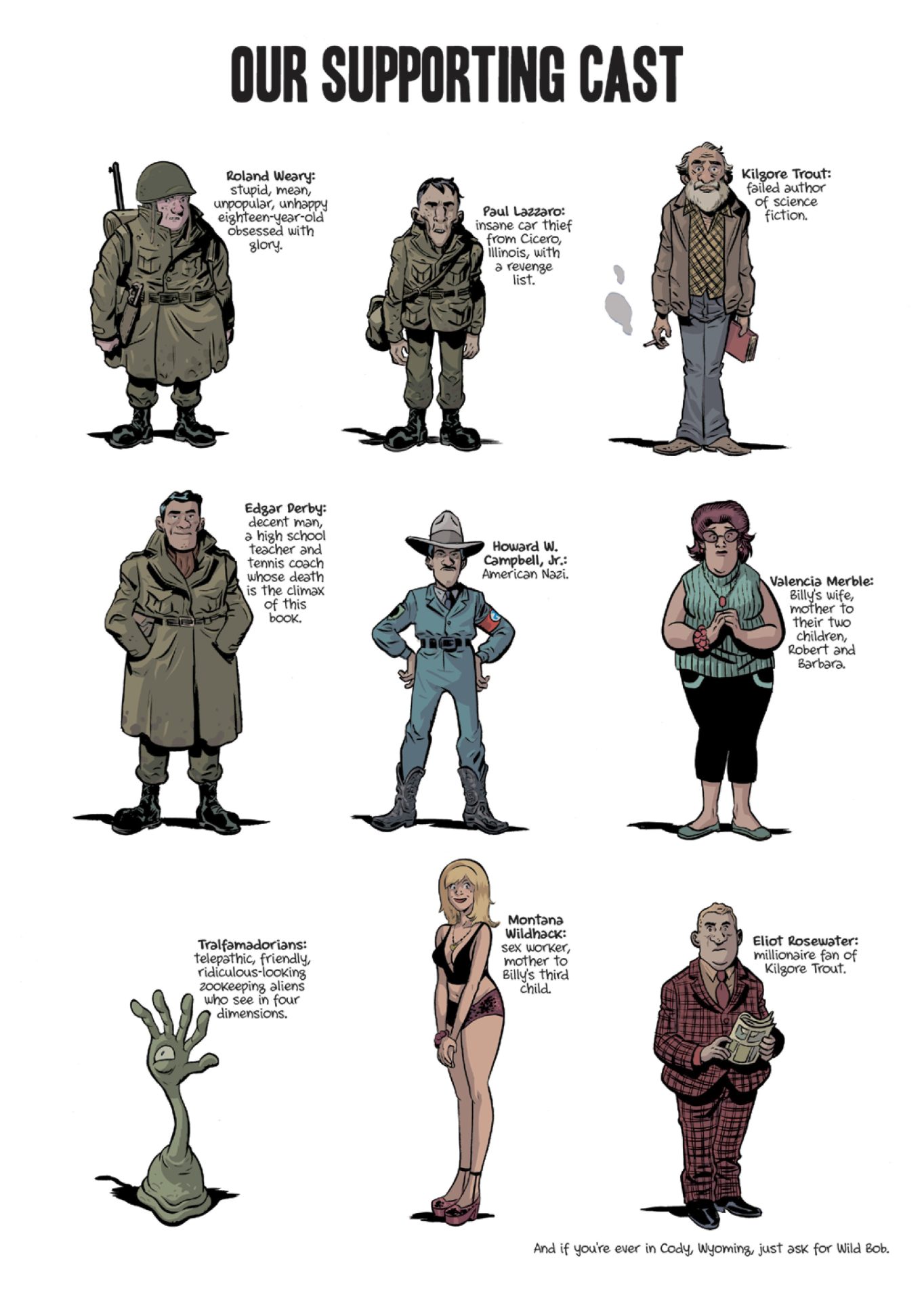 This graphic novel presentation of Slaughterhouse-Five is a great adaptation, but not necessarily a one-hundred percent faithful one. The story and most of the dialogue and text are purely Vonnegut. Unfortunately, North’s artistic liberties and literary additions don’t add to the quality of the story. In my opinion, North’s additions are actually more of a distraction then a quality accompaniment. Monteys’ artwork is a bit uniform despite the varied settings within the story, but all of his illustrations clearly covey the life of Billy Pilgrim to the reader. For those who have never read Slaughterhouse-five, I highly suggest starting with the novel, then checking out this graphic novel adaptation. Fans of Vonnegut’s work will probably want to add this graphic novel to their bookshelves, moreso to add to their collections than for the quality of the product.