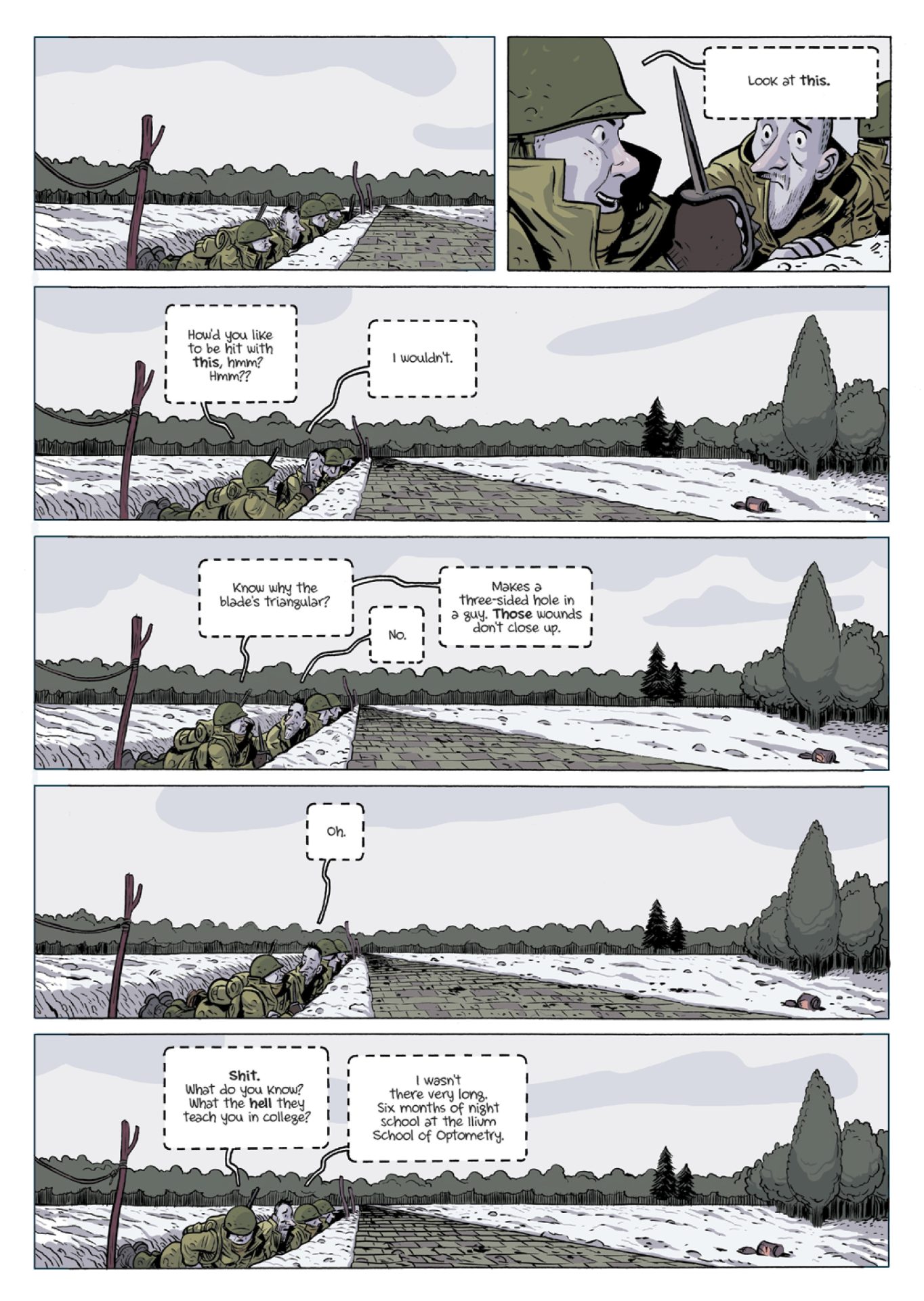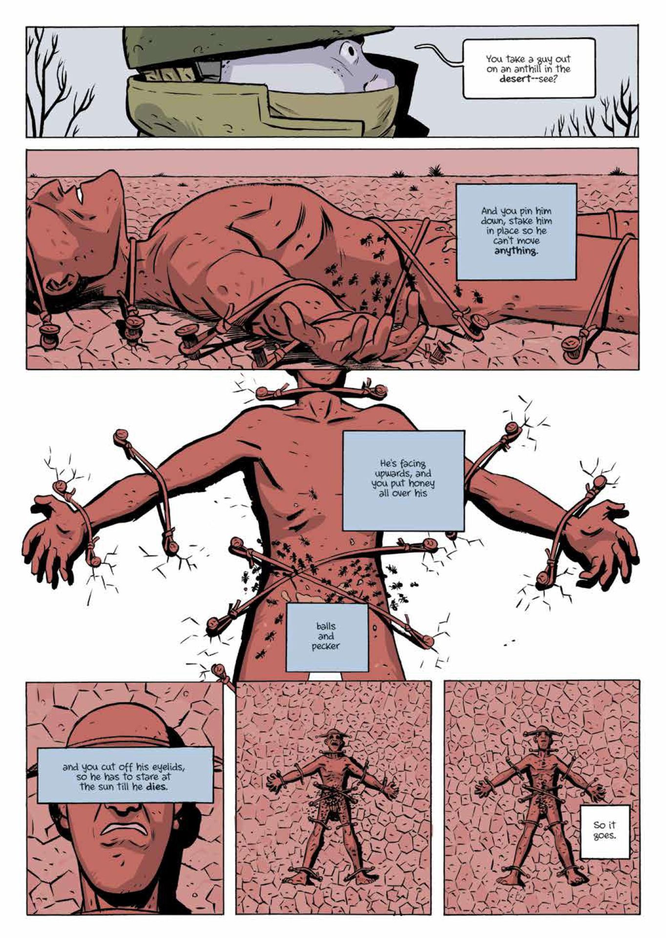 Albert Monteys artwork is but not spectacular. The best way to describe my feelings of the illustrations is with the phrase “missed opportunity.” Slaughterhouse-five offers an artist the chance to draw battlefields, prison camps, flying saucers, an alien zoo, and the ward of a mental institution. Although Monteys renders all these settings well, they all look too similar. His linework rarely changes and the result is the exotic settings have the exact same look as the mundane ones. He does change his style at a few points, producing some cool visual effects, including: several underwater panels where the reader can see the ripples in the water, the scene where Billy Pilgrim watches a documentary on the war is drawn like a storyboard, and the pages of the Tralfamadorian book are appropriately abstract and psychedelic.