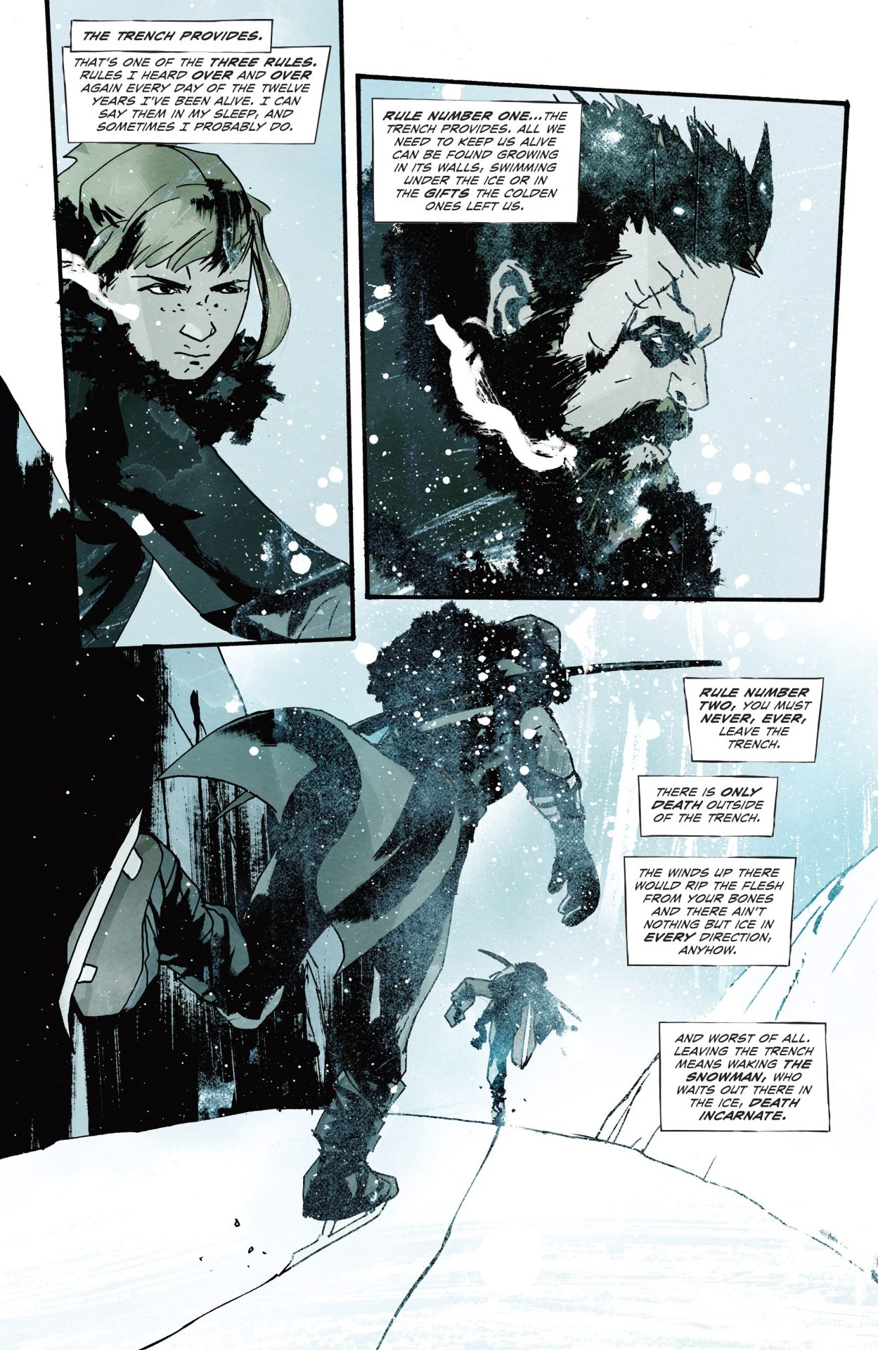 Jock’s art continues to impress, as expected. The world is a white tomb and the art reflects that with a depressed, though not depressing style. The look of terror on the characters as the Snowman hunts, plus its hunting, deliver a tension that builds throughout the scene. It’s a classic horror scene and Jock nails it perfectly. There’s something to the colors as well. With a limitation to blues and whites, the eye focuses on what isn’t. In this case, it’s our trio, the Snowman, and the bodies lying about. It keeps the focus on what matters without distractions and creates greater fear through the feel of emptiness.